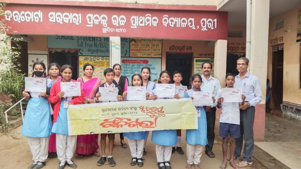 ପୁରୀ:୨୫/୧୧: ସ୍ଥାନୀୟ ଦତ୍ତତୋଟା ସରକାରୀ ପ୍ରକଳ୍ପ ଉଚ୍ଚ ପ୍ରାଥମିକ ବିଦ୍ୟାଳୟର ଷଷ୍ଠ, ସପ୍ତମ ଓ ଅଷ୍ଟମ ଶ୍ରେଣୀର ପିଲାମାନଙ୍କ ମଧ୍ୟରେ ଟିକିତାରା ଭ୍ରାମ୍ୟମାଣ ସାହିତ୍ୟ ସଂସ୍ଥା ପକ୍ଷରୁ ଦେଖିଲେଖ ପ୍ରତିଯୋଗିତା ଅନୁଷ୍ଠିତ ହୋଇଯାଇଛି। ଏହି ପ୍ରତିଯୋଗିତାରେ ଷଷ୍ଠ ଶ୍ରେଣୀରୁ ଶୁଭଶ୍ରୀ ନାୟକ, ସାଇଶ୍ରେୟା ଜେନା, ସର୍ବେଶ୍ଵର ବେହେରା ; ସପ୍ତମ ଶ୍ରେଣୀରୁ ରେକଲା ଅନୁସୂରିୟା, ଆରବ ନାୟକ, ମେହେତାଜ ବାନୋ; ଅଷ୍ଟମ ଶ୍ରେଣୀର ଜାଗୃତି ନାୟକ,