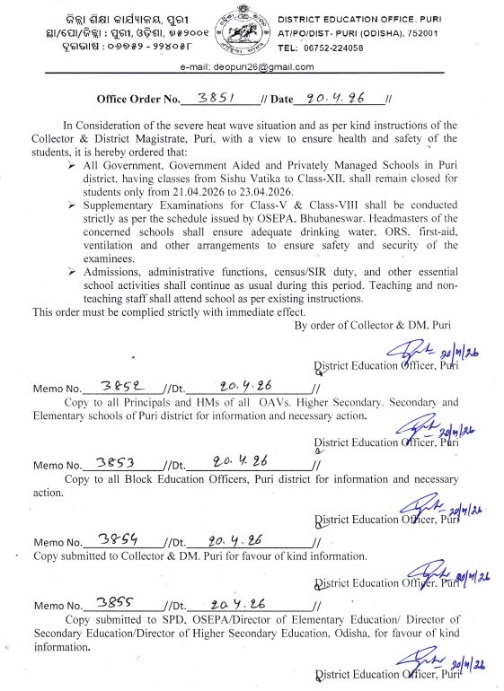 ପୁରୀ ଜିଲ୍ଲାରେ ୩ ଦିନ ସ୍କୁଲ୍‌ ଛୁଟି-ପୁରୀ ଜିଲ୍ଲାରେ ସବୁ ସ୍କୁଲ୍‌ ଆସନ୍ତା ୩ ଦିନ ଛୁଟି ଘୋଷଣା-୩ ଦିନ ପାଇଁ ସବୁ ସରକାରୀ ଓ ବେସରକାରୀ ସ୍କୁଲ ଛୁଟି ଘୋଷଣା-୨୧, ୨୨ ଓ ୨୩ ତାରିଖରେ ସବୁ ସ୍କୁଲ୍‌ ଛୁଟି ପାଇଁ ନିର୍ଦ୍ଦେଶ-ଶିଶୁ ବାଟିକା ଠାରୁ ଦ୍ବାଦଶ ପର୍ଯ୍ୟନ୍ତ ପିଲାଙ୍କ ପାଇଁ ଛୁଟି-ପଞ୍ଚମ, ଅଷ୍ଟମ ସପ୍ଲିମେଣ୍ଟାରୀ ପରୀକ୍ଷା ଜାରି ରହିବ-ଅନ୍ୟାନ୍ୟ ବୋର୍ଡ ଦ୍ବାରା ହେବାକୁ ଥିବା ପରୀକ୍ଷା ମଧ୍ୟ ଚାଲିବ