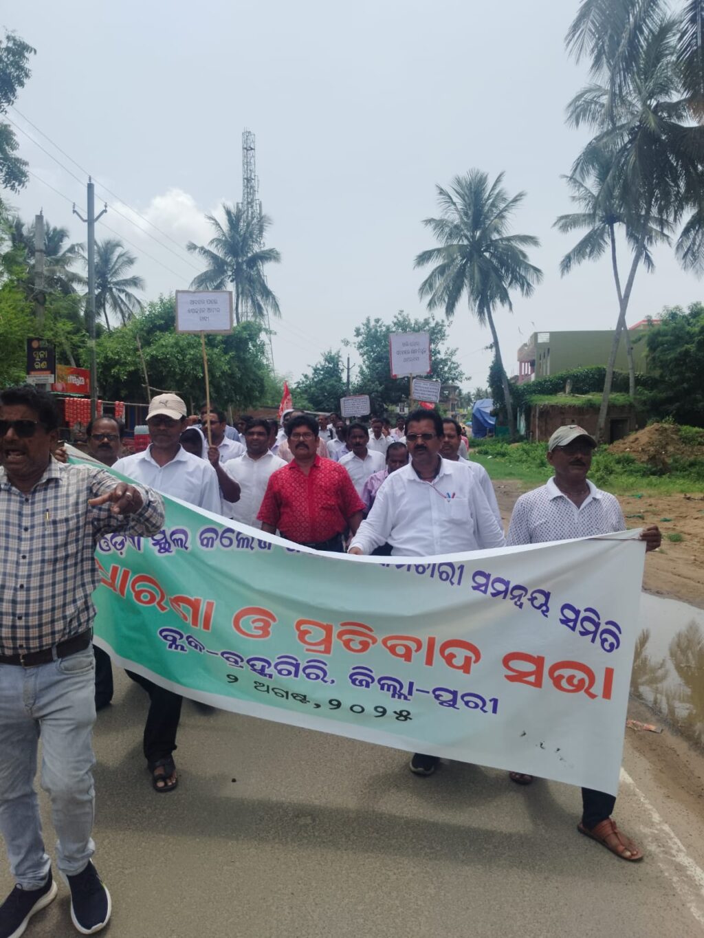 ଓଡିଶା ସ୍କୁଲ କଲେଜ ଶିକ୍ଷକ କର୍ମଚାରୀ ସମନ୍ଵୟ ସମିତିର ଏକ ରାଲି ବ୍ରହ୍ମଗିରି କଲେଜ ଛକରୁ ବାହାରି ବ୍ଲକ ଶିକ୍ଷା ମଣ୍ଡଳାଧୀଶ