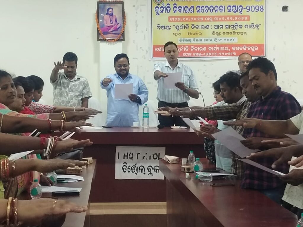 ତିର୍ତ୍ତୋଲ:ଜଗତସିଂହପୁର,,ତା ୩୦.୧୦.୨୦୨୪: ତା ୨୭.୧୦.୨୦୨୪ରିଖ ଠାରୁ ୦୨.୧୧.୨୦୨୪ରିଖ ପର୍ଯ୍ୟନ୍ତ ଜିଲ୍ଲା ରେ ଦୁର୍ନୀତି ନିବାରଣ ସଚେତନତା ସପ୍ତାହ-୨୦୨୫ ପାଳନ କରାଯାଉଛି। ଏହି ପରିପ୍ରେକ୍ଷୀରେ ଆଜି ଜଗତସିଂହପୁର ଜିଲ୍ଲା ର ତିର୍ତ୍ତୋଲ ବ୍ଲକ୍ କାର୍ଯ୍ୟଳୟ ଦୁର୍ନୀତି ନିବାରଣ ସତର୍କତା ସଭା ବିଡ଼ିଓ ଗିରିଜା ଶଙ୍କର ମଲ୍ଲିକ ଙ୍କ ଅଧ୍ୟକ୍ଷତା ରେ ଅନୁଷ୍ଠିତ ହୋଇଯାଇଛି। ଶ୍ରୀ ମଲ୍ଲିକ ଉପସ୍ଥିତ ସମସ୍ତଙ୍କୁ ନିଜ ଆଚରଣ ରେ ସାଧୁତା, ସଚ୍ଚୋଟତା ଆଣିବା ପାଇଁ ପରାମର୍ଶ ଦେଇଥିଲେ। ଏହା ସହ ଉପସ୍ଥିତ ସମସ୍ତେ ଆଭାସି ମାଧ୍ୟମ ରେ ଯୋଡ଼ିହୋଇ ମୁଖ୍ୟମନ୍ତ୍ରୀ ଙ୍କ ରାଜ୍ୟ ସ୍ତରୀୟ ସାଧୁତା ର ଶପଥ ପାଠ ରେ ଯୋଡିହୋଇ ଶପଥ ପାଠ