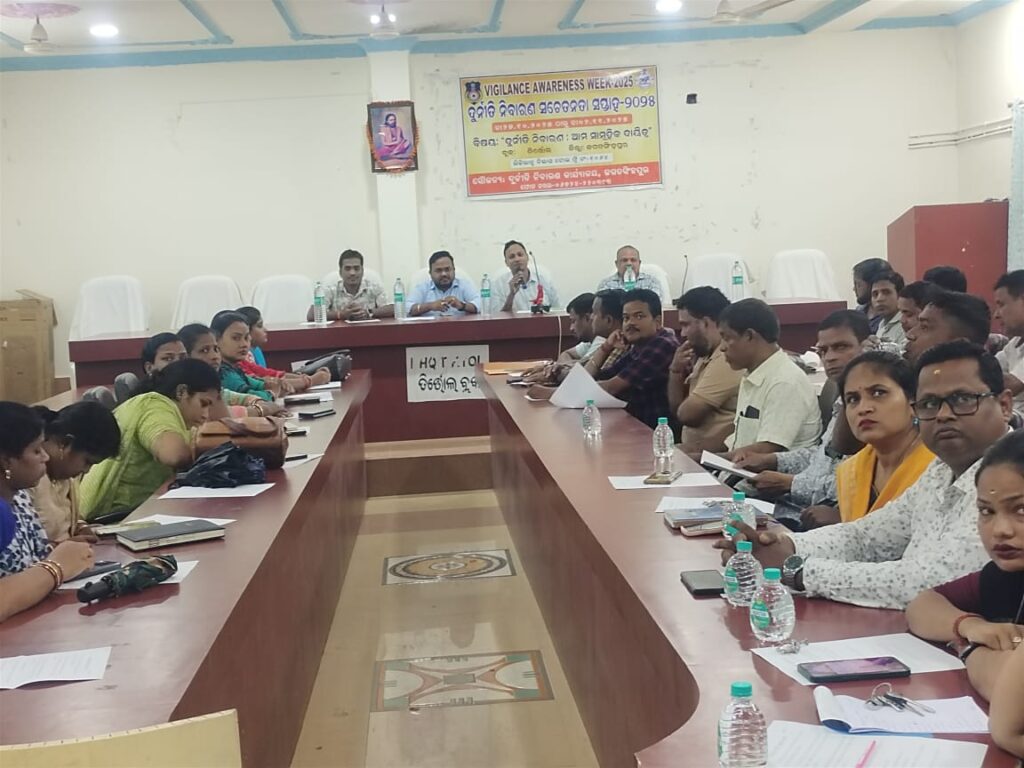 ତିର୍ତ୍ତୋଲ:ଜଗତସିଂହପୁର,,ତା ୩୦.୧୦.୨୦୨୪: ତା ୨୭.୧୦.୨୦୨୪ରିଖ ଠାରୁ ୦୨.୧୧.୨୦୨୪ରିଖ ପର୍ଯ୍ୟନ୍ତ ଜିଲ୍ଲା ରେ ଦୁର୍ନୀତି ନିବାରଣ ସଚେତନତା ସପ୍ତାହ-୨୦୨୫ ପାଳନ କରାଯାଉଛି। ଏହି ପରିପ୍ରେକ୍ଷୀରେ ଆଜି ଜଗତସିଂହପୁର ଜିଲ୍ଲା ର ତିର୍ତ୍ତୋଲ ବ୍ଲକ୍ କାର୍ଯ୍ୟଳୟ ଦୁର୍ନୀତି ନିବାରଣ ସତର୍କତା ସଭା ବିଡ଼ିଓ ଗିରିଜା ଶଙ୍କର ମଲ୍ଲିକ ଙ୍କ ଅଧ୍ୟକ୍ଷତା ରେ ଅନୁଷ୍ଠିତ ହୋଇଯାଇଛି। ଶ୍ରୀ ମଲ୍ଲିକ ଉପସ୍ଥିତ ସମସ୍ତଙ୍କୁ ନିଜ ଆଚରଣ ରେ ସାଧୁତା, ସଚ୍ଚୋଟତା ଆଣିବା ପାଇଁ ପରାମର୍ଶ ଦେଇଥିଲେ। ଏହା ସହ ଉପସ୍ଥିତ ସମସ୍ତେ ଆଭାସି ମାଧ୍ୟମ ରେ ଯୋଡ଼ିହୋଇ ମୁଖ୍ୟମନ୍ତ୍ରୀ ଙ୍କ ରାଜ୍ୟ ସ୍ତରୀୟ ସାଧୁତା ର ଶପଥ ପାଠ ରେ ଯୋଡିହୋଇ ଶପଥ ପାଠ