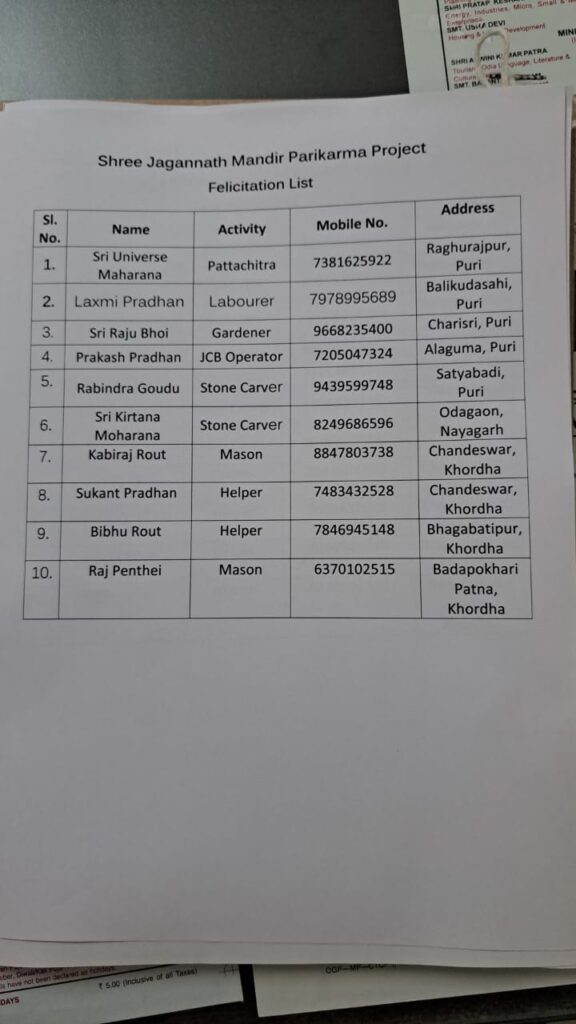 ଏକ ସ୍ୱତନ୍ତ୍ର କାର୍ଯ୍ୟକ୍ରମରେ ମାନ୍ୟବର ମୁଖ୍ୟମନ୍ତ୍ରୀ ଶ୍ରୀ ନବୀନ ପଟ୍ଟନାୟକ, ଗଜପତି ମହାରାଜା ଶ୍ରୀ ଶ୍ରୀ ଦିବ୍ୟସିଂହ ଦେବ, ମାନ୍ୟବର ବାଚସ୍ପତି ଶ୍ରୀମତୀ ପ୍ରମିଳା ମଲ୍ଲିକ, ମାନ୍ୟବର ସ୍ୱାସ୍ଥ୍ୟ ଓ ପରିବାର କଲ୍ୟାଣ ମନ୍ତ୍ରୀ ଶ୍ରୀ ନିରଞ୍ଜନ ପୂଜାରୀ, ଆଇନ ମନ୍ତ୍ରୀ ଶ୍ରୀ ଜଗନ୍ନାଥ ସାରକା, ୫-‘ଟି’ ଅଧ୍ୟକ୍ଷ ଶ୍ରୀ ଭି.କେ. ପାଣ୍ଡିଆନ୍, ପୁରୀ ବିଧାୟକ ଶ୍ରୀ ଜୟନ୍ତ କୁମାର ଷଡ଼ଙ୍ଗୀ ପ୍ରମୁଖଙ୍କ ଉପସ୍ଥିତିରେ ଶ୍ରୀମନ୍ଦିର ପରିକ୍ରମା ପ୍ରକଳ୍ପରେ ଉଲ୍ଲେଖନୀୟ ଅବଦାନ ରଖିଥିବା ୧୦ ଜଣ ବ୍ୟକ୍ତିବିଶେଷଙ୍କୁ ସମ୍ବର୍ଦ୍ଧିତ କରିଥିଲେ । ସେମାନେ ହେଲେ ଶ୍ରୀ ୟୁନିଭର୍ସ ମହାରଣା, ଲକ୍ଷ୍ମୀ ପ୍ରଧାନ (ଶ୍ରମିକ), ଶ୍ରୀ ରାଜୁ ଭୋଇ (ମାଳି), ଶ୍ରୀ ପ୍ରକାଶ ପ୍ରଧାନ (ଜେସିବି ଅପରେଟର), ଶ୍ରୀ ରବିନ୍ଦ୍ର ଗୌଡ଼ (ପ୍ରସ୍ତର ଶିଳ୍ପୀ), ଶ୍ରୀ କିର୍ତ୍ତନ ମହାରଣା (ପ୍ରସ୍ତର ଶିଳ୍ପୀ), ଶ୍ରୀ କବିରାଜ ରାଉଳ (ରାଜମିସ୍ତ୍ରୀ), ଶ୍ରୀ ସୁକାନ୍ତ ପ୍ରଧାନ (ହେଲ¬ର), ଶ୍ରୀ ବିଭୁ ରାଉତ (ହେଲ¬ର) ଏବଂ ଶ୍ରୀ ରାଜ ପେନ୍ଥେଇ (ରାଜମିସ୍ତ୍ରୀ) ।