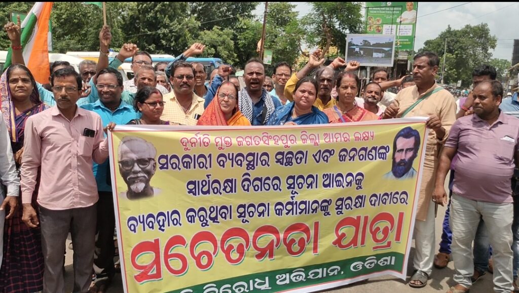 ଜଗତସିଂହପୁର ଠାରେ ଦୁର୍ନୀତି ବିରୋଧୀ ଅଭିଯାନ ପକ୍ଷରୁ ଏକ ସଚେତନତା କାର୍ଯ୍ୟକ୍ରମ ଅନୁଷ୍ଠିତ ହୋଇ ଯାଇଛି । ଦୁର୍ନୀତି ବିରୋଧୀ ଅଭିଯାନର ଆବାହିକା ବିଜୟଲଷ୍ମୀ ମହାପାତ୍ର ଙ୍କ ନେତୃତ୍ବରେ ବହୁ ବିଶିଷ୍ଟ ବ୍ୟକ୍ତି, ସୂଚନା ଅଧିକାର କର୍ମୀ ଓ ସାଧାରଣ ଜନସାଧାରଣ ମାନେ ଯୋଗ ଦେଇ କଲେଜ ଛକ ନିକଟରୁ ଏକ ଶୋଭାଯାତ୍ରାରେ ଆସି ଜିଲ୍ଲାପାଳଙ୍କ କାର୍ଯ୍ୟାଳୟ ରେ ପହଁଚି ଜିଲ୍ଲାପାଳ ଙ୍କୁ ଦାବିପତ୍ର ପ୍ରଦାନ କରିଥିଲେ । ପରେ ଏହାର ଏକକିତା ନକଲ ଜିଲ୍ଲା ଆରକ୍ଷୀ ଅଧିକ୍ଷକ କୁ ପ୍ରଦାନ କରାଯାଇଥିଲା । ତେବେ ବିଭିନ୍ନ ସମୟରେ ସୂଚନା ଅଧିକାରୀ ଙ୍କ ନାମରେ ଥାନାରେ। ଏତଲା, ମିଥ୍ୟା କେଶ ଓ ଧମକ ଦେଉଥିବା ଅଭିଯୋଗ କାରୀଙ୍କ ବିରୁଦ୍ଧରେ ଦୃଢ଼ କାର୍ଯ୍ୟାନୁଷ୍ଠାନ ଗ୍ରହଣ କରିବା ପାଇଁ ଦାବି କରାଯାଇଛି ।