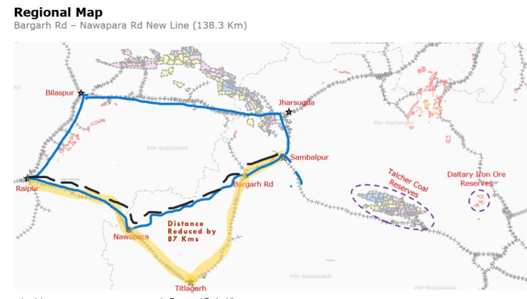 - ଶିଳ୍ପ ଅଭିବୃଦ୍ଧିକୁ ପ୍ରୋତ୍ସାହନ: ଏହି ପ୍ରସ୍ତାବିତ ରେଳ ଲାଇନ କୋଇଲା, ଲୁହାପଥର, ଇସ୍ପାତ, ସିମେଣ୍ଟ, କୃଷିଭିତ୍ତିକ ଶିଳ୍ପ ଏବଂ ଅନ୍ୟାନ୍ୟ ଶିଳ୍ପ ସାମଗ୍ରୀର ଦ୍ରୁତ ପରିବହନକୁ ସହଜ କରିବ, ଯାହା ବରଗଡ଼, ଝାରସୁଗୁଡ଼ା, ରାୟପୁର ଏବଂ ଟିଟିଲାଗଡ଼ର ଶିଳ୍ପଗୁଡ଼ିକୁ ଲାଭ ପହଞ୍ଚାଇବ |