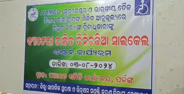-ଢେଙ୍କାନାଳ ଜିଲ୍ଲା ପରଜଙ୍ଗ ବ୍ଲକ ପଞ୍ଚାୟତ ସମିତି କାର୍ଯ୍ୟାଳୟ ପରିସରରେ ଜିଲ୍ଲା ସାମାଜିକ ସୁରକ୍ଷା ଓଭିନ୍ନକ୍ଷମ ସଶକ୍ତିକରଣ ବିଭାଗ ସହାୟତାରେ ବ୍ୟାଟେରୀ ଚାଳିତ ୩ ଚକିଆ ସାଇକେଲ ବଣ୍ଟନ କାର୍ଯ୍ୟକ୍ରମ ଅନୁଷ୍ଠିତ ହୋଇଥିଲା ଏଏ ଲଆଇ ଏମସି ଭୂବନେଶ୍ଵର ଓ ଭାରତୀୟ ତୈଳ ନିଗମ ପାରାଦୀପଙ୍କ ମିଳିତ ଆନୁକୂଲ୍ୟରେ ପରଜଙ୍ଗ ବ୍ଲକ ର ବିଭିନ୍ନ ପଞ୍ଚାୟତରୁ ୩୨ଜଣ ଙ୍କୁ ଚିହ୍ନଟ କରାଯାଇ ସେମାନଙ୍କୁ ତିନିଚକିଆ ସାଇକେଲ ବଣ୍ଟନ କାର୍ଯ୍ୟକ୍ରମ ଅନୁଷ୍ଠିତ ହୋଇଥିଲା ଏଥିରେ ମୁଖ୍ୟଅତିଥି ଭାବେ ଯୋଗ ଦେଇଥିଲେ ବିଧାୟକ ବିଭୁତି ଭୂଷଣ ପ୍ରଧାନ, ସମିତି ଅଧ୍ୟକ୍ଷା ଶ୍ରୀମତୀ ଶର୍ମିଷ୍ଠା ଦଳ ବେହେରା, ଉପାଧ୍ୟକ୍ଷ ଯଶସ୍କୀନ ରାଉତ,ପରଜଙ୍ଗ ଗୋଷ୍ଠୀ ଉନ୍ନୟନ ଅଧିକାରୀ ସଞ୍ଜୟ କୁମାର ପଣ୍ଡାଙ୍କ ଅଧ୍ୟକ୍ଷତାରେ କାର୍ଯ୍ୟକ୍ରମ ଅନୁଷ୍ଠିତ ହୋଇଥିଲା, ଏହି କାର୍ଯ୍ୟକ୍ରମରେ ଅତିଥିମାନେ ଏଏ ଲଆଇ ଏମସି ଭୂବନେଶ୍ଵର ଓ ଭାରତୀୟ ତୈଳ ନିଗମ ପାରାଦୀପଙ୍କୁ ଧନ୍ୟବାଦ୍ ଦେବା ସହିତ ଖୁବଶିଘ୍ର ଲୋକଙ୍କୁ ଅଧିକରୁ ଅଧିକ ଭାବର ବ୍ୟାଟେରୀ ଚାଳିତ ୩ ଚକିଆ ସାଇକେଲ ଯୋଗାଇଦେବାକୁ ମତ ପ୍ରକାଶ କରିଛନ୍ତି।