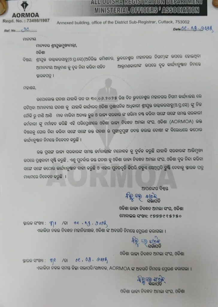 ବି.ଏମ.ସି. ଅତିରିକ୍ତ କମିଶନର ଙ୍କୁ ଆକ୍ରମଣ ଘଟଣାକୁ ଭଦ୍ରକ ଓ.ଏ.ଏସ୍. ସଂଘ ତରଫରୁ ତୀବ୍ର ନିନ୍ଦା କରାଯାଇଛି