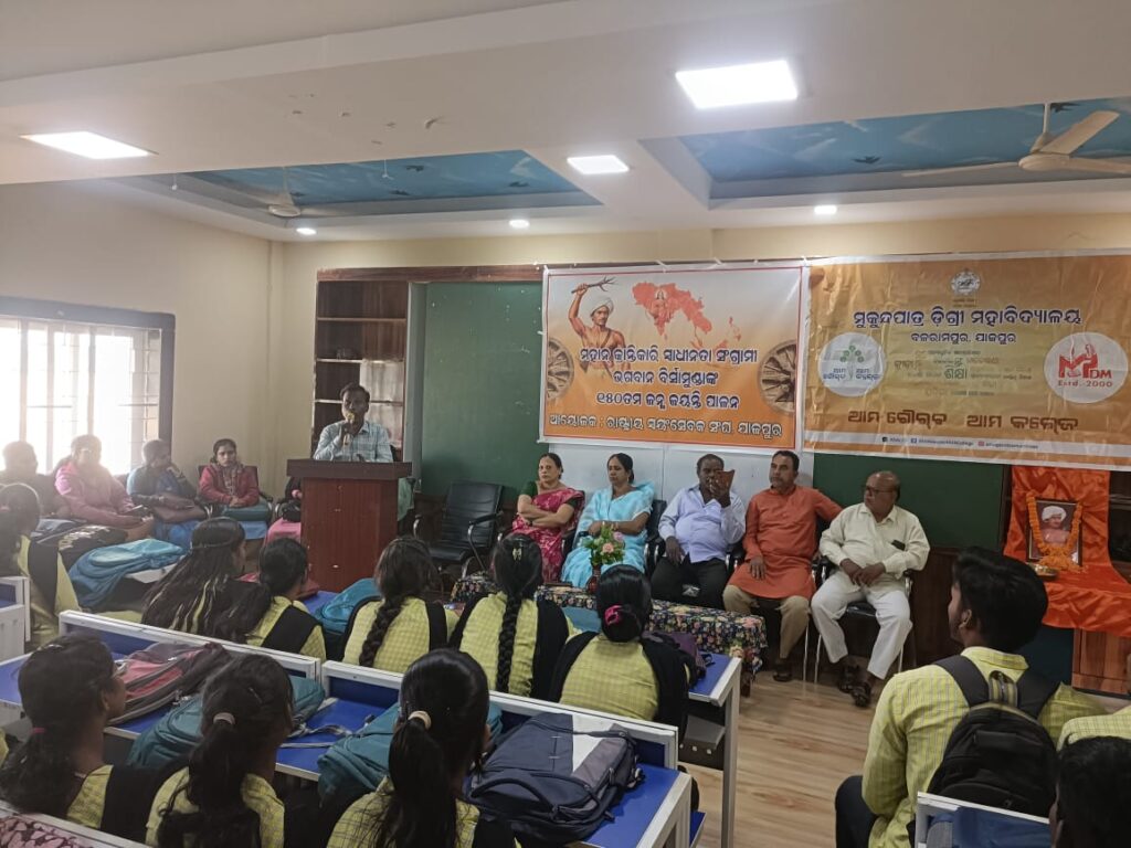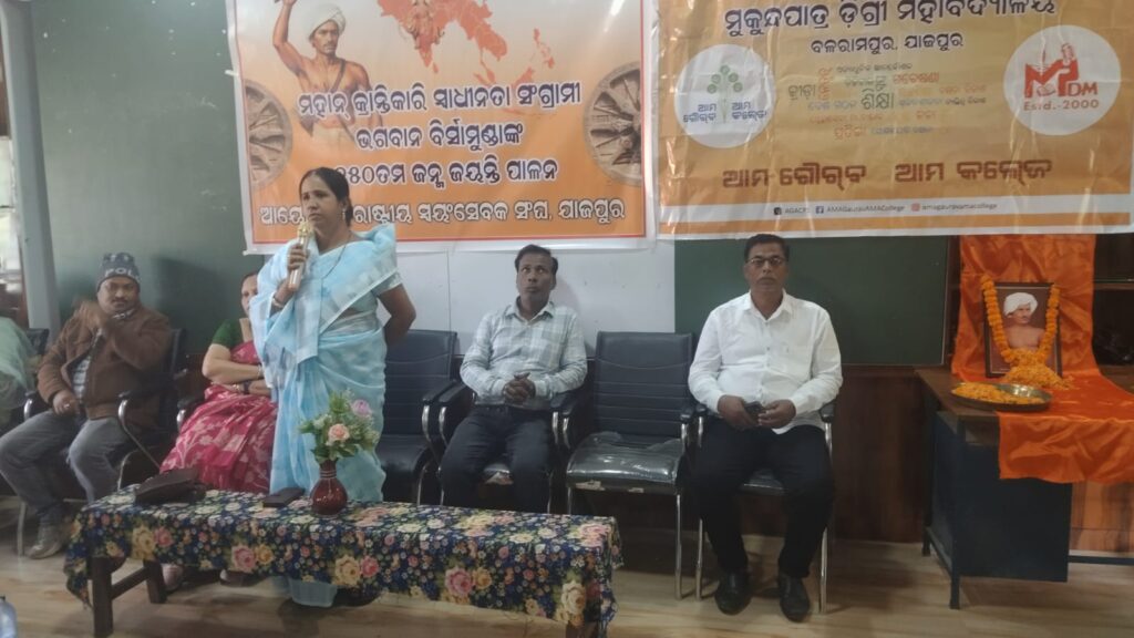 ଧର୍ମଶାଳା– ରାଷ୍ଟ୍ରୀୟ ସ୍ଵୟଂ ସେବକ ସଂଘପକ୍ଷରୁ ବିର୍ସା ମୁଣ୍ଡା ଙ୍କ ୧ ୫0 ତମ ଜନ୍ମ ଜୟନ୍ତୀ ଯାଜପୁର ଜିଲ୍ଲା ଧର୍ମଶାଳା ବ୍ଲକ ମୁକୁନ୍ଦ ପାତ୍ର ଡ଼ିଗ୍ରୀ ମହାବିଦ୍ୟାଳୟ ପରିସରରେ ପାଳିତ ହୋଇଯାଇଛି। ଏଥିରେ ରାଷ୍ଟ୍ରୀୟ ସ୍ଵୟଂ ସେବକ ସଂଘ ଯାଜପୁର ଜିଲ୍ଲା ସେବା ପ୍ରମୁଖ ଶ୍ରୀ ରମେଶ ଚନ୍ଦ୍ର ନାୟକ, ଜିଲ୍ଲା ମହାବିଦ୍ୟାଳୟ ପ୍ରମୁଖ ସତ୍ୟ ରଂଜନ ନାଏକ, ହୁର୍ଷିକେଶ ମହାରଣା, ଗିରିଗାରିମା ମହାନ୍ତି, ଧୃବ ଚରଣ ରାଉତ, ବାବୁଲି ଦାସ ପ୍ରମୁଖ ଯୋଗ ଦେଇଥିଲେ। ଏଥିରେ ଡ଼ିଗ୍ରୀ ମହାବିଦ୍ୟାଳୟ ର ଅଧ୍ୟକ୍ଷା ଶ୍ରୀମତୀ କବିତା ବିଶ୍ବାଳ ମୁଖ୍ୟ ଅତିଥି ଓ ଶ୍ରୀ ରମେଶ ଚନ୍ଦ୍ର ନାୟକ ମୁଖ୍ୟ ବକ୍ତା ଭାବେ ଯୋଗଦେଇ ବିର୍ସା ମୁଣ୍ଡା ଙ୍କ ସମାଜ ଧର୍ମ, ସଂସ୍କୃତି, ଓ ବନବାସୀ କଲ୍ୟାଣ ପାଇଁ ଉତ୍ସର୍ଗୀକୃତ ବଳିଦାନ ଉପରେ ମାର୍ଗ ଦର୍ଶନ କରି ଥିଲେ।