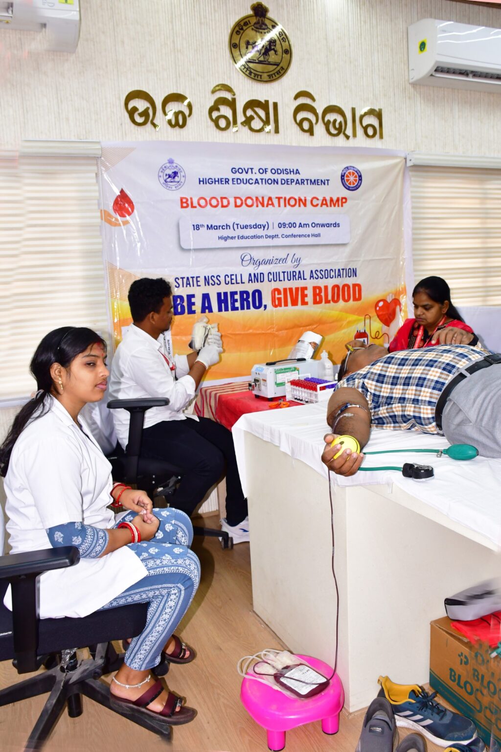 ଭୁବନେଶ୍ୱର, (୧୯/୩): ଉଚ୍ଚଶିକ୍ଷା ବିଭାଗ ରାଜ୍ୟ ଏନ.ଏସ. ଏସ ଶାଖା ଏବଂ ବିଭାଗର ସାଂସ୍କୃତିକ ସଂଘର ମିଳିତ ଆନୁକୂଲ୍ୟରେ ଏକ ରକ୍ତଦାନ ଶିବିର ଆୟୋଜିତ ହୋଇଯାଇଛି। ଉଚ୍ଚଶିକ୍ଷା ବିଭାଗର ସମ୍ମିଳନୀ କକ୍ଷରେ ଆୟୋଜିତ ହୋଇଥିବା ଏହି ରକ୍ତଦାନ ଶିବିରରେ ୬୫ ୟୁନିଟ ରକ୍ତ ସଂଗ୍ରହ କରାଯାଇ ରେଡ଼କ୍ରସ ଆଞ୍ଚଳିକ ରକ୍ତଭଣ୍ଡାର, ଭୁବନେଶ୍ୱରକୁ ହସ୍ତାନ୍ତର କରାଯାଇଛି।ଉଚ୍ଚଶିକ୍ଷା ବିଭାଗର କମିଶନର ତଥା ଶାସନ ସଚିବ ଶ୍ରୀ ଅରବିନ୍ଦ ଅଗ୍ରୱାଲ ଆନୁଷ୍ଠାନିକ ଭାବରେ ରକ୍ତଦାନ ଶିବିରର ଉଦଘାଟନ କରିବା ସହିତ ନିଜେ ମଧ୍ୟ ରକ୍ତଦାନ କରିଥିଲେ। ଉଚ୍ଚଶିକ୍ଷା ବିଭାଗର ଅର୍ଥ ପରାମର୍ଶ ଦାତା ତଥା ସ୍ୱତନ୍ତ୍ର ଶାସନ ସଚିବ ଶ୍ରୀ ମନୋରଞ୍ଜନ ନାୟକ, ସ୍ୱତନ୍ତ୍ର ଶାସନ ସଚିବ ଶ୍ରୀ ପ୍ରମୋଦ କୁମାର ମିଶ୍ର, ଏନ. ଏସ. ଏସ ଏବଂ ରେଡ଼କ୍ରସ ସ୍ବେଚ୍ଛାସେବୀମାନେ ଏହି ରକ୍ତଦାନ ଶିବିରରେ ଯୋଗଦେଇ ରକ୍ତଦାନ କରିଥିଲେ।