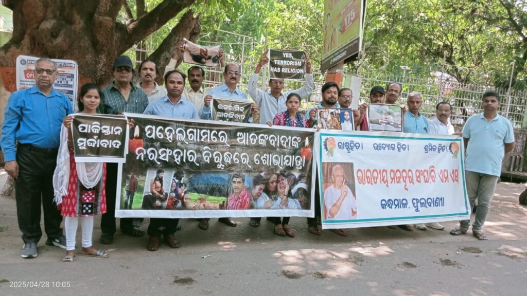 କନ୍ଧମାଳ ତା ୨୮/୦୪/୨୦୨୫ ଫୁଲବାଣୀ ଭାରତୀୟ ମଜଦୂର ସଂଘ (ବିଏମ ଏସ) କନ୍ଧମାଳ ଆନୂକୁଲ୍ୟରେ ଫୁଲବାଣୀ ଜିଲାପାଳଙ୍କ କାର୍ଯ୍ୟାଳୟ ସମ୍ମୁଖରେ ଜାମୁ- କାଶ୍ମୀରର ପହଲଗାଁ ଠାରେ ପାକିସ୍ଥାନୀ ଆତଙ୍କବାଦୀଙ୍କ ଅତ୍ୟନ୍ତ ବର୍ବରୋଚିତ ହତ୍ୟା ବିରୋଧରେ ଏକ ପ୍ରତିବାଦ ଅନୁଷ୍ଠିତ ହୋଇଯାଇଛି।ପାକିସ୍ତାନୀ ଆତଙ୍କବାଦୀମାନେ ପର୍ଯ୍ୟଟକମାନଙ୍କୁ ବର୍ବରୋଚିତ ଭାବେ ନରସଂହାର କରିଥିଲେ। ଆତଙ୍କବାଦୀଙ୍କ ଗୁଳିରେ ପ୍ରାଣ ହରାଇଥିବା ଅମର ଆତ୍ମାଙ୍କ ସମ୍ମାନର୍ଥେ ଭାରତୀୟ ମଜଦୂର ସୄଂଘ କନ୍ଧମାଳ ,ଫୁଲବାଣୀ ପକ୍ଷରୁ ଶ୍ରଦ୍ଧାଞ୍ଜଳି ଅର୍ପଣ କରି ଜିଲାପାଳଙ୍କ କାର୍ଯ୍ୟାଳୟ ସମ୍ମୁଖରେ ପ୍ରତିବାଦ କରାଯାଇଛି। ପାକିସ୍ତାନର ଆତଙ୍କବାଦୀ କାର୍ଯ୍ୟକୁ ଉପସ୍ଥିତ ଜନସାଧାରଣ ନିନ୍ଦା କରିବା ସହ ପାକିସ୍ତାନ ମୁର୍ଦ୍ଦାବାଦ ଧ୍ୱନି ଦେଇଥିଲେ।ପାକିସ୍ତାନର ଆତଙ୍କବାଦୀ କାର୍ଯ୍ୟ କଳାପକୁ ଦୃଢ ହସ୍ତରେ ଦମନ କରିବାକୁ ସରକାର ଙ୍କୁ ଦାବୀ କରିଥିଲେ।