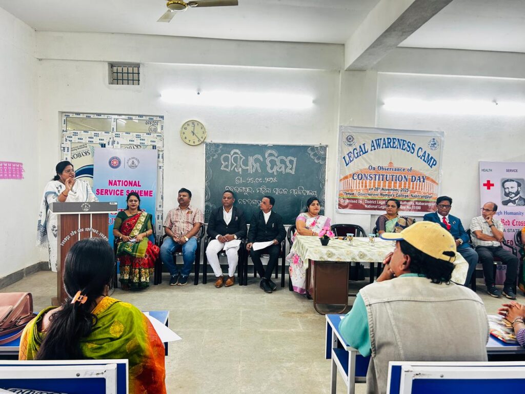 :ନବରଙ୍ଗପୁର, ୨୬/୧୧/୨୦୨୫ ସମ୍ଭିଧାନ ଦିବସ ପାଳନ ଅବସରରେ ମହିଳା ମହାବିଦ୍ୟାଳୟ, ନବରଙ୍ଗପୁର ପରିସରରେ ଜିଲ୍ଲା ଆଈନ ସେବା ପ୍ରାଧିକରଣ, ନବରଙ୍ଗପୁର ତରଫରୁ ଏକ ଆଇନ ସଚେତନତା ଶିବିର ଅନୁଷ୍ଠୀତ ହୋଇଯାଇଛି । ଏହି କାର୍ଯ୍ୟକ୍ରମରେ ବିଦ୍ୟାଳୟ ର ଛାତ୍ରୀମାନେ, ପାରା ଲିଗାଲ ସଦସ୍ୟ, ଆଇନଜୀବି ପ୍ରମୁଖ ଭାଗ ନେଇଥିଲେ l ଏହି କାର୍ଯ୍ୟକ୍ରମ ରେ ଜିଲ୍ଲା ଆଇନ ସେବା ପ୍ରାଧିକରଣ, ନବରଙ୍ଗପୁର ଭାରପ୍ରାପ୍ତ ଅଧ୍ୟକ୍ଷ ତଥା ଅତିରିକ୍ତ ଜିଲ୍ଲା ଦୌରାଜର୍ଜ ଶ୍ରୀଯୁକ୍ତ ବିଷ୍ଣୁ ପ୍ରସାଦ ମିଶ୍ରଙ୍କ ନିର୍ଦେଶ କ୍ରମେ ଆୟୋଜିତ ହୋଇଥିଲାl ଏହି କାର୍ଯ୍ୟକ୍ରମରେ ମୁଖ୍ୟ ଅତିଥି ଭାବେ ଭାରପ୍ରାପ୍ତ ସଚିବ ଶ୍ରୀମତୀ ଶାଶ୍ଵତୀ ମିଶ୍ର ଯୋଗଦାନ କରିଥିଲେ l ଅନ୍ୟାନ୍ୟ ଅତିଥି ଭାବେ ଆଇନଜୀବି ସଂଘର ସଭାପତି ସିରାଜଉଦ୍ଦିନ ଅହମ୍ମଦ, ଉପ ସଭାପତି ସଦାଶିବ ସାହୁ, ଉପ ମୁଖ୍ୟ ଆଈନ ଗତ ସହାୟତା ପ୍ରତିରକ୍ଷା ପରାମର୍ଶଦାତା. ରାଜ କିଶୋରେ ନାଗ, ଆଇନ ଜୀବି କିଶୋରୀ ପଟ୍ଟନାୟକ, ମହାବିଦ୍ୟାଳୟର ଅଧ୍ୟାପିକା ମ।ଳେଶ୍ଵରୀ ସାହୁ, ଅଧ୍ୟାପକ ବିନୋଦ ବିହାରୀ ପ୍ରଧାନ, ଅଧ୍ୟାପିକା ତଊର। ବେଗମ, ଅଧ୍ୟାପିକା ରଞ୍ଜୁଷା କୁମାରୀ ପ୍ରହରାଜ, ଅଧ୍ୟାପିକା ଡକ୍ଟର ଏମ. ରୋହିଣୀ ରାଣୀ ମଞ୍ଚାସୀନ ହୋଇ ଭାରତର ନାଗରିକଙ୍କ ମୌଳିକ କର୍ତବ୍ୟ ଉପରେ ଛାତ୍ରୀ ମାନଙ୍କୁ ଆଲୋକପାତ କରିଥିଲେ l ପରିଶେଷରେ ମହାବିଦ୍ୟାଳୟର ଅଧ୍ୟାପକ ନୁପେନ୍ଦ୍ରନାଥ ଖୋସ୍ଲା ଧନ୍ୟବାଦ ଅର୍ପଣ କରିଥିଲେ । ଜିଲ୍ଲା ଆଈନ ସେବା ପ୍ରାଧିକରଣର ଦ୍ଵାରା ଏହି ଶିବିର ପରିଚାଳନା କରିଥିଲେ।