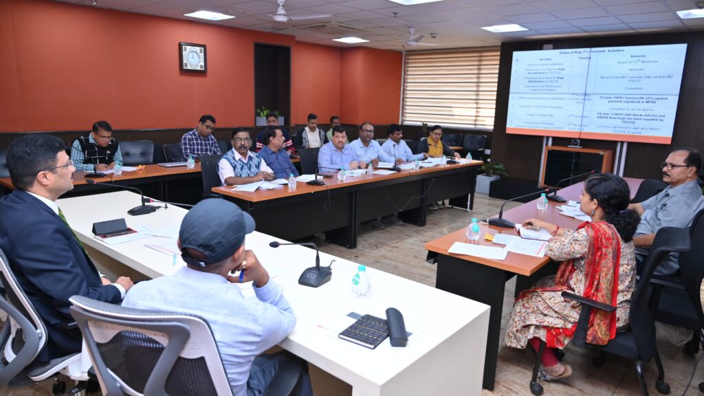 ମାଣ୍ଡିଆ କ୍ରୟର ସମୀକ୍ଷା କଲେ କୃଷି ସଚିବ ଡ଼ ଅରବିନ୍ଦ ପାଢ଼ୀ ପ୍ରକ୍ରିୟାରେ ସ୍ୱଚ୍ଛତା ଅବଲମ୍ବନ କରିବାକୁ ଦେଲେ ନିର୍ଦ୍ଦେଶଭୁବନେଶ୍ବର ତା ୨୦. ୦୧. ୨୦୨୫ଆଜି କୃଷି ବିଭାଗ ପ୍ରମୁଖ ଶାସନ ସଚିବ ଡ଼. ଅରବିନ୍ଦ କୁମାର ପାଢ଼ୀଙ୍କ ଅଧ୍ୟକ୍ଷତାରେ ଶ୍ରୀ ଅନ୍ନ ଅଭିଯାନ ଅଧିନରେ ମାଣ୍ଡିଆ କ୍ରୟ କାର୍ଯ୍ୟକ୍ରମର ସମୀକ୍ଷା ବୈଠକ କୃଷି ଭବନ ଠାରେ ଅନୁଷ୍ଠିତ ହୋଇଯାଇଛି | ଏହି ବୈଠକରେ ଚଳିତ ବର୍ଷ ଚାଷୀମାନଙ୍କୁ ମାଣ୍ଡିଆର ସର୍ବନିମ୍ନ ସହାୟକ ମୂଲ୍ୟ କ୍ବିଣ୍ଟାଲ ପିଛା ୪୨୯୦/- ଟଙ୍କା ସହ ରାଜ୍ୟ ସରକାରଙ୍କ ଅତିରିକ୍ତ ପ୍ରୋତ୍ସାହନ ରାଶି