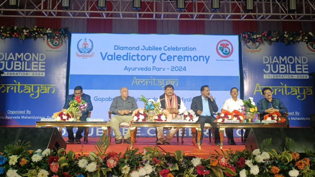 ହୀରକ ଜୟନ୍ତୀ ସମାରୋହ ଉଦଯାପିତ।ପୁରୀ ୬/୧୨ ଗୋପବନ୍ଧୁ ଆୟୃର୍ବେଦ ମହାବିଦ୍ୟାଳୟ ର ହୀରକ ଜୟନ୍ତୀ ସମାରୋହ ଆଜି ସଂଧ୍ୟାରେ ଉଦଯାପିତ ହୋଇ ଯାଇଛି।ଏଥିରେ ମୁଖ୍ୟ ଅତିଥି ଭାବେ ଯୋଗ ଦେଇ ପୂର୍ବତନ ବିଧାୟକ ଜୟନ୍ତ କୁମାର ଷଡ଼ଙ୍ଗୀ ଆୟୃର୍ବେଦ ବହୁ ପ୍ରାଚୀନ ଚିକିତ୍ସା ପଦ୍ଧତି।ସମୟ କ୍ରମେ ଆୟୁର୍ବେଦର ଅନେକ ଉନ୍ନତି ଘଟିଛି। ଚିକିତ୍ସକ ମାନେ ଏହାକୁ ସେବା ଭାବେ ବିବେଚନା କରି କାର୍ଯ୍ୟ କରିବା ଉଚିତ। ୭୫ ବର୍ଷର ଏହି ମହାବିଦ୍ୟାଳୟ ଅନେକ ଚିକିତ୍ସକ ଙ୍କୁ ସୃଷ୍ଟି କରି ସୁନାମ ଅର୍ଜନ କରିଛି ବୋଲି ବୋଲି ସେ ମତଦେବା ସହ ଯାହା ସମସ୍ୟା ରହିଛି ତାହା ସମାଧାନ ପାଇଁ ଉଦ୍ୟମ କରାଯିବ ବୋଲି କହିଥିଲେ। ପ୍ରଫେସର ଡା ସୁରେଶ କୁମାର ଦାସ,ପ୍ରଫେସର ଡା ଗୋପାଳ ଚନ୍ଦ୍ର ନନ୍ଦ, ପ୍ରଫେସର ଡା ରାମକୃଷ୍ଣ ପାଣିଗ୍ରାହୀ ପ୍ରମୁଖ ଗୋପବନ୍ଧୁ ଆୟୁର୍ବେଦ ମହାବିଦ୍ୟାଳୟ ସମଗ୍ର ରାଜ୍ୟରେ ଏକ ଆଦର୍ଶ ମହାବିଦ୍ୟାଳୟ ଭାବେ ସୁନାମ ରଖିଛି।ଏହାକୁ ଆଗାମୀ ପିଢ଼ି ଆଗକୁ ନେବା ସହ ଅଧିକ ଗବେଷଣା କରି ଆୟୁର୍ବେଦ କୁ ଶିଖରରେ ପହଞ୍ଚାଇବାକୁ ପରାମର୍ଶ ଦେଇଥିଲେ।ମହାବିଦ୍ୟାଳୟର ଅଧ୍ୟକ୍ଷ ଡା ଅରୁଣ କୁମାର ଦାସ ଏଥିରେ ସଭାପତିତ୍ବ କରିବା ସହ ମହାବିଦ୍ୟାଳୟ ର ହୀରକ ଜୟନ୍ତୀ ପାଳନ ରେ ସହଯୋଗ କରିଥିବା ସମସ୍ତଙ୍କୁ କୃତଜ୍ଞତା ଜ୍ଞାପନ କରିଥିଲେ।ଅତିଥି ମାନଙ୍କୁ ଏହି ଅବସରରେ ସମ୍ବର୍ଦ୍ଧିତ କରାଯାଇଥିଲା।ଶେଷରେ ଆୟୋଜକ ସମ୍ପାଦକ ରଞ୍ଜନ କୁମାର କାଷ୍ଟା ଧନ୍ୟବାଦ ଅର୍ପଣ କରିଥିଲେ।ପରିଶେଷରେ ସାଂସ୍କୃତିକ କାର୍ଯ୍ୟକ୍ରମ ଅନୁଷ୍ଠିତ ହୋଇଥିଲା।ସୂଚନା ଯୋଗ୍ୟ ଯେ ଅମୃତାୟନ ନାମରେ ଆୟୋଜିତ ଏହି ୩ ଦିନିଆ ମହୋତ୍ସବ କୁ ମହାମହୀମ ରାଷ୍ଟ୍ରପତି ଉଦଘାଟନ କରିଥିଲେ।