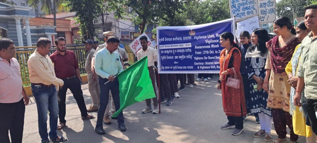 ଦୁର୍ନୀତି ମନୋବଳକୁ ଦୁର୍ବଳ କରାଏ ଏବଂ ସାଧୁତା ସୁଦୃଢ କରାଏ ବୋଲି ମତ୍ତ ବ୍ୟକ୍ତ କରିଥିଲେ। ଜିଲ୍ଲାପାଳ ଉପସ୍ଥିତ ସମସ୍ତ ଅଂଶଗ୍ରହଣକାରୀଙ୍କୁ ଶପଥପାଠ କରାଇଥିଲେ ।ସକାଳ ନଅ ଘଟିକା ସମୟରେ ଏକ ବିରାଟ ରାଲି ଗଜପତି ଛକଠାରୁ ଆରମ୍ଭ ହୋଇ ରାୟଗଡ଼ା ମୁଖ୍ୟରାସ୍ତା, ବ୍ଳକ କାର୍ଯ୍ୟାଳୟ ଦେଇ ଜିଲ୍ଲାପରିଷଦ କକ୍ଷ ପରିସରରେ ପହଞ୍ଚିଥିଲା। ପ୍ଲାକାର୍ଡ ଓ ସ୍ଲୋଗାନରେ ସହର ମୁଖରିତ ହୋଇଉଠିଥିଲା ।ଅତିରିକ୍ତ ଜିଲ୍ଲାପାଳ ଶ୍ରୀଯୁକ୍ତ ନବୀନ ଚନ୍ଦ୍ର ନାଏକ ଏହାକୁ ଉଦଘାଟନ କରିଥିଲେ।ଏଥିରେ ବିଭିନ୍ନ କଲେଜ ର ଛାତ୍ର ଛାତ୍ରୀ,ଜିଲ୍ଲା ସ୍ତରୀୟ ବିଭିନ୍ନ ବିଭାଗୀୟ ଅଧିକାରୀ ପ୍ରମୁଖ ଯୋଗ ଦେଇଥିଲେ। ଉପନିର୍ଦ୍ଦେଶକ ତଥା ଜିଲ୍ଲା ସୂଚନା ଓ ଲୋକସମ୍ପର୍କ ଅଧିକାରୀ ବସନ୍ତ କୁମାର ପ୍ରଧାନ ପ୍ରାରମ୍ଭିକ ସୂଚନା ଦେବାସହ ଶେଷରେ ଧନ୍ୟବାଦ ଅର୍ପଣ କରିଥିଲେ। ଶିକ୍ଷକ ନୀଳାଞ୍ଚଳ ମିଶ୍ର ଏହାର ସଂଯୋଜନା କରିଥିଲେ ।ଗତ ତା ୨୭ ଅକ୍ଟୋବର ଠାରୁ ସଚେତନତା କାର୍ଯ୍ୟକ୍ରମ ବିଭିନ୍ନ ବ୍ଲକ ଓ ଗ୍ରାମ ପଞ୍ଚାୟତ ସ୍ତରରେ ଆୟୋଜନ କରାଯାଇଥିଲା ।