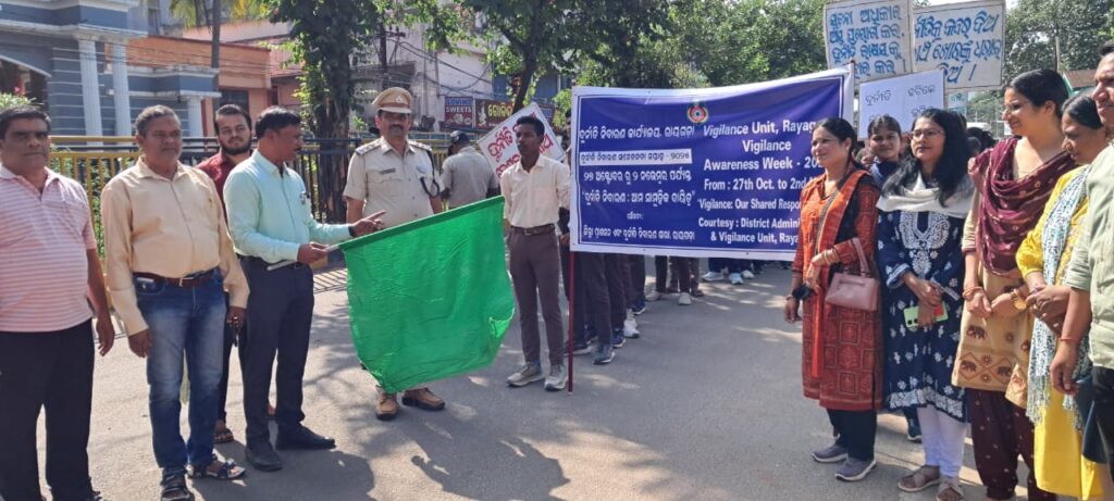 ଦୁର୍ନୀତି ମନୋବଳକୁ ଦୁର୍ବଳ କରାଏ ଏବଂ ସାଧୁତା ସୁଦୃଢ କରାଏ ବୋଲି ମତ୍ତ ବ୍ୟକ୍ତ କରିଥିଲେ। ଜିଲ୍ଲାପାଳ ଉପସ୍ଥିତ ସମସ୍ତ ଅଂଶଗ୍ରହଣକାରୀଙ୍କୁ ଶପଥପାଠ କରାଇଥିଲେ ।ସକାଳ ନଅ ଘଟିକା ସମୟରେ ଏକ ବିରାଟ ରାଲି ଗଜପତି ଛକଠାରୁ ଆରମ୍ଭ ହୋଇ ରାୟଗଡ଼ା ମୁଖ୍ୟରାସ୍ତା, ବ୍ଳକ କାର୍ଯ୍ୟାଳୟ ଦେଇ ଜିଲ୍ଲାପରିଷଦ କକ୍ଷ ପରିସରରେ ପହଞ୍ଚିଥିଲା। ପ୍ଲାକାର୍ଡ ଓ ସ୍ଲୋଗାନରେ ସହର ମୁଖରିତ ହୋଇଉଠିଥିଲା ।ଅତିରିକ୍ତ ଜିଲ୍ଲାପାଳ ଶ୍ରୀଯୁକ୍ତ ନବୀନ ଚନ୍ଦ୍ର ନାଏକ ଏହାକୁ ଉଦଘାଟନ କରିଥିଲେ।ଏଥିରେ ବିଭିନ୍ନ କଲେଜ ର ଛାତ୍ର ଛାତ୍ରୀ,ଜିଲ୍ଲା ସ୍ତରୀୟ ବିଭିନ୍ନ ବିଭାଗୀୟ ଅଧିକାରୀ ପ୍ରମୁଖ ଯୋଗ ଦେଇଥିଲେ। ଉପନିର୍ଦ୍ଦେଶକ ତଥା ଜିଲ୍ଲା ସୂଚନା ଓ ଲୋକସମ୍ପର୍କ ଅଧିକାରୀ ବସନ୍ତ କୁମାର ପ୍ରଧାନ ପ୍ରାରମ୍ଭିକ ସୂଚନା ଦେବାସହ ଶେଷରେ ଧନ୍ୟବାଦ ଅର୍ପଣ କରିଥିଲେ। ଶିକ୍ଷକ ନୀଳାଞ୍ଚଳ ମିଶ୍ର ଏହାର ସଂଯୋଜନା କରିଥିଲେ ।ଗତ ତା ୨୭ ଅକ୍ଟୋବର ଠାରୁ ସଚେତନତା କାର୍ଯ୍ୟକ୍ରମ ବିଭିନ୍ନ ବ୍ଲକ ଓ ଗ୍ରାମ ପଞ୍ଚାୟତ ସ୍ତରରେ ଆୟୋଜନ କରାଯାଇଥିଲା ।