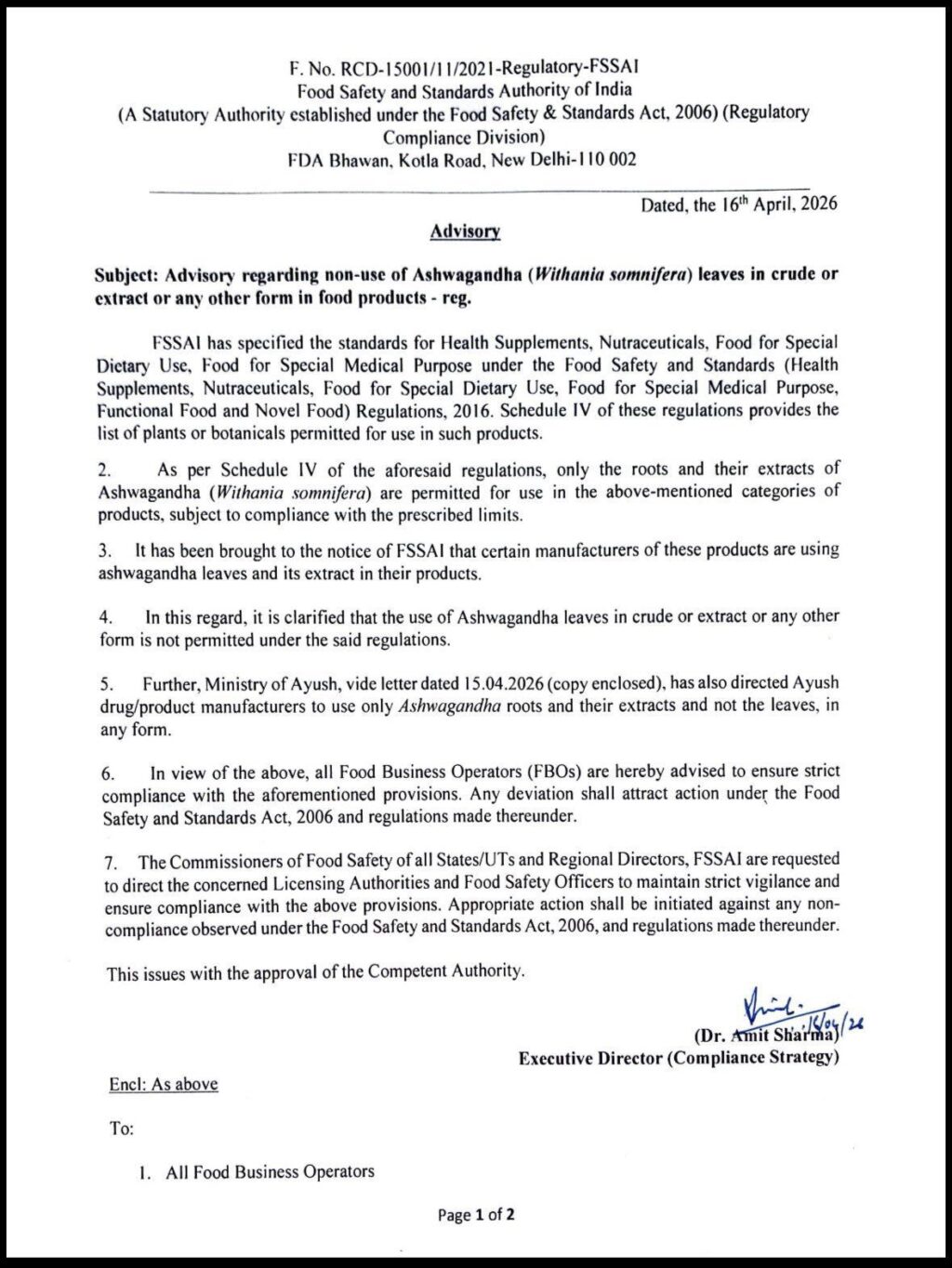 ଖାଦ୍ୟରେ_ବ୍ୟବହାର_ହେବନି_ଅଶ୍ବଗନ୍ଧା_ପତ୍ର-ଅଶ୍ବଗନ୍ଧା ବ୍ୟବହାରକୁ ନେଇ FSSAIର ବଡ ନିଷ୍ପତ୍ତି-ଖାଦ୍ୟରେ ଅଶ୍ବଗନ୍ଧା ପତ୍ର ନ ମିଶେଇବା ପାଇଁ ନିର୍ଦ୍ଦେଶାବଳୀ ଜାରି-କେବଳ ଅଶ୍ବଗନ୍ଧାର ଚେର ଆବଶ୍ୟକ ମାତ୍ରାରେ ବ୍ୟବହାର ଅନୁମତି