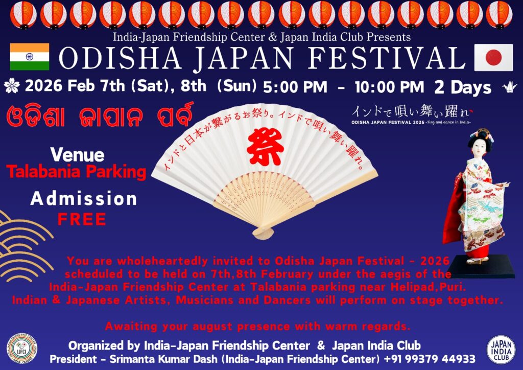 ପୁରୀ୫।୨,, ୭ ଓ ୮ ଦୁଇ ଦିନ ଧରି ସନ୍ଧ୍ୟା ୬ଟାରେ ଇଣ୍ଡିଆ- ଜାପାନ ଫ୍ରେଣ୍ଡସିପ୍ ସେଣ୍ଟର ପକ୍ଷରୁ ସ୍ଥାନୀୟ ତାଳବଣିଆ ପଡ଼ିଆଠାରେ ଓଡ଼ିଶା-ଜାପାନ ପର୍ବ ମହାସମାରୋହ ରେ ଅନୁଷ୍ଠିତ ହେବ ବୋଲି ସେଣ୍ଟରର ସଭାପତି ଶ୍ରୀମନ୍ତ୍ର କୁମାର ଦାଶ ପ୍ରେସ୍ ଇସ୍ତାହାର ଜରିଆରେ ସୂଚନା ଦେଇଛନ୍ତି। ଏହି ପର୍ବରେ ଗୋଟିଏ ମଞ୍ଚରେ ଦୁଇ ଦେଶର କଳାକାରମାନେ ନିଜ ନିଜ ଦେଶର କଳା ସଂସ୍କୃତିର ଝଲକ ପ୍ରଦ ର୍ଶନ କରିବେ।