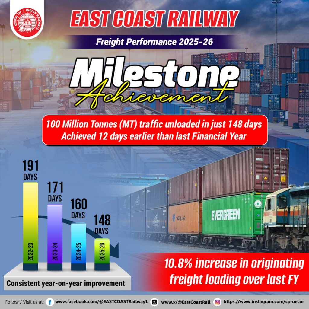 ପଣ୍ୟ ପରିବହନ କ୍ଷେତ୍ରରେ ପୂର୍ବତଟ ରେଳପଥର ନୂତନ ମାନଦଣ୍ଡ _ ରେକର୍ଡ ୧୪୮ ଦିନରେ ୧୦୦ ନିୟୁତ ଟନ୍ ପଣ୍ୟ ଅପସାରଣ |*ପୂର୍ବ ତଟ ରେଳପଥ (ଇକୋର) ଚଳିତ ଆର୍ଥିକ ବର୍ଷର ମାତ୍ର ୧୪୮ ଦିନ ମଧ୍ୟରେ ୧୦୦ ନିୟୁତ ଟନ୍ ପଣ୍ୟ ଅପସାରଣର ମାଇଲଖୁଣ୍ଟ ଅତିକ୍ରମ କରି, ପଣ୍ୟ ପରିବହନରେ ଏକ ଉଲ୍ଲେଖନୀୟ ମାଇଲଖୁଣ୍ଟ ହାସଲ କରିଛି | ଚଳିତ ଆର୍ଥିକ ବର୍ଷର ୨୬ ଅଗଷ୍ଟ ୨୦୨୫ ସୁଦ୍ଧା, ପୂର୍ବତଟ ରେଳପଥ ସଫଳତାର ସହିତ ୧୦୦.୫୫ ନିୟୁତ ଟନ୍ ପଣ୍ୟ ଅପସାରଣ କରିଛି, ଯାହା ଗତ ବର୍ଷର ସମାନ ସମୟ ତୁଳନାରେ 8% ପ୍ରଭାବଶାଳୀ ଅଭିବୃଦ୍ଧି ପଞ୍ଜିକୃତ କରି – ୭.୪୩ ନିୟୁତ ଟନ୍ ଅଧିକ ପଣ୍ୟ ଅପସାରଣ କରିପାରିଛି |*ରେଳ ମଣ୍ଡଳ ଗୁଡ଼ିକ ଦ୍ୱାରା ଯୋଗଦାନ:*•ଖୋର୍ଦ୍ଧା ରୋଡ ରେଳ ମଣ୍ଡଳ: ୫୮.୧ ନିୟୁତ ଟନ୍ •ୱାଲଟିୟର ରେଳ ମଣ୍ଡଳ: ୨୫.୪୬ ନିୟୁତ ଟନ୍• ସମ୍ବଲପୁର ରେଳ ମଣ୍ଡଳ: ୧୭ ନିୟୁତ ଟନ୍ ପୂର୍ବତଟ ରେଳପଥ ଏହାର ପରିସୀମା ମଧ୍ୟରେ ଥିବା ପ୍ରମୁଖ ଶିଳ୍ପ ଏବଂ ବନ୍ଦରଗୁଡିକର ଲଜିଷ୍ଟିକ୍ ଆବଶ୍ୟକତାକୁ ପୂରଣ କରିବାରେ ପ୍ରମୁଖ ଭୂମିକା ଗ୍ରହଣ କରିଛି | ଏହି ରେଳପଥ ପାରାଦୀପ, ବିଶାଖାପାଟଣା (ଭାଇଜାଗ୍), ଗଙ୍ଗାଭରମ, ଗୋପାଳପୁର ଏବଂ ଧାମରା ଭଳି ପ୍ରମୁଖ ବନ୍ଦରଗୁଡିକୁ ସେବା ପ୍ରଦାନ କରିଥାଏ ଏବଂ ଇସ୍ପାତ, ଶକ୍ତି, ଆଲୁମିନିୟମ୍, ସାର, ସିମେଣ୍ଟ ଏବଂ ଅନ୍ୟାନ୍ୟ ଗୁରୁତ୍ୱପୂର୍ଣ୍ଣ ଶିଳ୍ପଗୁଡିକର ପରିବହନ ଚାହିଦା ପୂରଣ କରିଥାଏ | ପୂର୍ବତଟ ରେଳପଥ ଦ୍ୱାରା ପରିବହନ ହେଉଥିବା ପ୍ରମୁଖ ଦ୍ରବ୍ୟଗୁଡ଼ିକ ହେଉଛି କୋଇଲା, ଲୁହାପଥର, ଆଲୁମିନିୟମ୍, ମାଙ୍ଗାନିଜ୍ ଏବଂ ବକ୍ସାଇଟ୍ |ଏହି ମାଇଲଖୁଣ୍ଟ କେବଳ ପୂର୍ବତଟ ରେଳପଥର କାର୍ଯ୍ୟକ୍ଷମ ଦକ୍ଷତାକୁ ନୁହେଁ, ଭାରତର ଶିଳ୍ପ ଚାହିଦା ପୂରଣ ପାଇଁ ଏହାର ବର୍ଦ୍ଧିତ ପ୍ରତିବଦ୍ଧତାକୁ ମଧ୍ୟ ପ୍ରତିଫଳିତ କରେ। ଉଲ୍ଲେଖନୀୟ ଯେ, ଏହି ସଫଳତା ଆର୍ଥିକ ବର୍ଷ ୨୦୨୪-୨୫ (୧୬୦ ଦିନ) ତୁଳନାରେ ୧୨ ଦିନ ପୂର୍ବରୁ ଏବଂ ଆର୍ଥିକ ବର୍ଷ ୨୦୨୩-୨୪ (୧୭୧ ଦିନ) ତୁଳନାରେ ୨୩ ଦିନ ପୂର୍ବରୁ ହାସଲ କରାଯାଇଛି।ପଣ୍ୟ ପରିବହନ ଏବଂ ବନ୍ଦର ସଂଯୋଗୀକରଣରେ ନିରନ୍ତର ଉନ୍ନତି ମାଧ୍ୟମରେ, ପୂର୍ବତଟ ରେଳପଥ ବିଭିନ୍ନ ଶିଳ୍ପରେ ଅତ୍ୟାବଶ୍ୟକ ସାମଗ୍ରୀର ଦ୍ରୁତ ଏବଂ ସୁଗମ ପରିବହନ ସୁନିଶ୍ଚିତ କରି ଭାରତର ଆର୍ଥିକ ଅଭିବୃଦ୍ଧିର ଦୃଢ଼ ଭିତ୍ତିସ୍ଥମ୍ଭ ହୋଇ ରହିଛି।