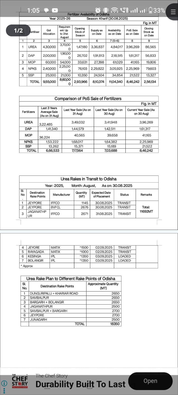 ମୁଖ୍ୟମନ୍ତ୍ରୀଙ୍କ ନିର୍ଦ୍ଦେଶକ୍ରମେ ଖରିଫ ୨୦୨୫ରେ ସାର ଯୋଗାଣ ସ୍ଥିତି ତ୍ୱରାନ୍ୱିତ- ପ୍ରତ୍ୟକ୍ଷ ରୂପେ ନିୟମିତ ଭାବେ ସାର ଯୋଗାଣ ସ୍ଥିତିର ସମୀକ୍ଷା କରୁଛନ୍ତି ଉପମୁଖ୍ୟମନ୍ତ୍ରୀ ଶ୍ରୀ କେ ଭି ସିଂହଦେଓ- ରାଜ୍ୟରେ ପର୍ଯ୍ୟାପ୍ତ ପରିମାଣର ସାର ଅଛି ।- ବିଭିନ୍ନ ଗ୍ରେଡର ୮.୪୬ ଲକ୍ଷ ମେଟ୍ରିକ ଟନ ସାର ଚାଷୀଙ୍କୁ ବିକ୍ରୟ ସରିଛି- କଳାବଜାରୀ/ନକଲି ସାରର ବିକ୍ରୟ ଉପରେ ରୋକ ପାଇଁ ଏନଫୋର୍ସମେଣ୍ଟ ଟିମର ଚଢ଼ାଉ ଜାରି- ଏଯାବତ ୧୨୦୨ ଖୁଚୁରା ବ୍ୟବସାୟୀଙ୍କୁ କାରଣ ଦର୍ଶାଓ ନୋଟିସ- ୩୦ ଟି ଦୋକାନ ବିକ୍ରୟ ବନ୍ଦ,୬୨ଟି ଡିଲର ଲାଇସେନ୍ସକୁ ନିଲମ୍ବିତ/ବାତିଲଭୁବନେଶ୍ୱର- ୩୧/୦୮/୨୦୨୫ମାନ୍ୟବର ମୁଖ୍ୟମନ୍ତ୍ରୀଙ୍କ ନିର୍ଦ୍ଦେଶକ୍ରମେ ସାରା ରାଜ୍ୟକୁ ସାର ଯୋଗାଣସ୍ଥିତି ତ୍ୱରାନ୍ୱିତ କରାଯାଇଛି । ସରକାରୀ ତଥ୍ୟ ଅନୁଯାୟୀ ରାଜ୍ୟରେ ପର୍ଯ୍ୟାପ୍ତ ପରିମାଣର ସାର ମହଜୁଦ ଅଛି । କିନ୍ତୁ ରାଜ୍ୟରେ ସାରର କୃତ୍ରିମ ଅଭାବ ଦର୍ଶାଇ ଚାଷୀ ଭାଇ ଭଉଣୀଙ୍କୁ କୌଣସି ପ୍ରକାର ବିଭ୍ରାନ୍ତିକର ତଥ୍ୟ ପ୍ରଦାନ କରି ଭୟଭୀତ ନ କରିବାକୁ ବିଭାଗ ତରଫରୁ ଅନୁରୋଧ କରାଯାଉଛି ।ଓଡ଼ିଶା ସରକାରଙ୍କ କୃଷି ଓ କୃଷକ ସଶକ୍ତିକରଣ ବିଭାଗ ଦ୍ୱାରା ୨୦୨୫ ପାଇଁ ୫୮.୫୦ ଲକ୍ଷ ହେକ୍ଟର ଖରିଫ ଫସଲ ଯୋଜନା (ଧାନ-୩୪.୯୪ ଲକ୍ଷ ହେକ୍ଟର ଏବଂ ଅଣ-ଧାନ ଫସଲ- ୨୩.୫୬ ଲକ୍ଷ ହେକ୍ଟର) ରହିଛି। ତଦନୁସାରେ, ରାଜ୍ୟକୁ ଆବଣ୍ଟନ ପାଇଁ ୧୦.୦୦ ଲକ୍ଷ ମେଟ୍ରିକ ଟନ୍ ସାର ଯୋଗାଣ ଯୋଜନା ପ୍ରସ୍ତୁତ କରାଯାଇ ଭାରତ ସରକାରଙ୍କୁ ପ୍ରଦାନ କରାଯାଇଥିଲା। ଭାରତ ସରକାର ଖରିଫ ଋତୁ ପାଇଁ ମାସିକ ଫସଲ କଭରେଜ ଉପରେ ଆଧାର କରି ରାଜ୍ୟକୁ ବିଭିନ୍ନ ଗ୍ରେଡର (ସିଧା ଏବଂ କମ୍ପ୍ଲେକ୍ସ ସାର) ୯.୫୫ ଲକ୍ଷ ମେଟ୍ରିକ ଟନ୍ ସାର ଆବଣ୍ଟନ କରିଥିଲେ। ଖରିଫ କାର୍ଯ୍ୟ ଆରମ୍ଭ ହେବା ପୂର୍ବରୁ ରାଜ୍ୟ ପକ୍ଷରୁ ମାର୍କଫେଡ଼/ପାକ୍ସ/ଲ୍ୟାମ୍ପସ/ଖୁଚୁରା ଡିଲରମାନଙ୍କ ନିକଟରେ ବିଭିନ୍ନ ସାର ଉପଲବ୍ଧ କରାଇବା ପାଇଁ ପର୍ଯ୍ୟାପ୍ତ ପଦକ୍ଷେପ ଗ୍ରହଣ କରାଯାଇଛି।୦୧.୦୪.୨୦୨୫ ସୁଦ୍ଧା, ବିଭିନ୍ନ ଜିଲ୍ଲାରେ ୨.୯୪ ଲକ୍ଷ ମେଟ୍ରିକ୍ ଟନ୍ ସାର (ୟୁରିଆ: ୧,୪୭ ଲକ୍ଷ ମେଟ୍ରିକ୍ ଟନ୍; DAP: ୦.୨୬ ଲକ୍ଷ ମେଟ୍ରିକ୍ ଟନ୍; MOP: ୦.୩୪ ଲକ୍ଷ ମେଟ୍ରିକ୍ ଟନ୍; SSP: ୦.୧୦ ଲକ୍ଷ ମେଟ୍ରିକ୍ ଟନ୍ ଏବଂ NP/NPK/NPKS: ୦.୭୬ ଲକ୍ଷ ମେଟ୍ରିକ୍ ଟନ୍) ପ୍ରସ୍ତୁତ କରାଯାଇଥିଲା। ଯୋଜନା ଅନୁଯାୟୀ, ଅଗଷ୍ଟ ମାସ ଶେଷ ସୁଦ୍ଧା ଓଡ଼ିଶାକୁ ୮.୬୦ ଲକ୍ଷ ମେଟ୍ରିକ୍ ଟନ୍ ସାର ମିଳିବା ଉଚିତ। ଏଥିମଧ୍ୟରୁ ରାଜ୍ୟ ପୂର୍ବରୁ ୮.୧୦ ଲକ୍ଷ ମେଟ୍ରିକ୍ ଟନ୍ ସାର ପାଇସାରିଛି ଯାହା ଦ୍ୱାରା ମୋଟ ସାରର ଉପଲବ୍ଧତା ୧୧.୦୪ ଲକ୍ଷ ମେଟ୍ରିକ୍ ଟନ୍ (ୟୁରିଆ: ୪.୮୪ ଲକ୍ଷ ମେଟ୍ରିକ୍ ଟନ୍; DAP: ୨.୧୮ ଲକ୍ଷ ମେଟ୍ରିକ୍ ଟନ୍; MOP: ୦.୬୧ ଲକ୍ଷ ମେଟ୍ରିକ୍ ଟନ୍; SSP: ୦.୩୪ ଲକ୍ଷ ମେଟ୍ରିକ୍ ଟନ୍ ଏବଂ NP/NPK/NPKS: ୩.୦୫ ଲକ୍ଷ ମେଟ୍ରିକ୍ ଟନ୍) ଗତକାଲି ସୁଦ୍ଧା ବୃଦ୍ଧି ପାଇଛି। ଉପରୋକ୍ତ ପରିମାଣର ସାର ମଧ୍ୟରୁ, ୮.୪୬ ଲକ୍ଷ ମେଟ୍ରିକ ଟନ୍ ବିଭିନ୍ନ ଗ୍ରେଡ୍ ସାର (ୟୁରିଆ: ୩.୯୬ ଲକ୍ଷ ମେଟ୍ରିକ ଟନ୍; DAP: ୧.୬୧ ଲକ୍ଷ ମେଟ୍ରିକ ଟନ୍; MOP: ୦.୪୧ ଲକ୍ଷ ମେଟ୍ରିକ ଟନ୍; SSP: ୦.୨୧ ଲକ୍ଷ ମେଟ୍ରିକ ଟନ୍ ଏବଂ NP/NPK/NPKS: ୨.୨୫ ଲକ୍ଷ ମେଟ୍ରିକ ଟନ୍) ଚାଷୀମାନଙ୍କୁ ବିକ୍ରୟ କରାଯାଇଛି ଏବଂ ଆଜି ସୁଦ୍ଧା ବିଭିନ୍ନ ଜିଲ୍ଲାରେ ୨.୫୬ ଲକ୍ଷ ମେଟ୍ରିକ ଟନ୍ ସାର ଉପଲବ୍ଧ ଅଛି (ୟୁରିଆ: ୦.୮୬ ଲକ୍ଷ ମେଟ୍ରିକ ଟ