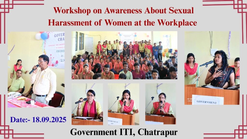 କର୍ମସ୍ଥଳୀରେ ମହିଳାମାନଙ୍କ ଯୌନ ନିର୍ଯାତନା ବିଷୟରେ ସଚେତନତା ବୃଦ୍ଧି କରିବା ପାଇଁ ସରକାରୀ ITI ଛତ୍ରପୁରରେ ଏକ ଗୁରୁତ୍ୱପୂର୍ଣ୍ଣ କର୍ମଶାଳା ଆୟୋଜନ କରାଯାଇଥିଲା। ଏହି ଅଧିବେଶନର ଲକ୍ଷ୍ୟ ଥିଲା ବ୍ୟକ୍ତିମାନଙ୍କୁ ଏହି ପ୍ରକାରର ସମସ୍ୟାଗୁଡ଼ିକୁ ଚିହ୍ନଟ କରିବା, ରୋକିବା ଏବଂ ସମାଧାନ କରିବା ବିଷୟରେ ଶିକ୍ଷା ଏବଂ ସଶକ୍ତ କରିବା।
