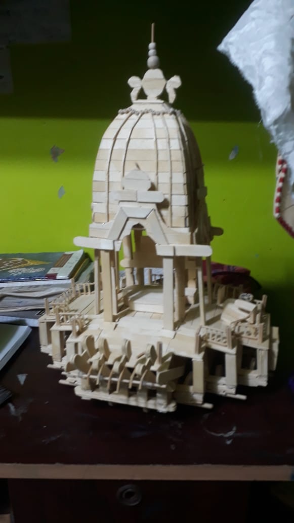 ଚଳିତବର୍ଷ ବିନା ଭକ୍ତରେ ମହାପ୍ରଭୁଙ୍କ ବିଶ୍ୱପ୍ରସିଦ୍ଧ ରଥଯାତ୍ରା ଅନୁଷ୍ଠିତ ହେବ।ଏହା ପୂର୍ବରୁ ପୁରୀର ଯୁବଶିଳ୍ପୀ ମହାପ୍ରଭୁଙ୍କ ବିଭିନ୍ନ ଚିତ୍ର ଓ ମୂର୍ତ୍ତି ଆଙ୍କି ଭକ୍ତଙ୍କ ଉଦ୍ଧେଶ୍ୟରେ ସମର୍ପଣ କରୁଛନ୍ତି।ଏଭଳି ଆଉ ଜଣେ ଯୁବଶିଳ୍ପୀ ହେଉଛନ୍ତି ପୁରୀ ମରିଚିକୋଟ ଲେନର ସୁସ୍ମିତା ମହାରଣା।ଆଇସକ୍ରିମ କାଠିରେ ମହାପ୍ରଭୁଙ୍କ ନନ୍ଦିଘୋଷ ରଥ ନିର୍ମାଣ କରି ଭକ୍ତଙ୍କ ପାଇଁ ଉତ୍ସର୍ଗ କରିଛନ୍ତି।୩୨ଇଞ୍ଚ ଉଚ୍ଚତା ଓ ୨୪ଇଞ୍ଚ ଚଉଡା ବିଶିଷ୍ଟ ଏହି କଳାକୃତି ତିଆରି ପାଇଁ ଶିଳ୍ପୀ ସୁସ୍ମିତାଙ୍କୁ ୭ଦିନ ସମୟ ଲାଗିଥିଲା।ଆଜି ସେ ଏହି କଳାକୃତି ସହ ବଡଦାଣ୍ଡରେ ମହାପ୍ରଭୁଙ୍କ ନନ୍ଦିଘୋଷ ରଥ ନିକଟରେ ପ୍ରଦର୍ଶନ କରିଥିଲେ।ଅଦରକାରୀ ଆଇସକ୍ରିମ କାଠିରେ ପ୍ରସ୍ତୁତ ହୋଇଥିବା ଏହି କଳାକୃତି ବେଶ ସୁନ୍ଦର ଓ ଆକର୍ଷଣୀୟ ହୋଇପାରିଛି।ଏହି କଳାକୃତି ଦେଖିବା ପାଇଁ ରଥ ନିକଟରେ ସ୍ଥାନୀୟ ଲୋକଙ୍କ ଭିଡ଼ ଲାଗିଥିଲା।