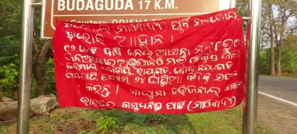 କନ୍ଧମାଳ ଜିଲ୍ଲା ରେ ପୁଣି ମାଓବାଦୀ ଙ୍କ ପୋଲିସ ଙ୍କୁ ଖୋଲା ଚ୍ୟାଲେଞ୍ଜ ଦାରିଙ୍ଗବାଡ଼ି ଥାନା ଓ କୋଟଗଡ଼ ଥାନା ଅଞ୍ଚଳରେ ଏକାଧିକ ସ୍ଥାନରେ ମାଓବାଦୀ ଙ୍କ ତରଫରୁ ଲାଲ ବ୍ୟାନର ପୋଷ୍ଟର ଲଗାଯାଇଛି l ୫୯ନଂ ଜାତୀୟ ରାଜପଥ ର ସିମନବାଡ଼ି ଟୋଲଗେଟ ନିକଟ ରେ ଓ ବୁଡ଼ାଗୁଡ଼ା ଛକ ରେ ଏବଂ କୋଟଗଡ଼ ଥାନା ଅଞ୍ଚଳ ର ବଣ୍ଡା ପିପିଲି ଅଞ୍ଚଳରେ ୧୨ଦଫା ଦାବି ନେଇ ଆସନ୍ତା କାଲି ମେ୧୫ ତାରିଖରେ ୭ଜିଲ୍ଲା ବନ୍ଦ ଡାକରା ଦେଇଛି ସିପିଆଇ ମାଓବାଦୀ ୭ଜିଲ୍ଲା ମଧ୍ୟରେ କନ୍ଧମାଳ ଗଜପତି ଗଞ୍ଜାମ ରାୟଗଡ଼ା ବୌଦ୍ଧ କଳାହାଣ୍ଡି ନୟାଗଡ଼ ଜିଲ୍ଲା ବନ୍ଦ ଡାକରା ଦେଇଛନ୍ତି ମାଓବାଦୀ ସଙ୍ଗଠନ l