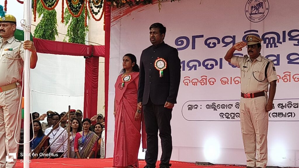 ବ୍ରହ୍ମପୁର :-୧୬/୦୮ ଏହି ୭୮ତମ ସ୍ଵାଧୀନତା ଦିବସରେ ବ୍ରହ୍ମପୁର ସ୍ଥିତ ଖଲ୍ଲିକୋଟ କଲେଜ ପଡିଆ ଠାରେ ଗଞ୍ଜାମ ଜିଲ୍ଲାପାଳ , ଶ୍ରୀଯୁକ୍ତ ଦିବ୍ୟଜ୍ୟୋତି ପରିଡ଼ା, ଭା.ପ୍ର.ସେ, ଯୋଗଦେଇ ସ୍ବାଭିମାନର ପ୍ରତୀକ ଜାତୀୟ ପତାକା ଉତ୍ତୋଳନ ପୂର୍ବକ ଅଭିବାଦନ ଗ୍ରହଣ କରି ଜାତି ଉଦ୍ଦେଶ୍ୟରେ ସମବେତ ଜନତାଙ୍କୁ ନିଜ ଉଦ୍ବୋଧନରେ ଜାତିର ଜନକ ମହତ୍ମା ଗାନ୍ଧୀଙ୍କ ଅହିଂସା ମହାମନ୍ତ୍ରକୁ ଆୟୁଧ କରି କିଭଳି ଦେଶ ସ୍ଵାଧୀନ ହେଲା ଏବଂ ସ୍ଵାଧୀନତା ସଂଗ୍ରାମୀ ମାନଙ୍କ ଗୁଣଗାନ କରି ଇତିହାସରେ ଗୁଞ୍ଜରିତ ହୋଇଥିବା କାହାଣୀ ଅବଗତ କରାଇ, ଗଞ୍ଜାମ ମାଟିର ସ୍ଵାଧୀନତା ସଂଗ୍ରାମୀଙ୍କ ବଳିଷ୍ଠ ବଳିଦାନକୁ ଶ୍ରଦ୍ଧାଞ୍ଜଳୀ ଜଣାଇଥିଲେ ।
