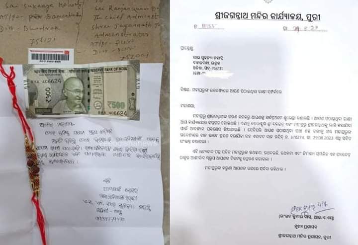 ଭଦ୍ରକ ତିହିଡ଼ି ଅଞ୍ଚଳର କୁନିଝିଅ ସାଇ ସୁକନ୍ୟା ମହାନ୍ତିଙ୍କ ଶ୍ରୀମନ୍ଦିର ପ୍ରଶାସନକୁ ସୁନ୍ଦର ଚିଠି, ଉତ୍ତର ରଖିଲା ପ୍ରଶାସନ। ଚିଠିରେ ଲେଖାଥିଲା “ଅଙ୍କଲ ମୋର ଭୂମିଷ୍ଠ ପ୍ରଣାମ ଗ୍ରହଣ କରିବେ। ମୁଁ ପଠାଇଥିବା ଦୁଇଟି ରାକ୍ଷୀକୁ ମୋ ଦୁଇଭାଇ ଜଗା ବଳିଆକୁ ପିନ୍ଧାଇଦେବେ। ଆଉ ପଠାଇଥିବା ୫ଶହ ଟଙ୍କାରେ ଭାଇଭଉଣୀଙ୍କୁ ଲଡୁ ଖୁଆଇ ଦେବେ । ଅପରପକ୍ଷେ କୁନିଝିଅର ଗୁହାରୀ ଶୁଣିଲେ ବଡ଼ଠାକୁର, ହତାରେ ରାକ୍ଷୀ ବାନ୍ଧିଲେ ଦୁଇ ଭାଇ ପ୍ରଭୁ ବଳଭଦ୍ର ଓ ଜଗନ୍ନାଥ । ଏଥିସହ କୁନିଝିଅ ଚିଠିର ପ୍ରତ୍ୟୁତ୍ତର ଦେଲା ମନ୍ଦିର ପ୍ରଶାସନ ।