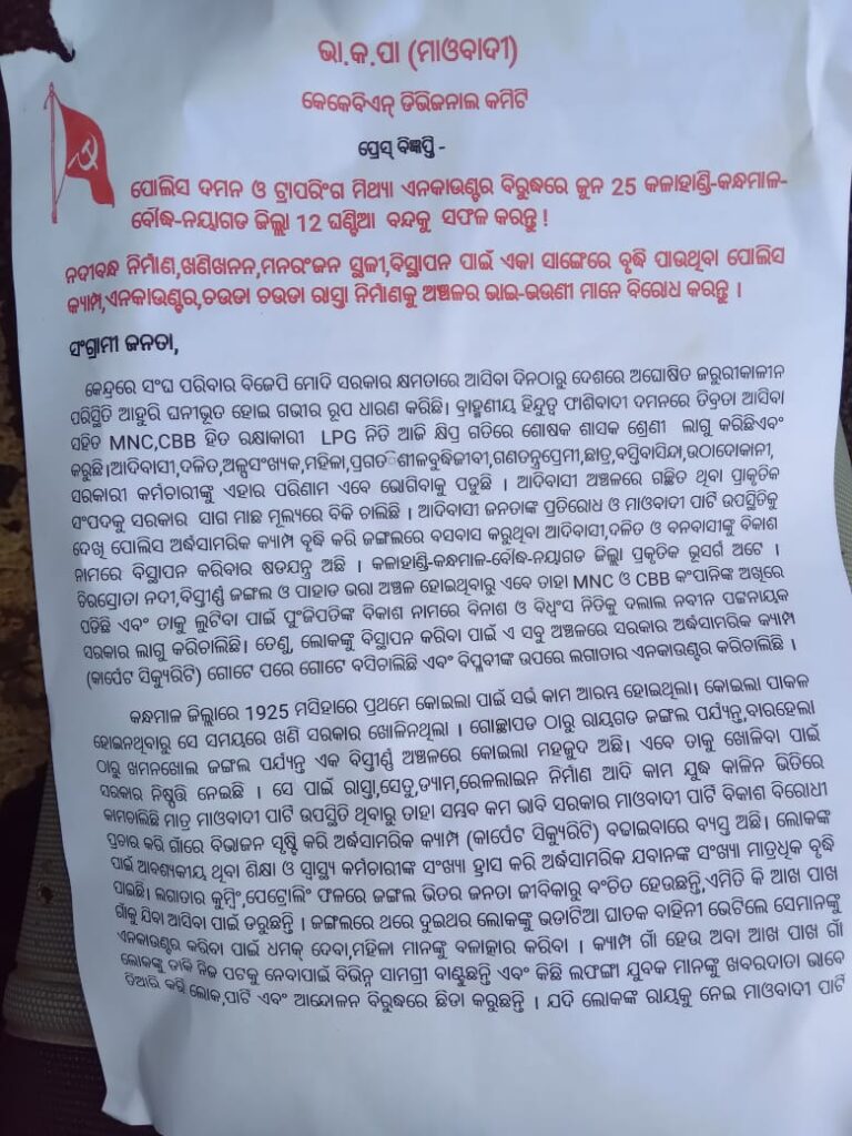ପୋଲିସର ଦମନ ଓ ମିଥ୍ୟା ଏନକାଉଣ୍ଡ ର ବିରୋଧରେ କନ୍ଧମାଳ ଜିଲ୍ଲା କଳାହାଣ୍ଡି ବୌଦ୍ଧ ଓ ନୟାଗଡ଼ ଜିଲ୍ଲାକୁ 12ଘଣ୍ଟା ବନ୍ଦ ଡାକରା ନେଇ ମାଓବାଦୀ ଙ୍କ ଏହିଭଳି ପୋଷ୍ଟର ଉଲେଖ ରହିଅଛି ଏହି ପୋଷ୍ଟର ଦେଖିବା ପରେ ସ୍ଥାନିୟ ଲୋକ ଭୟ ଭିତହୋଇ ଯାଇଥିବା ଜଣା ପଡ଼ିଛି । ବାଲିଗୁଡ଼ାରୁ ଲଣ୍ଡାଗାଁ , ବଲାଙ୍ଗିର, ସମ୍ବଲପୁର ଯିବା ଆସିବା ଯାନବାହାନା ବନ୍ଦ ରହିଛି ।