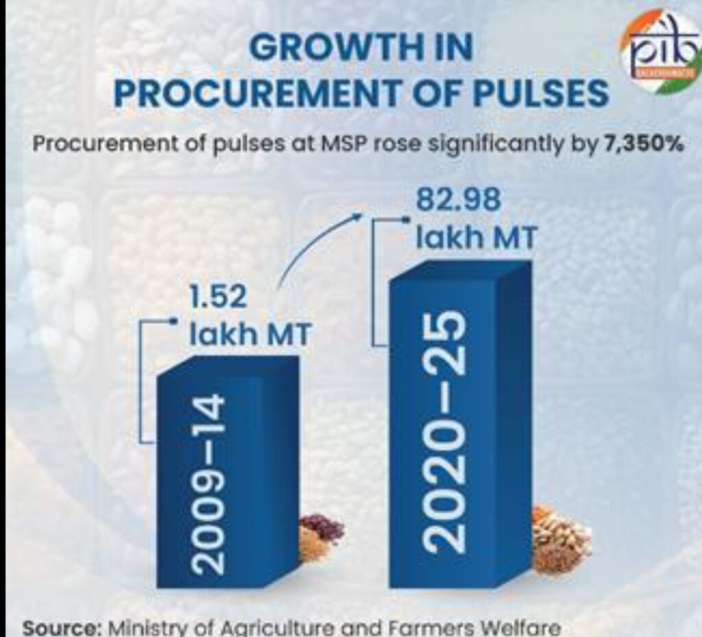 ପ୍ରଧାନମନ୍ତ୍ରୀ ଅନ୍ନଦାତା ଆୟ ସଂରକ୍ଷଣ ଅଭିଯାନ ବା ପିଏମ ଆଶା ଜରିଆରେ ଚାଷୀଙ୍କୁ ସେମାନଙ୍କ ଉତ୍ପାଦର ଲାଭଜନକ ମୂଲ୍ୟ ସୁନିଶ୍ଚିତ କରିବା ଲାଗି ପଦକ୍ଷେପ ନିଆଯାଉଛି। ଏହା ଅଧୀନରେ ମୂଲ୍ୟ ସମର୍ଥନ ଯୋଜନା କାର୍ଯ୍ୟକାରୀ କରାଯାଇ ନାଫେଡ ଓ ଏନସିସିଏଫ ଆଦି ମାଧ୍ୟମରେ ଡାଲି, ତୈଳବୀଜ ଓ ଗୋଟା ନଡ଼ିଆର କ୍ରୟ କରାଯାଉଛି। କପା ଏବଂ ଝୋଟ ଯଥାକ୍ରମେ ଭାରତୀୟ କପା ନିଗମ (ସିସିଆଇ) ଏବଂ ଭାରତୀୟ ଝୋଟ ନିଗମ (ଜେସିଆଇ) ମାଧ୍ୟମରେ ଏମଏସପିରେ କ୍ରୟ କରାଯାଉଛି। ଚାଷୀଙ୍କ ସହଯୋଗରେ ଭାରତ ଡିସେମ୍ବର 2027 ପୂର୍ବରୁ ଡାଲି କ୍ଷେତ୍ରରେ ‘ଆତ୍ମନିର୍ଭର’ କରିବାକୁ ଗୁରୁତ୍ୱାରୋପ କରାଯାଇଛି। ଏହା ହାସଲ କରିବା ପାଇଁ, ସରକାର 2025 ବଜେଟରେ ଘୋଷଣା କରିଥିଲେ ଯେ ରାଜ୍ୟର ଉତ୍ପାଦନର 100% ହରଡ଼, ବିରି ଏବଂ ମସୁର ଚାରି ବର୍ଷ ପାଇଁ 2028-29 ପର୍ଯ୍ୟନ୍ତ ସଂଗ୍ରହ କରାଯିବ। ଏହି ପ୍ରତିଶ୍ରୁତି ଅନୁଯାୟୀ, ସରକାର ସର୍ବନିମ୍ନ ସହାୟକ ମୂଲ୍ୟରେ ଡାଲି ସଂଗ୍ରହ ପାଇଁ ପିଏମ ଆଶା ଗ୍ୟାରେଣ୍ଟିକୁ 45,000 କୋଟି ଟଙ୍କାରୁ 60,000 କୋଟି ଟଙ୍କାକୁ ବୃଦ୍ଧି କରିଛନ୍ତି। 25 ମାର୍ଚ୍ଚ 2025 ସୁଦ୍ଧା, ପାଞ୍ଚଟି ରାଜ୍ୟ (ଆନ୍ଧ୍ର ପ୍ରଦେଶ, ଗୁଜରାଟ, କର୍ଣ୍ଣାଟକ, ମହାରାଷ୍ଟ୍ର ଏବଂ ତେଲଙ୍ଗାନା)ର ଚାଷୀଙ୍କଠାରୁ ମୋଟ 2.46 ଲକ୍ଷ ମେଟ୍ରିକ୍ ଟନ୍ ତୁର (ଅର୍ହର) ସଂଗ୍ରହ କରାଯାଇଛି, ଯାହା 1,71,569 ଚାଷୀଙ୍କୁ ଲାଭ ଦେଇଛି। ଏମଏସପିରେ ଡାଲି ସଂଗ୍ରହରେ ଉଲ୍ଲେଖନୀୟ 7,350% ବୃଦ୍ଧି ଘଟିଛି, ଯାହା 2009–14ରେ 1.52 ଲକ୍ଷ ମେଟ୍ରିକ୍ ଟନ୍ ଥିଲା ଏବଂ 2020–25 ସମୟରେ ଏହା 82.98 ଲକ୍ଷ ମେଟ୍ରିକ୍ ଟନ୍ ହୋଇଛି। ସେହିପରି, ଗତ 11 ବର୍ଷ ମଧ୍ୟରେ ଏମଏସପିରେ ତୈଳବୀଜ ସଂଗ୍ରହରେ 1500% ରୁ ଅଧିକ ବୃଦ୍ଧି ଘଟିଛି।ଧାନ ସଂଗ୍ରହ ମଧ୍ୟ ଯଥେଷ୍ଟ ବୃଦ୍ଧି ପାଇଛି। 2004–14, ମଧ୍ୟରେ 4,590 ଲକ୍ଷ ମେଟ୍ରିକ୍ ଟନ୍ ଧାନ ସଂଗ୍ରହ ହୋଇଥିଲା, ଯାହା 2014–25 ମଧ୍ୟରେ 7,608 ଲକ୍ଷ ମେଟ୍ରିକ୍ ଟନ୍ କୁ ବୃଦ୍ଧି ପାଇଛି। ଏହି ଅଭିବୃଦ୍ଧି ଚାଷୀମାନଙ୍କୁ ଦିଆଯାଇଥିବା ଏମଏସପି ଦେୟରେ ପ୍ରତିଫଳିତ ହୋଇଛି, ଯାହା କେବଳ ଧାନ ପାଇଁ 2004-14 ମଧ୍ୟରେ 4.44 ଲକ୍ଷ କୋଟି ଟଙ୍କାରୁ 2014-25 ମଧ୍ୟରେ 14.16 ଲକ୍ଷ କୋଟି ଟଙ୍କାକୁ ବୃଦ୍ଧି ପାଇଛି। 14ଟି ଖରିଫ ଫସଲ ପାଇଁ ମିଳିତ କ୍ରୟ, 2004–14 ସମୟରେ 4,679 ଲକ୍ଷ ମେଟ୍ରିକ୍ ଟନ୍ ରୁ 2014–25 ମଧ୍ୟରେ 7,871 ଲକ୍ଷ ମେଟ୍ରିକ୍ ଟନ୍ କୁ ବୃଦ୍ଧି ପାଇଛି। ଏହାର ଏମଏସପି ଦେୟ 4.75 ଲକ୍ଷ କୋଟି ଟଙ୍କାରୁ ବୃଦ୍ଧି ପାଇ 16.35 ଲକ୍ଷ କୋଟି ଟଙ୍କା ହୋଇଛି। ସେହିପରି 2024-25 ରବି ବିପଣନ ଋତୁରେ 266 ଲକ୍ଷ ମେଟ୍ରିକ ଟନ ଗହମ କିଣାଯାଇଥିଲା। ଏହା ମାଧ୍ୟମରେ 61 ଲକ୍ଷ କୋଟି ଟଙ୍କାରୁ ଅଧିକ ଏମଏସପି ସିଧାସଳଖ 22 ଲକ୍ଷ ଚାଷୀଙ୍କ ବ୍ୟାଙ୍କ ଆକାଉଣ୍ଟକୁ ହସ୍ତାନ୍ତର କରାଯାଇଥିଲା। ସାମଗ୍ରିକ ଭାବରେ, ଖାଦ୍ୟଶସ୍ୟ ସଂଗ୍ରହ ସ୍ଥିର ଭାବରେ ବୃଦ୍ଧି ପାଇଛି, ଯାହା 2014–15 ରେ 761.40 ଲକ୍ଷ ମେଟ୍ରିକ୍ ଟନ୍ ରୁ 2024-25 (ଜୁଲାଇ ରୁ ଜୁନ୍ ପର୍ଯ୍ୟନ୍ତ) ରେ 1,175 ଲକ୍ଷ ମେଟ୍ରିକ୍ ଟନ୍ ରେ ପହଞ୍ଚିଛି। ଏହି ସମ୍ପ୍ରସାରଣ 1.84 କୋଟି ଚାଷୀଙ୍କୁ ଲାଭ ଦେଇଛି। ସର୍ବନିମ୍ନ ସହାୟକ ମୂଲ୍ୟରେ କ୍ରୟ ପାଇଁ ହୋଇଥିବା ଖର୍ଚ୍ଚ ତିନିଗୁଣରୁ ଅଧିକ ହୋଇଛି, ଯାହା ସେହି ସମୟ ମଧ୍ୟରେ 1.06 ଲକ୍ଷ କୋଟି ଟଙ୍କାରୁ ବୃଦ୍ଧି ପାଇ 3.33 ଲକ୍ଷ କୋଟି ଟଙ୍କାରେ ପହଞ୍ଚିଛି। ଏମଏସପି ହସ୍ତାନ୍ତର ଯୋଗୁ 2024-25ରେ ପ୍ରାୟ 1.84 କୋଟି ଚାଷୀ ଉପକୃତ ହୋଇଛନ୍ତି। ଏମଏସପି କ୍ରୟରେ ସ୍ୱଚ୍ଛତା ଆଣିବା ଲାଗି ସରକାର ଇ-ସମ