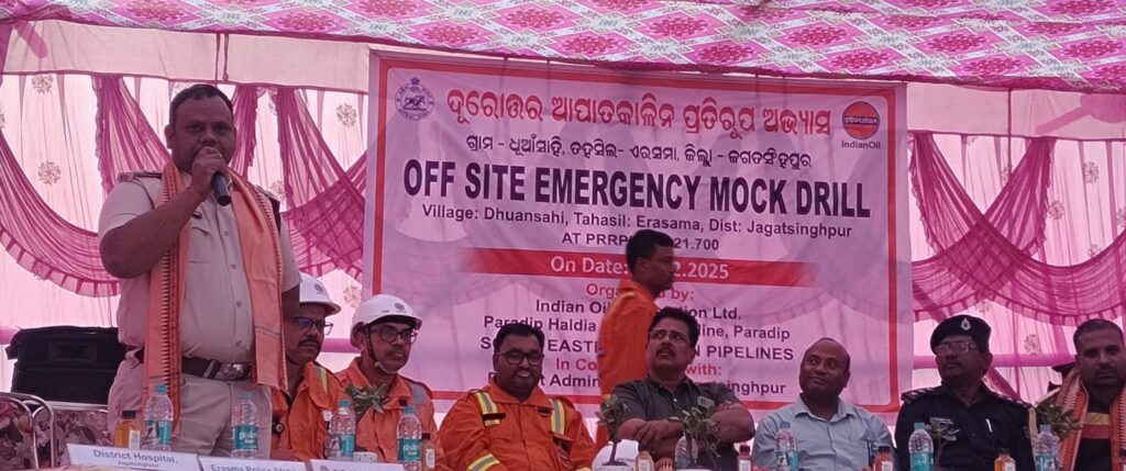 ଏରସମା:ଜଗତସିଂହପୁର ଜିଲ୍ଲା ଏରସମା ବ୍ଲକ ଅନ୍ତର୍ଗତ ନୁହାଡି ପଂଚାୟତ ରେ ଇଣ୍ଡିଆନ ଅଏଲ କର୍ପୋରେସନ ଲିମିଟେଡ଼ ପକ୍ଷରୁ ଦୁରୋତ୍ୱର ଆପତକାଳୀନ ପ୍ରତିରୂପ ଅଭ୍ୟାସ କାର୍ଯ୍ୟକ୍ରମ ଜିଲ୍ଲା ପ୍ରଶାସନ ସହଯୋଗ ରେ ଅନୁଷ୍ଠିତ ହୋଇଯାଇଛି।ଏହି କାର୍ଯ୍ୟକ୍ରମ ରେ ଡେପୁଟି ଡାଇରେକ୍ଟର ଏସ ଏଚ ମନୋଜ ପଣ୍ଡା, ,ଇଣ୍ଡିଆନ ଅଏଲ ର ଜିଏମ ଚେତନ ଖଡ଼ୱେ, ସହ ନିର୍ଦେଶକ ଚନ୍ଦ୍ରଶେଖର ବେହେରା,ଉପ ମହାପ୍ରବନ୍ଧକ, ପାରାଦ୍ୱୀପ ଷ୍ଟେସନ ଇନଚାର୍ଜ,ଓଡ୍ରାଫ, ବିପିସିଲ୍, ଇଫକୋ, ପିପିଏଲ, ଆଶ୍ରେଲ ମିତ୍ତଲ, ନିପନ୍ ଷ୍ଟିଲ, ଓଡ୍ରାଫ ଟିମ୍ଫାୟର ଆଣ୍ଡ ସେଫ୍ଟି ଡିଭିଜନ, ଜଗତସିଂହପୁର ମେଡିକାଲ ଅଧିକାରୀ,ଏରସମା ଏବଂ କୁଜଙ୍ଗ ଅଗ୍ନିଶମ ବିଭାଗ, ସ୍ଥାନୀୟ ସରପଞ୍ଚ ସହ ଏରସମା ପୋଲିସ ଅଧିକାରୀ ପ୍ରେମଜିତ ଦାସ ଉପସ୍ଥିତ ଥିଲେ। ପାରାଦ୍ୱୀପ ରୁ ଏରସମା ବ୍ଲକ ଏବଂ କୁଜଙ୍ଗ ବ୍ଲକ ମଧ୍ୟ ଦେଇ ଯାଇଥିବା ଦୁଇଟି ପାଇପଲାଇନ କୌଣସି କାରଣରୁ ଯଦି ଲିକେଜ୍ ହୁଏ କିମ୍ବା ନିଆଁ ଲାଗିଯାଏ ତେବେ କିପରି ଧନ ଜୀବନର ହାନି ନହେବ ସେ ଦୃଷ୍ଟିରୁ ଏକ ମକ୍ ଡ୍ରିଲ୍ ଆୟୋଜନ ହୋଇଥିଲା। ପାଇପଲାଇନ କୁ ନେଇ କିଛି ସନ୍ଦେହଜନକ କାର୍ଯ୍ୟକ୍ରମ ଦେଖିଲେ ଟୋଲଫ୍ରି ନମ୍ବର ୧୮୦୦୩୪୫୬୯୧୨ ରେ ଜଣାଇବା ପାଇଁ ଗ୍ରାମବାସୀ ମାନଙ୍କୁ ସୂଚିତ କରାଇବା ସହ ଉକ୍ତ ଜମିରେ କେଉଁ ଫସଲ କରିପାରିବେ ସେବିଷୟରେ ଆଲୋଚନା କରାଯାଇଥିଲ। ଉକ୍ତ କାର୍ଯ୍ୟକ୍ରମରେ ଶତାଧିକ ମହିଳା ଓ ପୁରୁଷମାନେ ଉପସ୍ଥିତ ରହି କାର୍ଯ୍ୟକ୍ରମରେ ଅଂଶଗ୍ରହଣ କରିଥିଲେ। ସୈାରଭ ଭଗତଙ୍କ ନେତୃତ୍ୱରେ ମଗଡ୍ରିଲ କ୍ରିୟା କରଣ ସଂମ୍ପର୍ଣ ହୋଇଥିଲା।
