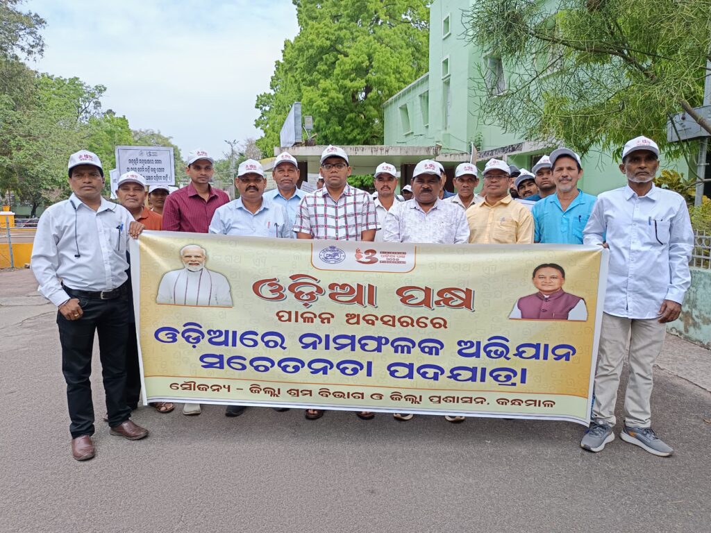 କନ୍ଧମାଳ ତା ୦୪/୦୪/୨୦୨୫ ଫୁଲବାଣୀ ଶ୍ରମ ଓ କର୍ମଚାରୀ ରାଜ୍ୟ ବୀମା ବିଭାଗ ଅନୁକୁଲ୍ୟରେ ଜିଲ୍ଲା ପ୍ରଶାସନ ଏବଂ ଜିଲ୍ଲା ଶ୍ରମ କାର୍ଯ୍ୟାଳୟ ତରଫରୁ ଅଦ୍ୟ ତା ଫୁଲବାଣୀ ୦୪/୦୪/୨୦୨୫.ରିଖରେ ଦୋକାନ ଓ ବାଣିଜ୍ୟ ପ୍ରତିଷ୍ଠାନ ମାନଙ୍କରେ ଓଡ଼ିଆ ଭାଷାରେ ନାମଫଳକ ପ୍ରଦର୍ଶନ ସୁନିଶ୍ଚିତ କରିବା ନିମନ୍ତେ ଏକ ସଚେତନତା ପଦଯାତ୍ରା ଅନୁଷ୍ଠିତ ହୋଇଯାଇଅଛି l ଏହି ପଦଯାତ୍ରା ଜିଲ୍ଲାପାଳଙ୍କ କାର୍ଯ୍ୟାଳୟରୁ ସକାଳ ୮.୩୦ ଘ. ସମୟରେ ବାହାରି ସର୍କିଟ ହାଉସ ନିକଟରେ ପହଞ୍ଚିଥିଲା l ଏହି କାର୍ଯ୍ୟକ୍ରମକୁ ଅତିରିକ୍ତ ଜିଲ୍ଲାପାଳ ଶ୍ରୀ କୁଶଳ ଚନ୍ଦ୍ର ନାୟକ, ଉପ ଜିଲ୍ଲାପାଳ ଶ୍ରୀ ଭିକାରି ଚରଣ ସାହୁ , ଜିଲ୍ଲା ସଂସ୍କୃତି, ସୂଚନା ଓ ଲୋକସମ୍ପକ ଅଧିକାରୀ ଶ୍ରୀ ଅକ୍ଷୟ କୁମାର ସେଠି ଏବଂ ଜିଲ୍ଲା ଶ୍ରମ ଅଧିକାରୀ (ଭାରପ୍ରାପ୍ତ), ଶ୍ରୀ ବିଶ୍ଵ ରଞ୍ଜନ କହଁର ସବୁଜ ପତାକା ଦେଖାଇ ଶୁଭାରମ୍ଭ କରିଥିଲେ l ଏହି ସଚେତନତା ପଦଯାତ୍ରାରେ ପ୍ରାୟ ୧୦୦ ଜଣ ମହାବିଦ୍ୟାଳୟ ଛାତ୍ର ଛାତ୍ରୀ, ଶ୍ରମିକ ସଂଗଠନର କର୍ମ କର୍ତା, ସମାଜ ସେବୀ ଏବଂ ଜନ ସାଧାରଣ ଏଥିରେ ଭାଗ ନେଇଥିଲେ l ସହକାରୀ ଶ୍ରମ ଅଧିକାରୀ, ଶ୍ରୀ ବିଭୁ ପ୍ରସାଦ ସ୍ୱାଇଁ, ଶ୍ରମ ବିଭାଗର ସମସ୍ତ କର୍ମଚାରୀ ବୃନ୍ଦ ଏବଂ ବିଭିନ୍ନ ସାମ୍ବାଦିକ ଏହି ସଚେତନତା ପଦଯାତ୍ରାରେ ଅଂଶଗ୍ରହଣ କରିଥିଲେ l ଶେଷରେ ଓଡ଼ିଆରେ ନାମଫଳକ ପ୍ରଦର୍ଶନ କରୁଥିବା କିଛି ବାଣିଜ୍ୟ ପ୍ରତିଷ୍ଠାନ ମାନଙ୍କୁ ମିଠା ପ୍ରଦାନ କରାଯାଇଥିଲା ଏବଂ ଅନ୍ୟମାନଙ୍କୁ ଓଡ଼ିଆ ନାମଫଳକ ପ୍ରଦର୍ଶନ ପାଇଁ ସଚେତନ କରାଯାଇ ଥିଲା |