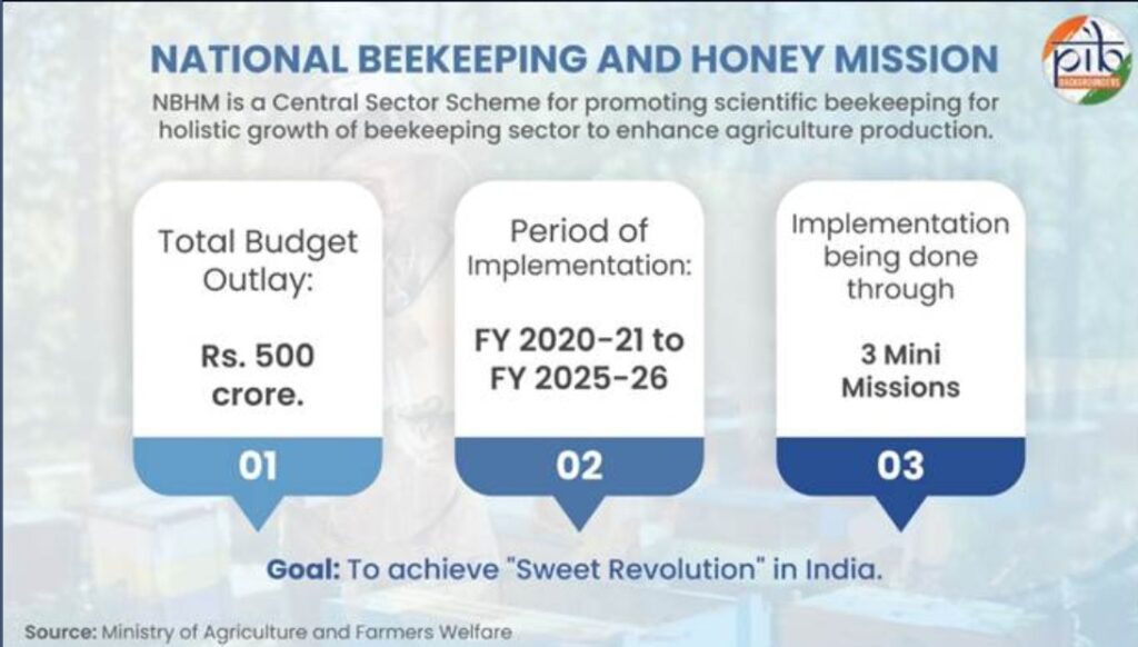 ଜାତୀୟ ମହୁମାଛି ପାଳନ ଓ ମଧୁ ମିଶନମଧୁର ବିପ୍ଳବର ଅୟମାରମ୍ଭ : ଏକ ନୂତନ ଭାରତ ପାଇଁ ଗୁଞ୍ଜରଣମୁଖ୍ୟାଂଶ• ଜାତୀୟ ମହୁମାଛି ପାଳନ ଏବଂ ମଧୁ ମିଶନ ଏକ କେନ୍ଦ୍ରୀୟ ପ୍ରାୟୋଜିତ ଯୋଜନା । ଏହାର ଲକ୍ଷ୍ୟ ହେଉଛି ବୈଜ୍ଞାନିକ ପଦ୍ଧତିରେ ମହୁମାଛି ପାଳନର ସାମଗ୍ରିକ ବିକାଶକୁ ପ୍ରୋତ୍ସାହିତ କରିବା । ଏହାର ମୂଳ ଲକ୍ଷ୍ୟ ହେଉଛି ଦେଶରେ ଏକ ମଧୁର ବିପ୍ଳବ ଆଣିବା।• ଏହି ମିଶନର ମୋଟ ବଜେଟ୍ ୫୦୦ କୋଟି ଟଙ୍କାର ବ୍ୟୟବରାଦ କରାଯାଇଛି ଏବଂ ଏହାକୁ ୨୦୨୦-୨୧ ଏବଂ ୨୦୨୫-୨୬ ମଧ୍ୟରେ କାର୍ଯ୍ୟକାରୀ କରାଯାଉଛି। ଜାତୀୟ ମହୁମାଛି ବୋର୍ଡ (ଏନବିବି) ଏହି ଜାତୀୟ ମହୁମାଛି ପାଳନ ଏବଂ ମଧୁ ମିଶନର କାର୍ଯ୍ୟକାରୀ ସଂସ୍ଥା।• ଜାତୀୟ ମହୁମାଛି ପାଳନ ଏବଂ ମଧୁ ମିଶନ ତିନୋଟି କ୍ଷୁଦ୍ର-ମିଶନ ମାଧ୍ୟମରେ କାର୍ଯ୍ୟକାରୀ କରାଯାଏ ଯାହା ଉତ୍ପାଦକତା ବୃଦ୍ଧି, ସଂଗ୍ରହ ପରବର୍ତ୍ତୀ ପରିଚାଳନା ଓ ଗବେଷଣା ଏବଂ ପ୍ରଯୁକ୍ତିବିଦ୍ୟା ଉନ୍ନତି ଉପରେ ଧ୍ୟାନ ଦେଇଥାଏ।• ୨୦୨୪ ମସିହାରେ ଭାରତ ୧.୪ ଲକ୍ଷ ମେଟ୍ରିକ୍ ଟନ୍ ପ୍ରାକୃତିକ ମହୁ ଉତ୍ପାଦନ କରିଥିଲା। • ୨୦୨୩-୨୪ ମସିହାରେ ଭାରତ ପ୍ରାୟ ୧୭୭.୫୫ ନିୟୁତ ଡଲାର ମୂଲ୍ୟର ୧.୦୭ ଲକ୍ଷ ମେଟ୍ରିକ୍ ଟନ୍ ପ୍ରାକୃତିକ ମହୁ ରପ୍ତାନି କରିଥିଲା। ୨୦୨୦ରେ ୯ମ ସ୍ଥାନରେ ଥିବା ଭାରତ ବର୍ତ୍ତମାନ ବିଶ୍ୱର ଦ୍ୱିତୀୟ ସର୍ବବୃହତ ମହୁ ରପ୍ତାନିକାରୀ ଦେଶ ।• ମହୁ ଏବଂ ଅନ୍ୟାନ୍ୟ ମହୁମାଛି ଉତ୍ପାଦର ଉତ୍ସର ଅନଲାଇନ୍ ପଞ୍ଜୀକରଣ ଏବଂ ସନ୍ଧାନ ପାଇଁ ମଧୁକ୍ରାନ୍ତି ପୋର୍ଟାଲ୍ ଆରମ୍ଭ କରାଯାଇଛି।ଉପକ୍ରମଜାତୀୟ ମହୁମାଛି ପାଳନ ଏବଂ ମହୁ ମିଶନ (NBHM) ଏକ କେନ୍ଦ୍ରୀୟ ପ୍ରାୟୋଜିତ ଯୋଜନା। ଭାରତ ସରକାର ଦେଶରେ ବୈଜ୍ଞାନିକ ଉପାୟରେ ମହୁମାଛି ପାଳନକୁ ପ୍ରୋତ୍ସାହିତ କରିବା ଏବଂ ଗୁଣାତ୍ମକ ମହୁ ଏବଂ ଅନ୍ୟାନ୍ୟ ମହୁମାଛି ଆଧାରିତ ଉତ୍ପାଦ ଉତ୍ପାଦନକୁ ଉତ୍ସାହିତ କରିବା ପାଇଁ ଏହି ଯୋଜନା ଆରମ୍ଭ କରିଥିଲେ। ଜାତୀୟ ମହୁମାଛି ବୋର୍ଡ ଦ୍ୱାରା କାର୍ଯ୍ୟକାରୀ, ଏହି ଯୋଜନା ଆତ୍ମନିର୍ଭର ଭାରତ ବ୍ୟାନର ଅଧିନରେ ୫୦୦ କୋଟି ଟଙ୍କା ବ୍ୟୟବରାଦରେ କାର୍ଯ୍ୟକାରୀ ହେଉଛି। ୨୦୨୦-୨୧ରେ ଆରମ୍ଭ ହୋଇଥିବା ଏହି ଯୋଜନାଟି ପ୍ରାରମ୍ଭରେ ତିନି ବର୍ଷ ପାଇଁ ଆରମ୍ଭ କରାଯାଇଥିଲା, କିନ୍ତୁ ପର୍ଯ୍ୟାପ୍ତ ବଜେଟ୍ ନ ଥିବାରୁ ଏହାର ଅବଧି ଆଉ ତିନି ବର୍ଷ ପାଇଁ ବୃଦ୍ଧି କରାଯାଇଥିଲା।ମହୁମାଛି ପାଳନ ଏକ କୃଷି କାର୍ଯ୍ୟକଳାପ ଯାହାକୁ ଚାଷୀ ଓ ଭୂମିହୀନ ଶ୍ରମିକମାନେ ଗ୍ରାମାଞ୍ଚଳରେ କରିଥାନ୍ତି । ଏହା ସମନ୍ବିତ କୃଷି ବ୍ୟବସ୍ଥାର ଏକ ଅଭିନ୍ନ ଅଂଗ । ଏହା ଅନେକ ଗଛର ପରାଗସଂଗମ ପ୍ରକ୍ରିୟାରେ ଏକ ଗୁରୁତ୍ୱପୂର୍ଣ୍ଣ ଭୂମିକା ଗ୍ରହଣ କରେ, ଫସଲ ଉତ୍ପାଦନ ଏବଂ କୃଷକଙ୍କ ଆୟରେ ଯୋଗଦାନ କରେ। ଏହି କାର୍ଯ୍ୟକଳାପ ମହୁମହମ, ମହୁମାଛି ପରାଗ, ପ୍ରୋପୋଲିସ୍, ରୟାଲ୍ ଜେଲି ଏବଂ ମହୁମାଛି ବିଷ ସମେତ ଅନେକ ମୂଲ୍ୟଯୁକ୍ତ ମହୁମାଛି ଉତ୍ପାଦ ଉତ୍ପାଦନ ମାଧ୍ୟମରେ ଚାଷୀଙ୍କ ଜୀବିକା ଏବଂ ଆୟ ବୃଦ୍ଧି କରେ।ସମନ୍ୱିତ କୃଷି ହେଉଛି ସାଧାରଣ ଏବଂ ବ୍ୟାପକ ଶବ୍ଦ ଯାହା ବର୍ତ୍ତମାନର ପାରମ୍ପରିକ ଏକକ ଫସଲ ପ୍ରଣାଳୀ ପରିବର୍ତ୍ତେ ବହୁ-ଫସଲ ଏବଂ ସମନ୍ୱିତ କୃଷିକୁ ବୁଝାଏ। ଏହା ଏକ କୃଷି ପ୍ରଣାଳୀକୁ ବୁଝାଏ ଯାହା ପଶୁପାଳନ, ମତ୍ସ୍ୟପାଳନ, ଶସ୍ୟ ଉତ୍ପାଦନ ଏବଂ ଉଦ୍ୟାନ କୃଷିକୁ ଅନ୍ତର୍ଭୁକ୍ତ କରେ।ଭାରତର ବିବିଧ କୃଷି-ଜଳ