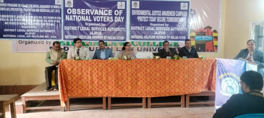 ଯାଜପୁର ତା୨୫.୦୧ ଯାଜପୁର ଜିଲ୍ଲା ଦୌରାଜଜ୍ ତଥା ଆଇନ୍ ସେବା ପ୍ରାଧିକରଣ ଅଧ୍ୟକ୍ଷ ଅମୃତ ରଞ୍ଜନ ନନ୍ଦ ଙ୍କ ନିର୍ଦ୍ଦେଶ କ୍ରମେ ପ୍ରାଧିକରଣ ପକ୍ଷରୁ ବିରଜା ଆଇନ୍ ମହାବିଦ୍ୟାଳୟ ସମ୍ମିଳନୀ କକ୍ଷ ରେ ଜାତୀୟ ମତଦାତା ଦିବସ ପାଳନ କରାଯାଇଥିଲା। ଆଇନ୍ ସଚେତନତା ସଭାରେ ପ୍ରାଧିକରଣ ସଚୀବ ନେହା ଅଗ୍ରଓ୍ବାଲ୍ ଅଧ୍ୟକ୍ଷତା କରି ଯୌନଉତ୍ପୀଡନ,ନିବାରଣ,ନିଷେଧ,ଓ ସମାଧାନ ବିଷୟରେ ଆଲୋଚନା କରିଥିବା ବେଳେ ଅତିଥି ଆଲୋଚକ ଭାବେ ଯୋଗ ଦେଇ ସିଭିଲ୍ କୋର୍ଟ ରେଜିଷ୍ଟାର ମାନସ ରଞ୍ଜନ ସାମନ୍ତରାୟ ,ଏସ୍ ଡି ଜେ ଏମ୍ ସୁମିତ୍ରା ବିଶ୍ବାଳ ,ଜେ ଏମ୍ ଏଫ୍ ସି ଅଂଶୁମାନ ରଥ ପ୍ରାଧିକରଣ ପ୍ରାକ୍ତନ ସଦସ୍ୟ ଡ଼ ରୁଦ୍ରନାରାୟଣ ପୃଷ୍ଟି ଅଧ୍ୟାପକ ସୌମ୍ୟ ରଞ୍ଜନ ଦାଶ ପ୍ରମୁଖ ଯୋଗ ଦେଇ ଯଥାକ୍ରମେ ପରିବେଶଗତ ଆଇନ ଆଜିର ସଂରକ୍ଷଣ ଆସନ୍ତାକାଲିର ସମୃଦ୍ଧ ସୁରକ୍ଷା ,ଭାରତୀୟ ନାଗରିକ ଙ୍କ ମୋୖଳିକ ଅଧିକାର ଓ କର୍ତ୍ତବ୍ୟ ସହିତ ମତଦାତା ଦିବସର ମହତ୍ତ୍ଵ ,ଚଳିତ ବର୍ଷର ଥିମ୍ ବା ଅନୁଚିନ୍ତା ମୋ ଭାରତ ମୋ ମତଦାନ ବିଷୟ ରେ ବିସ୍ତୃତ ଭାବେ ଆଲୋକପାତ କରିଥିଲେ।ମହାବିଦ୍ୟାଳୟ ର ଅଧ୍ୟକ୍ଷ ଡ଼ ସୁଦର୍ଶନ ବେହେରା ସୂଚନା ଓ ସ୍ବାଗତ ଭାଷଣ ପ୍ରଦାନ କରିଥିବା ବେଳେ ଅଧ୍ୟାପିକା ମହେଶ୍ଵେତା ଉପାଧ୍ୟାୟ ଧନ୍ୟବାଦ ଦେଇଥିଲେ।ପ୍ରାରମ୍ଭରେ ମହାବିଦ୍ୟାଳୟ ଛାତ୍ର ଛାତ୍ରୀ ମାତୃଵନ୍ଦନା ବନ୍ଦେ ଉତ୍କଳ ଜନନୀ ଗାନ କରିବା ସହ ସଂଖ୍ୟକ ଛାତ୍ରଛାତ୍ରୀ ଏହି କାର୍ଯ୍ୟକ୍ରମରେ ଯୋଗଦେଇ ଥିଲେ। ପ୍ରାଧିକରଣ କର୍ମଚାରୀ ଓ ମହାଵିଦ୍ୟାଳୟ ଅଧ୍ୟାପକ ଶିକ୍ଷାକର୍ମଚାରୀ ବୃନ୍ଦ କାର୍ଯ୍ୟକ୍ରମ ପରିଚାଳନାରେ ସହଯୋଗ କରିଥିଲେ।