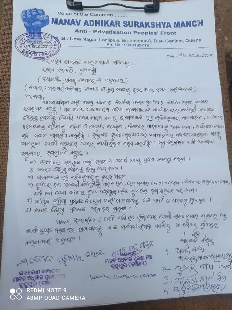 ବ୍ରହ୍ମପୁର,ତା.୧୮. ୭. ୨୦୨୪ ସମସ୍ତଙ୍କୁ ସମାନ ଓ ଯଥାର୍ଥ ନ୍ୟାୟ ପ୍ରଦାନ ବ୍ୟବସ୍ଥା, ଏଏସଓ ବୈକୁଣ୍ଠ ପ୍ରଧାନଙ୍କୁ ତୁରନ୍ତ ନ୍ୟାୟ ପ୍ରଦାନ,ଲଳିତ କୁମାରକୁ ତୁରନ୍ତ ଗିରିଫ,ଡ୍ୟୁଟିରେ ଥିବା ସରକାରୀ କର୍ମଚାରୀଙ୍କୁ ମାଡ଼ ମାରିବା, ଛେପ ପକାଇ ଜୋତା ଚଟେଇବା, ଜୀବନରେ ମାରିଦେବା ଧମକ, ଅପମାନିତ କରିବା, ନିର୍ଯ୍ୟାତନା ଦେବା ଘଟଣାର ମୁଖ୍ୟ ଅଭିଯୁକ୍ତ ଲଳିତ କୁମାରକୁ ଦୃଷ୍ଟାନ୍ତ ମୂଳକ ଦଣ୍ଡ ଦେବା,ନ୍ୟାୟିକ ପ୍ରକ୍ରିୟା ପ୍ରଭାବିତ ନ ହେବା ପାଇଁ ରାଜ୍ୟପାଳଙ୍କୁ ତାଙ୍କ ପଦପଦବୀ ଓ କ୍ଷମତାରୁ ସ୍ଥାନାନ୍ତର,ଏଏସଓ ବୈକୁଣ୍ଠ ପ୍ରଧାନଙ୍କ ପରିବାରର ସୁରକ୍ଷା ଆଦି ୬ଗୋଟି ପ୍ରମୁଖ ଦାବିନେଇ ଆଜି ଦକ୍ଷିଣାଞ୍ଚଳ ରାଜସ୍ବ କମିଶନରଙ୍କ କାର୍ଯ୍ୟାଳୟ ଜରିଆରେ ମହାମହିମ ରାଷ୍ଟ୍ରପତି ଓ ଓଡିଶାର ମୁଖ୍ୟମନ୍ତ୍ରୀଙ୍କୁ ମାନବ ଅଧିକାର ସୁରକ୍ଷା ମଞ୍ଚ ପକ୍ଷରୁ ପୃଥକ ସ୍ମାରକ ପତ୍ର ପ୍ରଦାନ କରାଯାଇଛି I ଦେଶର ସମ୍ବିଧାନ ପ୍ରଦତ୍ତ ଆଇନ ଦୃଷ୍ଟିରେ ସମସ୍ତେ ସମାନ ନୀତିକୁ ଓଡିଶାରେ ସମ୍ପୂର୍ଣ ଭାବେ ଉଲ୍ଲଂଘନ କରାଯାଉଛି ଓ ସମ୍ବିଧାନକୁ ହତ୍ୟା କରିବାପାଇଁ ଗୁଜୁରାଟ ପରେ ବର୍ତମାନ ଓଡିଶାକୁ ପ୍ରୟୋଗଶାଳା ଭାବେ ବ୍ୟବହାର କରାଯାଉଛି ବୋଲି ଆବାହକ ଆଇନଜୀବି ଅବନୀ ଗୟା ଦୃଢ଼ ଅଭିଯୋଗ କରିଛନ୍ତି