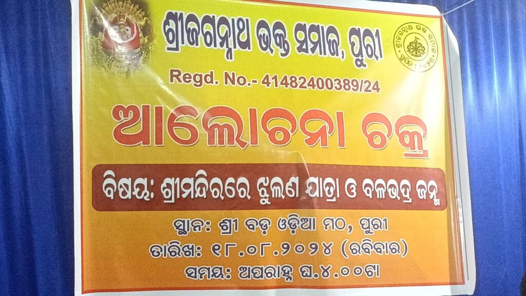 । ମହାପ୍ରଭୁ ଶ୍ରୀଜଗନ୍ନାଥଙ୍କ ଅପାର କୃପାରୁ ଶ୍ରୀ ଜଗନ୍ନାଥ ଭକ୍ତ ସମାଜ ତରଫରୁ ଶ୍ରୀବଡ ଓଡ଼ିଆ ମଠ, ପୁରୀ ଠାରେ ଶ୍ରୀ ଜଗନ୍ନାଥ ମନ୍ଦିରରେ ଝୁଲଣ ଯାତ୍ରା ଓ ବଳଭଦ୍ରଙ୍କ ଜନ୍ମ ତଥା ରକ୍ଷା ବନ୍ଧନ ଶୀର୍ଷକ ଆଲୋଚନାଚକ୍ର ଅନୁଷ୍ଠାନର ସଭାପତି ଶ୍ରୀ ଶଂକର୍ଷଣ ମଂଗରାଜଙ୍କ ସଭାପତିତ୍ବରେ ଆୟୋଜିତ ହୋଇଥିଲା । ଏଥିରେ କେନ୍ଦ୍ରୀୟ ସଂସ୍କୃତ ବିଶ୍ବବିଦ୍ୟାଳୟ, ସଦାଶିବ ପରିସରର ପ୍ରଫେସର୍ ଗୌରପ୍ରିୟା ଦାଶ ମୁଖ୍ୟ ଅତିଥି ରୂପେ ଯୋଗଦେଇ ମହାପ୍ରଭୁ ହେଉଛନ୍ତି ଅବତାରୀ, ସେ ସର୍ବ ରହସ୍ୟର ରହସ୍ୟ, ଅଜନ୍ମା, ମାତ୍ର ଭକ୍ତ ମାନଙ୍କ ପରିତ୍ରାଣ ପାଇଁ ବଳଦେବ ରୂପେ ଜନ୍ମଗ୍ରହଣ କରିଅଛନ୍ତି ଓ ଝୁଲଣ ଯାତ୍ରା ତାଙ୍କର ରାସଲୀଳା ବୋଲି ମତ ପ୍ରକାଶ କରିଥିଲେ। ମୁଖ୍ୟବକ୍ତା ରୂପେ ଡ.ବଳରାମ ଦାଶ ବଳଭଦ୍ରଙ୍କ ଜନ୍ମ ବୃତ୍ତାନ୍ତ, ଝୁଲଣ ଯାତ୍ରା ଓ ରକ୍ଷାବନ୍ଧନ ର ମହତ୍ତ୍ଵ ସମ୍ପର୍କରେ ଆଲୋଚନା କରିଥିଲେ । ଶ୍ରୀମନ୍ଦିର ପୁରୋହିତ ଶ୍ରୀଯୁକ୍ତ ପୂର୍ଣ୍ଣ ଚନ୍ଦ୍ର ମହାପାତ୍ର ଶ୍ରୀମନ୍ଦିର ରେ ବଳଭଦ୍ର ଜନ୍ମ ପାଳନର ରହସ୍ୟ ଉପସ୍ଥାପନ କରି ମାର୍କଣ୍ଡେୟ ପୁଷ୍କରଣୀ ଠାରେ ବଳଭଦ୍ରଙ୍କ ଜାତକର୍ମ କରାଯାଇଥାଏ ବୋଲି ମତ ଦେଇଥିଲେ। ଅନୁଷ୍ଠାନର ସମ୍ପାଦକ ଡଃ ଶଶିକାନ୍ତ ରଥ ସ୍ବାଗତ ଭାଷଣ ଓ ଅତିଥି ପରିଚୟ ପ୍ରଦାନ କରିଥିଲେ । ଅନୁଷ୍ଠାନର ଉପ ସଭାପତି ଡ଼ଃ ପ୍ରଦୀପ ଚନ୍ଦ୍ର ଆଚାର୍ଯ୍ୟ ସଭା ପରିଚାଳନା କରିଥିଲେ । ଏହି ସଭାରେ ସଂଯୁକ୍ତା ମହାପାତ୍ର, କାର୍ତ୍ତିକ ସାହୁ, ଡଃ ସ୍ନେହଲତା ମହାପାତ୍ର ପ୍ରମୁଖ ଆଲୋଚନାରେ ଅଂଶଗ୍ରହଣ କରିଥିଲେ । ଶେଷରେ ପୂର୍ଣ୍ଣିମା ମାଳା, ଅପର୍ଣ୍ଣା ରଥ ଭଜନ ପରିବେଷଣ କରିଥିଲେ।