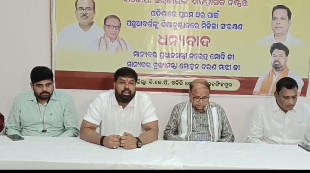 Date-23/05/25ଜଗତସିଂହପୁର ଠାରେ ଓବିସି ମୋର୍ଚ୍ଚା ପକ୍ଷରୁ ରାଜ୍ୟ ସରକାରଙ୍କୁ ଧନ୍ୟବାଦଆଙ୍କର-ଓଡ଼ିଶାରେ ପ୍ରଥମ ଥର ପାଇଁ ପଛୁଆ ବର୍ଗଙ୍କୁ ଶିକ୍ଷାନୁଷ୍ଠାନ ମାନଙ୍କରେ ୧୧.୨୫ ପ୍ରତିଶତ ସରଂକ୍ଷଣ ବ୍ୟବସ୍ଥା ଲାଗୁକୁ ନେଇ ଆଜି ଜଗତସିଂହପୁର ଜିଲ୍ଲା ଓବିସି ମୋର୍ଚ୍ଚା ପକ୍ଷରୁ ସ୍ଥାନୀୟ ସର୍କିଟ ହାଉସ ଠାରେ ଆୟୋଜିତ ଏକ ସମ୍ବାଦିକ ସମ୍ମିଳନୀରେ ମୁଖ୍ୟମନ୍ତ୍ରୀ ମୋହନ ମାଝୀଙ୍କୁ ଧନ୍ୟବାଦ ପ୍ରଦାନ କରାଯାଇଛି ।ଜିଲ୍ଲା ଓବିସି ମୋର୍ଚ୍ଚା ସଭାପତି ସୁବୋଧ ବାରିକଙ୍କ ଅଧ୍ୟକ୍ଷତାରେ ଆୟୋଜିତ ଏହି କାର୍ଯ୍ୟକ୍ରମରେ ଓବିସି ମୋର୍ଚ୍ଚା ରାଜ୍ୟ ସମ୍ପାଦକ ଜ୍ଞାନେନ୍ଦ୍ର ସ୍ବାଇଁ ,ରାଜ୍ୟ ସଂଯୋଜକ ନୃସିଂହ ସାହୁ ଓ ଜଗନ୍ନାଥ ସ୍ବାଇଁ ପ୍ରମୁଖ ଯୋଗ ଦେଇ ସରକାରଙ୍କ ଏହି ନିଷ୍ପତ୍ତି ଓବିସି ବର୍ଗର ଛାତ୍ର ଛାତ୍ରୀମାନଙ୍କ ପାଇଁ ଶିକ୍ଷା କ୍ଷେତ୍ରରେ ବହୁ ସୁବିଧା ସୁଯୋଗ ସୃଷ୍ଟି କରିବ ବୋଲି କହିବା ସହିତ ମୁଖ୍ୟମନ୍ତ୍ରୀଙ୍କୁ ଧନ୍ୟବାଦ ପ୍ରଦାନ କରିଥିଲେ ।