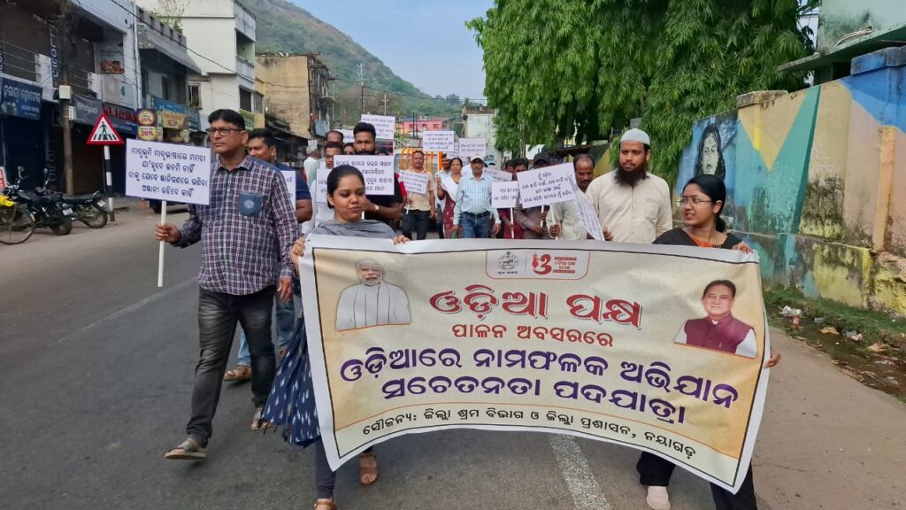 ନୟାଗଡ ଜିଲ୍ଲା ଶ୍ରମ କାର୍ଯ୍ୟାଳୟ ତରଫ ରୁ ଓଡିଆ ପକ୍ଷ ପାଳନ ଅବସରରେ ସମସ୍ତ ଦୋକାନ ବଜାର ଓ ବାଣିଜ୍ୟ ପ୍ରତିଷ୍ଠାନ ମାନଙ୍କର ନାମ ଫଳକ ଓଡିଆ ଭାଷାରେ ଲେଖିବା ପାଇଁ ଏକ ସଚେତନତା ପଦ ଯାତ୍ରା ଜିଲ୍ଲାପାଳ ଙ୍କ କାର୍ଯ୍ୟାଳୟ ପରିସରରୁ ଶୁଭାରମ୍ଭ କରାଯାଇଛି। ଏଥିସହିତ ଏକ ସଚେତନତା ରଥ ନୟାଗଡ ଜିଲ୍ଲା ର ବିଭିନ୍ନ ଏନଏସି ଅଞ୍ଚଳ ରେ ପରିକ୍ରମଣ କରିଛି।