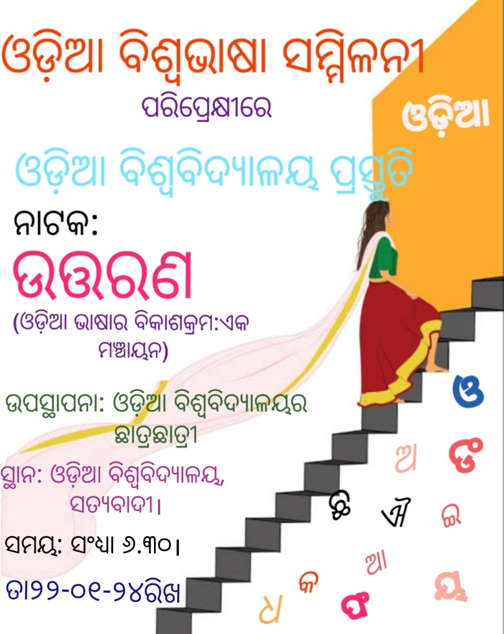 ଭୁବନେଶ୍ୱର-ତା.୨୧.୦୧.୨୦୨୪- ପ୍ରଥମ ବିଶ୍ୱ ଓଡ଼ିଆ ଭାଷା ସମ୍ମିଳନୀ ଅବସରରେ ସରକାରୀ ସ୍ତରରେ ବ୍ୟାପକ ଆୟୋଜନ କରାଯାଉଛି । ଏହି ମର୍ମରେ ଓଡ଼ିଆ ବିଶ୍ୱବିଦ୍ୟାଳୟ ପକ୍ଷରୁ ଓଡ଼ିଆ କାବ୍ୟ କବିତାକୁ ନେଇ ଏକ ନାଟକ ପରିବେଷଣ କରାଯିବ । ଓଡ଼ିଆ ଭାଷାର ବିକାଶକ୍ରମ:ଏକ ମଞ୍ଚାୟନକୁ ନେଇ ନାଟକ “ଉତ୍ତରଣ” ଆସନ୍ତାକାଲି ସନ୍ଧ୍ୟା ସାଢେ ୬ ଘଟିକା ସମୟରେ ସତ୍ୟବାଦୀସ୍ଥିତ ଓଡ଼ିଆ ବିଶ୍ୱବିଦ୍ୟାଳୟରେ ମଞ୍ଚସ୍ଥ ହେବ । ଏହାକୁ ବିଶ୍ୱବିଦ୍ୟାଳୟ ଛାତ୍ରଛାତ୍ରୀ ମାନେ ଉପସ୍ଥାପନ କରିବେ । ଏଥିରେ ସପ୍ତଦଶ ଶତାବ୍ଦୀ ଠାରୁ ଆରମ୍ଭ କରି ଆଜି ପର୍ଯନ୍ତ ଓଡ଼ିଆ କାବ୍ୟକବିତା ମାନ ନାଟକ ମାଧ୍ୟମରେ ପ୍ରଦର୍ଶିତ ହେବ ।ସୂଚନାଯୋଗ୍ୟ, ଆସନ୍ତା ଫେବୃୟାରୀ ୩ରୁ ୫ ତାରିଖ ପର୍ଯ୍ୟନ୍ତ ଜନତା ମଇଦାନରେ ଏହି ପ୍ରଥମ ବିଶ୍ୱ ଓଡ଼ିଆ ଭାଷା ସମ୍ମିଳନୀ ଅନୁଷ୍ଠିତ ହେବ। ଏଥିରେ ଓଡ଼ିଆ ଭାଷାକୁ ନେଇ ବିଭିନ୍ନ ପ୍ରସଙ୍ଗରେ ଆଲୋଚନା ହେବା ସହ ନାନାବିଧ କାର୍ଯ୍ୟକ୍ରମର ଆୟୋଜନ କରାଯାଇଛି ।