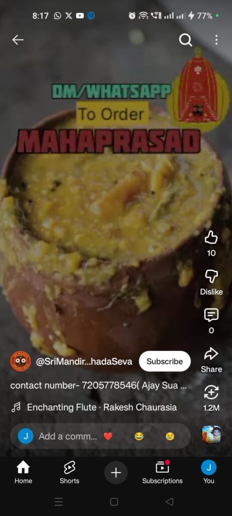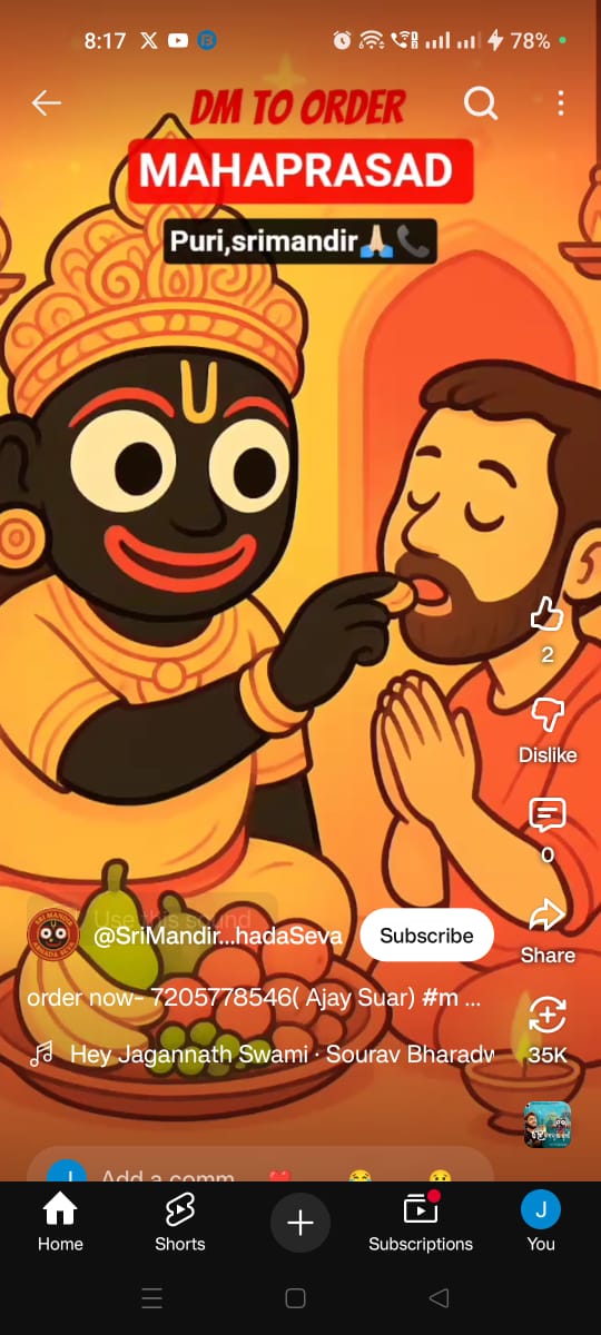 ପୁଣି ଅନଲାଇନରେ ମହାପ୍ରଭୁଙ୍କ ମହାପ୍ରସାଦ ବିକ୍ରି ନେଇ ସାମାଜିକ ଗଣମାଧ୍ୟମରେ ଦିଆଯାଇଛି ସୂଚନା। ତେବେ ଏଥର କୌଣସି ଅନୁଷ୍ଠାନ କିମ୍ବା ସଂସ୍ଥା ନୁହେଁ ବରଂ ଶ୍ରୀମନ୍ଦିରର ଜଣେ ସେବାୟତ ନିଜ ସୋସିଆଲ ମିଡିଆରେ ଏଭଳି ପ୍ରଚାର କରିଥିବା ଦେଖିବାକୁ ମିଳିଛି। ଅଜୟ ସୁଆର ନାମକ ଜଣେ ବ୍ୟକ୍ତି ନିଜ ୟୁଟ୍ୟୁବରେ ଏଭଳି ପୋଷ୍ଟ କରିଛନ୍ତି। ଶ୍ରୀମନ୍ଦିର ଅବଢ଼ା ସେବା ନାମରେ ସମ୍ପୃକ୍ତ ବ୍ୟକ୍ତି ଜଣକ ନିଜ ୟୁଟ୍ୟୁବରେ ଏଭଳି ପ୍ରଚାର କରିଥିବା ଦେଖିବାକୁ ମିଳିଛି। ଅଜୟ ସୁଆର ନାମକ ଜଣେ ସେବାୟତ ନିଜ ୟୁଟ୍ୟୁବରେ ଲେଖିଛନ୍ତି ଆମେ ପୁରୀ ଶ୍ରୀଜଗନ୍ନାଥ ମନ୍ଦିରର ପବିତ୍ର ରୋଷଶାଳାରୁ ମହାପ୍ରସାଦ ପ୍ରସ୍ତୁତ କରି ଆଣିଥାଉ।