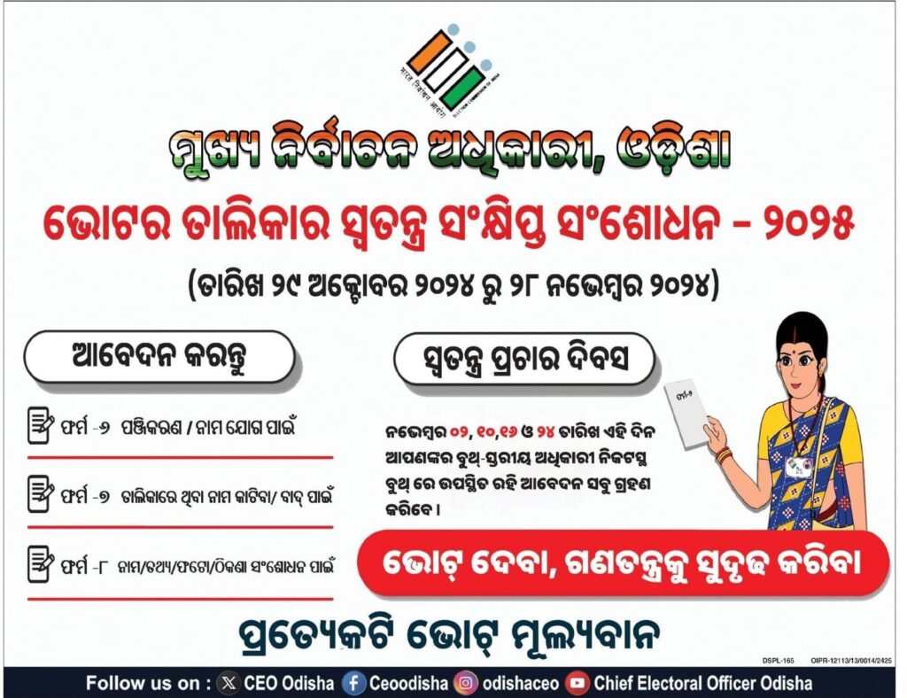 ଛତ୍ରପୁର , ଭୋଟର ତାଲିକାର ସ୍ବତନ୍ତ୍ର ସଂକ୍ଷିପ୍ତ ସଂଶୋଧନ କାର୍ଯ୍ୟକ୍ରମ ଆଜି ତା.29.10.2024ରିଖ ଠାରୁ ଆରମ୍ଭ ହୋଇଛି । ଆସନ୍ତା ନଭେମ୍ବର 28 ତାରିଖ ପର୍ଯ୍ୟନ୍ତ ଏହି କାର୍ଯ୍ୟକ୍ରମ ଚାଲୁ ରହିବ । ପ୍ରତ୍ୟେକ ନାଗରିକ ଯେଉଁ ମାନଙ୍କୁ 18 ବର୍ଷ ପୂରଣ ହୋଇଛି ବା 18 ବର୍ଷ ହେବାକୁ ଯାଉଛି ସେମାନେ ଭୋଟର ତାଲିକାରେ ନିଜ ନାମ ପଞ୍ଜିକରଣ କରାଇବେ । ଯେଉଁ ଭୋଟଦାତାଗଣ ଗୋଟିଏ ସ୍ଥାନରୁ ଆଉ ଗୋଟିଏ ସ୍ଥାନକୁ ସ୍ଥାନାନ୍ତରଣ ହେଉଛନ୍ତି ସେମାନେ ଭୋଟର ତାଲିକାକୁ ସଂଶୋଧନ କରାଇ ବର୍ତ୍ତମାନ ରହୁଥିବା ସ୍ଥାନରେ ନିଜ ନାମ ଅନ୍ତର୍ଭୁକ୍ତ କରାଇପାରିବେ । ଯେଉଁ ମାନଙ୍କର ନାମ ଭୋଟର ତାଲିକାରେ ରହିଛି କିନ୍ତୁ ସେମାନେ ମୃତ ସେମାନଙ୍କ ସମ୍ପର୍କୀୟ ତାଲିକାରୁ ବାଦ କରାଇବେ । ଭୋଟର ତାଲିକାରେ ଭୂଲ ତଥ୍ୟ ଥିଲେ ତାହା ସଂଶୋଧନ କରାଇ ନେବେ । ଭୋଟଦାତା ଗଣ ନିଜ ଅଞ୍ଚଳର ବୁଥ୍ ସ୍ତରୀୟ ଅଧିକାରୀ କିମ୍ବା ଅନଲାଇନ୍ ମାଧ୍ୟମରେ ଭୋଟର ଆପ୍ ରେ ସଂଶୋଧନ କରାଇ ନିଅନ୍ତୁ । ଭୋଟର ତାଲିକାଟି କିଭଳି ସମ୍ପୂର୍ଣ୍ଣ ସଂଶୋଧିତ ହେବ ସେଥି ସକାଶେ ମଙ୍ଗଳବାର ଛତ୍ରପୁର ଉପ ଜିଲ୍ଲାପାଳଙ୍କ କାର୍ଯ୍ୟାଳୟ ଠାରୁ ଏକ ଶୋଭାଯାତ୍ରା ବାହାରି ପୋଲିସ୍ ପଡିଆ ନିକଟସ୍ଥ ଗାନ୍ଧିଜୀଙ୍କ ପ୍ରତିମୂର୍ତ୍ତି ନିକଟରେ ସମବେତ ହୋଇଥିଲେ । ସେହିଠାରେ ପଥ ଉତ୍ସବ ପାଳନ ହୋଇଥିଲା । ଅତିରିକ୍ତ ଜିଲ୍ଲାପାଳ ଡଃ ପ୍ରମୋଦ କୁମାର ପୃଷ୍ଟି ଏବଂ ସୁଧାଶୁ କୁମାର ଭୋଇ ମୁଖ୍ଯ ଅତିଥି ତଥା ସମ୍ମାନୀତ ଅତିଥି ଭାବେ ଯୋଗ ଦେଇ ଏହି କାର୍ଯ୍ୟକ୍ରମର ଶୁଭାରମ୍ଭ କରିବା ସହିତ ସମବେତ ଜନତାଙ୍କୁ ଭୋଟର ତାଲିକା ସଂଶୋଧନ ପ୍ରକ୍ରିୟାର ଆବଶ୍ୟକତା ସମ୍ପର୍କରେ ନିଜ ବକ୍ତବ୍ୟରେ ବୁଝାଇଥିଲେ । ଭାରପ୍ରାପ୍ତ ଉପ ଜିଲ୍ଲାପାଳ ତଥା ସହକାରୀ ଉପ ଜିଲ୍ଲାପାଳ ପାର୍ଥ ସାରଥୀ ହାଁସଦା ପ୍ରାରମ୍ଭିକ ସୂଚନା ଦେବା ସହିତ ଏହି ଉତ୍ସବ ପାଳନର ତାତ୍ପର୍ଯ୍ୟ ସମ୍ପର୍କରେ ଅବଗତ କରାଇଥିଲେ । ଜିଲ୍ଲା ସୂଚନା ଓ ଲୋକ ସମ୍ପର୍କ ଅଧିକାରୀ ରବି ନାରାୟଣ ବେହେରାଙ୍କ ପରିଚାଳନାରେ ଅନୁଷ୍ଠିତ ଏହି କାର୍ଯ୍ୟକ୍ରମରେ ଡେପୁଟି କଲେକ୍ଟର ନିର୍ବାଚନ ରାଜେଶ କୁମାର ଇକ୍କା ତଥା ଓମ୍ ପ୍ରକାଶ ପରିଡା ଭୋଟର ତାଲିକାର ସଂଶୋଧନ ସମ୍ପର୍କରେ ସୂଚନା ଦେଇଥିଲେ । ପରିଶେଷରେ ସହକାରୀ ଉପ ଜିଲ୍ଲାପାଳ ପୁଷ୍ପାଞ୍ଜଳୀ ପୁଷିକା ଧନ୍ୟବାଦ ଅର୍ପଣ କରିଥିଲେ । ପଥ ଉତ୍ସବରେ ରଙ୍ଗୋଲୀ ପ୍ରତିଯୋଗିତା ଅନୁଷ୍ଠିତ ହୋଇଥିଲା । ଜିଲ୍ଲା ସଂସ୍କୃତି ପରିଷଦ ଆନୁକୂଲ୍ୟରେ ରାଜେନ୍ଦ୍ର ମହାପାତ୍ରଙ୍କ ଦଳ ଦ୍ବାରା ଯୋଡି ଶଙ୍ଖ ଓ ରଣପା ନୃତ୍ୟ ପରିବେଷଣ ହେବା ସହିତ କଳା ବିକାଶ କେନ୍ଦ୍ର ଛତ୍ରପୁର ଦ୍ବାରା ଅଳକା ସାହୁଙ୍କ ଛାତ୍ରୀଗଣ ଓଡିଶୀ ନୃତ୍ୟ, ଡାଲଖାଇ ନୃତ୍ୟ ଏବଂ ଛତ୍ରପୁର ମହିଳା ମହାବିଦ୍ୟାଳୟର ଛାତ୍ରୀ ଶାଳିନୀ ରାଣୀ ଦାସ, ଶାଳିନୀ ବିଶ୍ବାଳ ଏବଂ ଜି. ଶ୍ରାବଣୀଙ୍କ ଦ୍ବାରା ମୋ ଓଡିଶୀ ନୃତ୍ୟ ପରିବେଷଣ ହୋଇଥିଲା ।