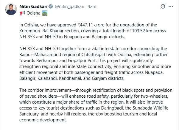 ଓଡ଼ିଶାରେ NHର ଉନ୍ନତୀକରଣ ଲାଗି ୪୪୭.୧୧ କୋଟି ଟଙ୍କା ମଂଜୁର……ଅର୍ଥ ମଂଜୁରୀ ନେଇ କେନ୍ଦ୍ର ମନ୍ତ୍ରୀ ନୀତିନ ଗଡ଼କରୀଙ୍କ `X’ରେ ପୋଷ୍ଟ…..କୁରୁମପୁରୀ-ରାଜ ଖରିଆର ସେକ୍ସନର ଉନ୍ନତୀକରଣ ପାଇଁ ଟଙ୍କା ମଂଜୁର…..ଏହା ଫଳରେ ନୂଆପଡା ଓ ବଲାଙ୍ଗୀର ଜିଲ୍ଲାରେ ଯାଇଥିବା NHର ଉନ୍ନତି ହେବ….ଏଥିରେ NH-୩୫୩ ଓ NH-୫୯ରେ ଯାଇଥିବା ୧୦୩.୫୨ କିଲୋମିଟର ଅନ୍ତର୍ଭୁକ୍ତ…..NH-୩୫୩, NH-୫୯ ଯୋଗୁଁ ଏକ ଗୁରୁତ୍ୱପୂର୍ଣ୍ଣ ଆନ୍ତଃରାଜ୍ୟ କରିଡର ସମ୍ଭବ ହେବ…..NH-୩୫୩, NH-୫୯ ଯୋଗୁଁ ଏକ ଗୁରୁତ୍ୱପୂର୍ଣ୍ଣ ଆନ୍ତଃରାଜ୍ୟ କରିଡର ସମ୍ଭବ ହେବ……ରାୟପୁର-ମହାସମୁନ୍ଦ ଅଞ୍ଚଳକୁ ଓଡ଼ିଶା ସହ ସଂଯୋଗ କରୁଥିବା କରିଡର ସମ୍ଭବ ହେବଯାହା ପରବର୍ତ୍ତୀ କାଳରେ ବ୍ରହ୍ମପୁର ଓ ଗୋପାଳପୁର ବନ୍ଦର ପର୍ଯ୍ୟନ୍ତ ବିସ୍ତାର କରିବ…..ଏହି ପ୍ରକଳ୍ପ ଆଞ୍ଚଳିକ ଓ ଆନ୍ତଃରାଜ୍ୟ ସଂଯୋଗୀକରଣକୁ ସୁଦୃଢ଼ କରିବ…..ଏହି ପ୍ରକଳ୍ପ ଫଳରେ ରାଜ୍ୟର ୫ଟି ଜିଲ୍ଲା ମଧ୍ୟରେ ପରିବହନ ବ୍ୟବସ୍ଥା ସୁଗମ ହେବ…..ନୂଆପଡା, ବଲାଙ୍ଗୀର, କଳାହାଣ୍ଡି, କନ୍ଧମାଳ, ଗଞ୍ଜାମ ଜିଲ୍ଲା ମଧ୍ୟରେ ସୁଗମ ହେବ l