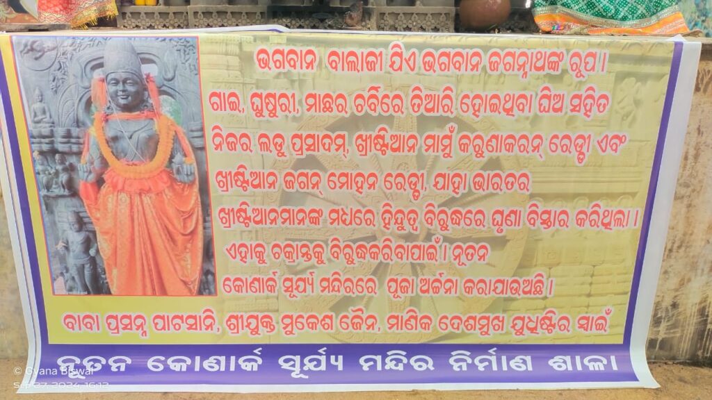 କୋଣାର୍କ ନୂତନ ସୂର୍ଯ୍ୟ ମନ୍ଦିରରେ ଇଶ୍ବରଙ୍କ ନୈବେଦ୍ୟକୁ ଅପମାନିତ କରୁଥିବା ଖ୍ରୀଷ୍ଟିଆନ ବାହିନୀର ବିନାଶ ପାଇଁ ଶୁକ୍ରବାର ଅପରାହ୍ନରେ ହୋମଯଜ୍ଞ କରାଯାଇଛି। ସୂର୍ଯ୍ୟ ମନ୍ଦିର ନିର୍ମାଣ ସାଳା ଅଧକ୍ଷ ମୁକେଶ ଜୈନ ଙ୍କ ଅଧ୍ୟକ୍ଷତାରେ ଅନୁଷ୍ଠିତ ଏହି କାର୍ଯ୍ୟକ୍ରମରେ ପୂର୍ବତନ ସାଂସଦ ବାବା ପ୍ରସନ୍ନ ପାଟ୍ଟଶାଣୀ ଯୋଗ ଦେଇଥିଲେ।| ଖ୍ରୀଷ୍ଟିଆନ ଜଗନ୍ ମୋହନ ରେଡ୍ଡୀଙ୍କ ଦ୍ଵାରା କରାଯାଉଛି, ତିରୁପତି ବାଲାଜୀ ଭେଙ୍କଟେସ ମନ୍ଦିରରେ ଲଡୁ ଓ ପ୍ରସାଦ ଘୁଷୁରୀ ଏବଂ ମାଛର ଚର୍ବିରୁ ତିଆରି ହୋଇଥିବା ନେଇ ଅଭିଯୋଗ ହୋଇଛି। ସେ ଓ କରୁଣାକରନ୍ ରେଡ୍ଡୀ ଏବଂ ଆନ୍ତର୍ଜାତୀୟ ଇଂରାଜୀ ଖ୍ରୀଷ୍ଟିଆନ ଶୟତାନ ଶକ୍ତି ଦ୍ୱାରା ବିସ୍ତାର କରୁଛନ୍ତି। ଭାରତର ଖ୍ରୀଷ୍ଟିଆନମାନଙ୍କ ମଧ୍ୟରେ ହିନ୍ଦୁତ୍ୱ ବିରୁଦ୍ଧରେ ଘୃଣା ନୂତନ ସୂର୍ଯ୍ୟ ମନ୍ଦିରରେ ସମ୍ପୂର୍ଣ୍ଣ ବିନାଶ କରାଯାଇଥିଲା । ବାବା ପ୍ରସନ୍ନ ପାଟ୍ଟଶାଣୀ ଭକ୍ତମାନଙ୍କୁ କହିଥିଲେ ଯେ ଭଗବାନ ତିରୁପତି ବାଲାଜୀ ଭଗବାନ ଜଗନ୍ନାଥଙ୍କ ରୂପ। ସେ ଭଗବାନ ବିଷ୍ଣୁଙ୍କର ଏକ ଅବତାର | ବାବା ପ୍ରସନ୍ନ ପାଟ୍ଟଶାଣୀ ଏହାକୁ ପୋପ୍ ଏବଂ ଆନ୍ତର୍ଜାତୀୟ ଖ୍ରୀଷ୍ଟିଆନ ବାହିନୀର ଷଡଯନ୍ତ୍ର ବୋଲି କହିଛନ୍ତି। ହିନ୍ଦୁ ଓ ଭଗବାନ ଜଗନ୍ନାଥଙ୍କ ଧର୍ମକୁ ନଷ୍ଟ କରିବା ପାଇଁ ଏହା କରାଯାଉଛି।