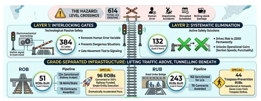 ପ୍ରତିଟି ଫାଟକରେ ସୁରକ୍ଷା: ରେଳଯାତ୍ରାକୁ ଅଧିକ ନିରାପଦ କରିବା ପାଇଁ ପୂର୍ବତଟ ରେଳପଥର ବ୍ୟାପକ ଅଭିଯାନ ।ଭୁବନେଶ୍ୱର, ୧୯ ଏପ୍ରିଲ, ୨୦୨୬: ବିଗତ ପାଞ୍ଚ ବର୍ଷ ମଧ୍ୟରେ ୩୮୪ଟି ଲେଭଲ୍ କ୍ରସିଂ ଗେଟ୍ର ଇଣ୍ଟରଲକିଂ, ୧୩୨ଟି କ୍ରସିଂର ଉଚ୍ଛେଦ, ଏବଂ ୫୧ଟି ରୋଡ ଓ଼ଭରବ୍ରିଜ (ROB) ଓ ୨୪୩ଟି ରୋଡ ଅଣ୍ଡରବ୍ରିଜ (RUB) ନିର୍ମାଣ ମାଧ୍ୟମରେ ପୂର୍ବତଟ ରେଳପଥ ରେଳ ଚଳାଚଳର ଅନ୍ୟତମ ମାରାତ୍ମକ ବିପଦ — ଲେଭଲ୍ କ୍ରସିଂକୁ ସମାପ୍ତ କରିବା ପାଇଁ ନିରନ୍ତର କାର୍ଯ୍ୟ କରୁଛି । ଏହି ବିପଦର ସମୂଳ ନାଶ ପାଇଁ ପୂର୍ବତଟ ରେଳପଥ ପ୍ରଯୁକ୍ତିବିଦ୍ୟା, ଭିତ୍ତିଭୂମି ଏବଂ ଇଞ୍ଜିନିୟରିଂର ଏକ ସମନ୍ୱିତ ପ୍ରୟାସ ଜାରି ରଖିଛି ।ରେଳ ନେଟୱାର୍କରେ ଲେଭଲ୍ କ୍ରସିଂର ବିପଦଲେଭଲ୍ କ୍ରସିଂ ହେଉଛି ଏପରି ଏକ ସ୍ଥାନ ଯେଉଁଠାରେ ସଡ଼କ ଏବଂ ରେଳ ଧାରଣା ଏକାଠି ମିଳିତ ହୁଅନ୍ତି, ଯାହା ଉଭୟ ଟ୍ରେନ୍ ଏବଂ ସଡ଼କ ଯାନ ଚଳାଚଳ ପାଇଁ ଅତ୍ୟନ୍ତ ବିପଦପୂର୍ଣ୍ଣ । ଓଡ଼ିଶା, ଆନ୍ଧ୍ରପ୍ରଦେଶ ଏବଂ ଝାଡ଼ଖଣ୍ଡରେ ଆଦି ରାଜ୍ୟରେ ବ୍ୟାପିଥିବା ପୂର୍ବତଟ ରେଳପଥର ନେଟୱାର୍କରେ ୬୧୪ଟି ଏଭଳି କ୍ରସିଂ ରହିଛି ।ଗେଟ୍ ପଡ଼ିବା ସତ୍ତ୍ୱେ କିମ୍ବା ସତର୍କ ସୂଚନା ମିଳିବା ପରେ ମଧ୍ୟ ଲୋକଙ୍କ ଅସାବଧାନତା ଯୋଗୁଁ ବିପଦ ଅଧିକ ବଢ଼ିଥାଏ ।ଏହି ସ୍ଥାନରେ ହେଉଥିବା ଦୁର୍ଘଟଣା ଯୋଗୁଁ ଜୀବନହାନି ସହ ରେଳ ସେବା ବାଧାପ୍ରାପ୍ତ ହୁଏ ଏବଂ ରେଳ ସମ୍ପତ୍ତି ନଷ୍ଟ ହୋଇଥାଏ ।ପ୍ରଥମ ସୁରକ୍ଷା ବଳୟ: ଲେଭଲ୍ କ୍ରସିଂ ଗେଟ୍ର ଇଣ୍ଟରଲକିଂଯେପର୍ଯ୍ୟନ୍ତ ଏକ ଲେଭଲ୍ କ୍ରସିଂ ସମ୍ପୂର୍ଣ୍ଣ ରୂପେ ଉଚ୍ଛେଦ ହୋଇନାହିଁ, ସେପର୍ଯ୍ୟନ୍ତ ମାନବୀୟ ତ୍ରୁଟି ଦୂର କରିବା ହେଉଛି ସର୍ବୋତ୍ତମ ସୁରକ୍ଷା । ପୂର୍ବତଟ ରେଳପଥ ଏପର୍ଯ୍ୟନ୍ତ ୩୮୪ଟି ଲେଭଲ୍ କ୍ରସିଂ ଗେଟ୍କୁ ଇଣ୍ଟରଲକ୍ କରିଛି । ଏହି ବୈଷୟିକ ବ୍ୟବସ୍ଥା ଦ୍ୱାରା ଗେଟ୍ର କାର୍ଯ୍ୟକଳାପ ସିଧାସଳଖ ଟ୍ରେନ୍ ସିଗନାଲ୍ ସହିତ ଜଡ଼ିତ ରହେ, ଯାହା ମାନବୀୟ ଭୁଲ୍ ହେବାର ସମ୍ଭାବନାକୁ ଦୂର କରିଥାଏ । ଏହାଦ୍ୱାରା ଅସାବଧାନତା ଜନିତ ଦୁର୍ଘଟଣା ଯଥେଷ୍ଟ ପରିମାଣରେ ହ୍ରାସ ପାଇଛି ।ଲେଭଲ୍ କ୍ରସିଂର ସମୂଳ ଉଚ୍ଛେଦଇଣ୍ଟରଲକିଂ ବ୍ୟବସ୍ଥା ଦ୍ୱାରା ବର୍ତ୍ତମାନର ଲେଭଲ୍ କ୍ରସିଂଗୁଡ଼ିକର ସୁରକ୍ଷା ବୃଦ୍ଧି ପାଉଛି, କିନ୍ତୁ ପୂର୍ବତଟ ରେଳପଥ (ECoR) ର ଦୀର୍ଘକାଳୀନ ଲକ୍ଷ୍ୟ ଅଧିକ ମହତ୍ତ୍ଵାକାଂକ୍ଷୀ: ତାହା ହେଉଛି ଲେଭଲ୍ କ୍ରସିଂଗୁଡ଼ିକୁ ସମ୍ପୂର୍ଣ୍ଣ ଭାବେ ଉଚ୍ଛେଦ କରିବା। କ୍ରସିଂରେ ଦୁର୍ଘଟଣା ବିପଦକୁ ଶୂନ୍ୟ କରିବା ପାଇଁ ଏହାହିଁ ଏକମାତ୍ର ରଣନୀତି। ବିଗତ ପାଞ୍ଚ ବର୍ଷ ମଧ୍ୟରେ, ପୂର୍ବତଟ ରେଳପଥ ନେଟୱାର୍କରୁ ୧୩୨ଟି ଲେଭଲ୍ କ୍ରସିଂ ବନ୍ଦ କରି ଦିଆଯାଇଛି — ଏହି ନିରନ୍ତର ହ୍ରାସ ସୁରକ୍ଷା କ୍ଷେତ୍ରରେ ପ୍ରତ୍ୟକ୍ଷ ଓ ମାପଯୋଗ୍ୟ ସଫଳତା ଆଣିଦେଇଛି।ସାଧାରଣତଃ ରୋଡ୍ ଓଭର ବ୍ରିଜ୍ (ROB) କିମ୍ବା ରୋଡ୍ ଅଣ୍ଡର ବ୍ରିଜ୍ (RUB) ଭଳି ବିକଳ୍ପ ବ୍ୟବସ୍ଥା ନିର୍ମାଣ ପରେ ଏହି କ୍ରସିଂଗୁଡ଼ିକୁ ବନ୍ଦ କରାଯାଏ, ଯାହା ଫଳରେ ସଡ଼କ ଏବଂ ରେଳ ଚଳାଚଳ ସ୍ଵାଧୀନ ଭାବେ ହୋଇପାରେ। ଥରେ ଏହି କ୍ରସିଂ ଉଚ୍ଛେଦ ହୋଇଗଲେ, ବିପଦ ସ୍ଥାୟୀ ଭାବେ ଦୂର ହୋଇଯାଏ—ସେଠାରେ ଫାଟକ ଖରାପ ହେବାର ଭୟ ରହେ ନାହିଁ, ମାନବୀୟ ନିଷ୍ପତ୍ତି ଉପରେ ନିର୍ଭର କରିବାକୁ ପଡ଼େ ନାହିଁ ଏବଂ ଅସୁରକ୍ଷିତ ଭାବେ କ୍ରସିଂ କରିବାର କୌଣସି ସୁଯୋଗ ରହେ ନାହିଁ।ସୁରକ୍