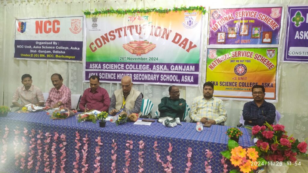 ଆସିକା ଵିଜ୍ଞାନ ମହାବିଦ୍ୟାଳୟ ଠାରେ ସମର ଶିକ୍ଷାର୍ଥୀ ବାହିନୀ, ଭାରତ ସ୍କାଉଟ୍ସ ଏଣ୍ଡ ଗାଇଡସ, ଜାତୀୟ ସେବା ଯୋଜନା ଓ ଯୁବ ରେଡ଼କ୍ରସ ର ସ୍ବେଛାସେବୀ, ମହାବିଦ୍ୟାଳୟ ର ଅନ୍ୟାନ୍ୟ ଛାତ୍ର ଛାତ୍ରୀ ଓ ସମସ୍ତ କର୍ମଚାରୀ ଙ୍କ ସହଯୋଗ ରେ ସମ୍ବିଧାନ ଦିବସ ଟିକୁ ମହା ଆଡମ୍ବରରେ ପାଳନ କରାଯାଇଛି. ଏହି କାର୍ଯ୍ୟକ୍ରମ ରେ ଅଧ୍ୟକ୍ଷ ଡ଼ଃ ଜୀବାନନ୍ଦ ତ୍ରିପାଠୀ ସଭାପତିତ୍ୱ କରିଥିବା ବେଳେ ମୁଖ୍ୟ ଅତିଥି ଭାବେ ମହାବିଦ୍ୟାଳୟ ର ପରିଚାଳନା କମିଟି ର ସଭାପତି ପ୍ରଫେସର ପ୍ରସନ୍ନ କୁମାର ପ୍ରଧାନ, ସନମାନୀତ ଅତିଥି ଭାବେ ପ୍ରଶାସନିକ ଅଧିକାରୀ ଡ଼ଃ. ଶଙ୍କର ପ୍ରସାଦ ଅଧିକାରୀ, ମୁଖ୍ୟ ବକ୍ତା ଭାବେ ରାଜନୀତି ବିଭାଗର ମୁଖ୍ୟ ଡ଼ଃ. ଅଭୟ କେଶରୀ ପରିଛା ପଟନାୟକ, ଏନ ଏସ ଏସ ଅଧିକାରୀ ପ୍ରଫେସର ଚନ୍ଦନ ମାରାଣ୍ଡି, ୱାଇ ଆର ସି ଅଧିକାରୀ ଡ଼ଃ. ଅଜିତ କୁମାର ମୁନୀ ଓ ସ୍କାଉଟ ଲିଡର ପ୍ରଫେସର ସରୋଜ କୁମାର ପଣ୍ଡା ମଞ୍ଚାସିନ ଥିଲେ. ଆଜିର ମୁଖ୍ୟ ଆଲୋଚ୍ୟ ବିଷୟ ଥିଲା ଭାରତୀୟ ସମ୍ବିଧାନ ଉପରେ ଆଲୋଚନା ଓ ପର୍ଯ୍ୟାଲୋଚନା. ସଭାକାର୍ଯ୍ୟ ପ୍ରାରମ୍ଭ ରେ ପ୍ରଫେସର ମାରାଣ୍ଡି ଅତିଥି ନିମନ୍ତ୍ରଣ ସହ ପରିଚୟ ପ୍ରଦାନ କରିଥିଲେ ଓ ଛାତ୍ରୀ ମାନଙ୍କ ଦ୍ୱାରା ପୁଷ୍ପଗୁଛ ପ୍ରଦାନ ଓ ଉପଢୌକନ ଦେଇ ସନମାନୀତ କରାଯାଇଥିଲା. ପରେ ପରେ ଠାକୁର ଙ୍କୁ ପୁଷ୍ପମାଲ୍ୟ ଦେଇ ପ୍ରଦୀପ ପ୍ରଜ୍ବଳନ କରିବା ସହ ବେଦପାଠ କରାଯାଇଥିଲା. ପରେ ସଭାପତିଙ୍କ ଦ୍ୱାରା ସଭା କାର୍ଯ୍ୟ ଆରମ୍ଭ ହୋଇଥିଲା.
