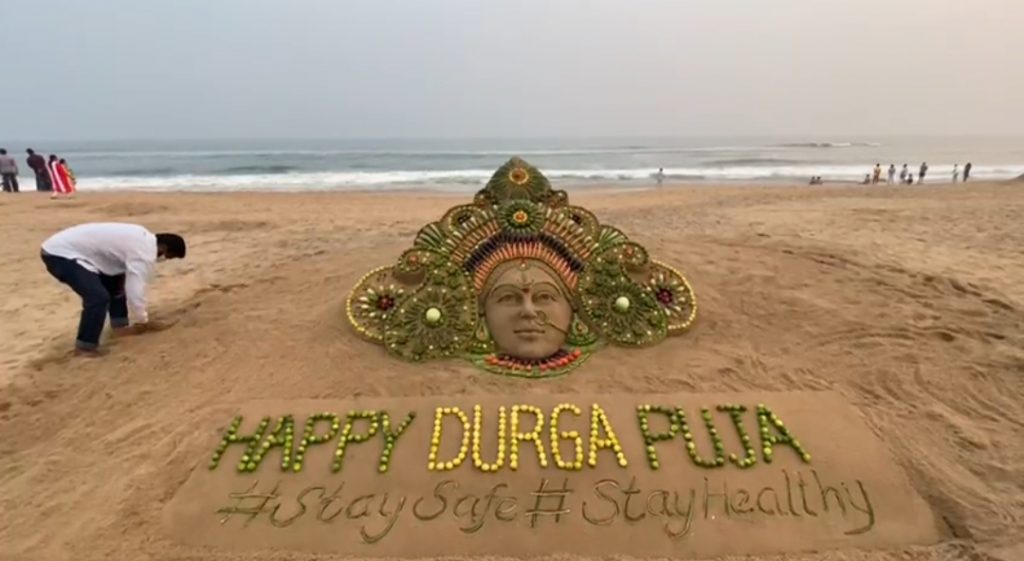 ଚାଲିଛି ପାର୍ବଣର ରୂତୁ। ଆସନ୍ତା ଶୁକ୍ରବାର ପବିତ୍ର ଦଶହରା। ଦଶହରା ଉପଲକ୍ଷେ ପୁରୀ ସ୍ୱର୍ଣ୍ନାଭ ବେଳାଭୂମିରେ ପଦ୍ମଶ୍ରୀ ସୁଦର୍ଶନ ପଟ୍ଟନାୟକଙ୍କ ନିଆରା କଳାକୃତି। ସୁଦର୍ଶନ ୧୨ ପ୍ରକାର ପନିପରିବା ଦ୍ବାରା ବେଳାଭୂମିରେ ମା ଦୁର୍ଗାଙ୍କ ପ୍ରତିମୂର୍ତ୍ତି ନିର୍ମାଣ କରିଛନ୍ତି ଯାହା ଦେଖିବାକୁ ବେଶ୍ ଆକର୍ଷଣୀୟ ହୋଇଛି। ସେପଟେ ଏହି ସୁନ୍ଦର ବାଲୁକାକଳାରେ ନିର୍ମାଣ ହୋଇଥିବା ମା ଦୁର୍ଗାଙ୍କ ପ୍ରତିମୂର୍ତ୍ତି ଦେଖିବାକୁ ବେଳାଭୂମିରେ ଅନେକ ପର୍ଯ୍ୟଟକଙ୍କ ଭିଡ ପରିଲକ୍ଷିତ ହୋଇଥିବା ବେଳେ ବାଲୁକାକଳାରେ ସୁଦର୍ଶନ HAPPY DURGA PUJA ର ବାର୍ତ୍ତା ଓ STAY SAFE AND STAY HEALTHYର ବାର୍ତ୍ତା ଦେଇଛନ୍ତି ।