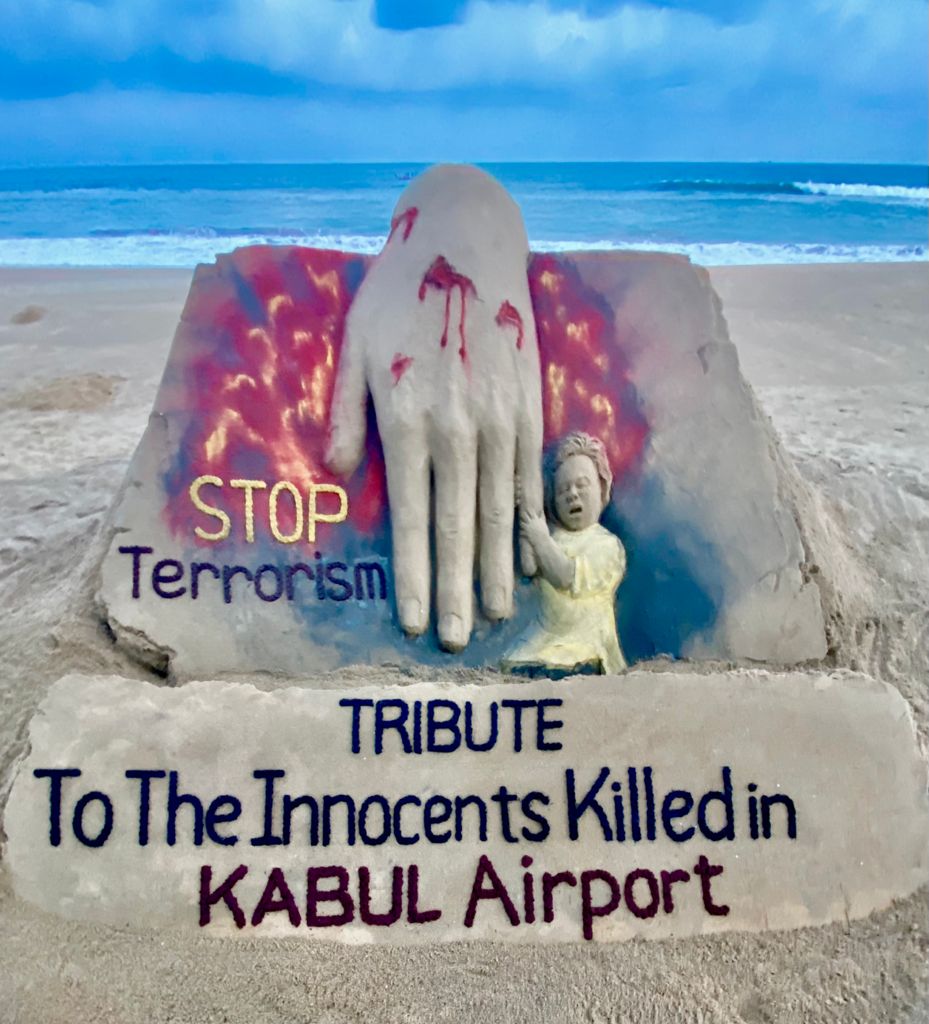 କାବୁଲ ଏୟାର ପୋର୍ଟରେ ISIS ପକ୍ଷରୁ ଆତ୍ମଘାତୀ ବିସ୍ଫୋରଣରେ ଶତାଧିକ ଲୋକ ମୃତ୍ୟୁବରଣ କରିବା ସମଗ୍ର ବିଶ୍ୱବାସୀଙ୍କୁ ସ୍ତବ୍ଧ କରିଦେଇଛି। ଏଭଳି ଆକ୍ରମଣକୁ ସାରା ବିଶ୍ୱରେ କଡା ନିନ୍ଦା କରାଯାଇଛି। ଏହି ପ୍ରସଙ୍ଗରେ ମଧ୍ୟ ଆନ୍ତର୍ଜାତୀୟ ବାଲୁକା ଶିଳ୍ପୀ ପଦ୍ମଶ୍ରୀ ସୁଦର୍ଶନ ପଟ୍ଟନାୟକ ଗଭୀର ଦୁଃଖ ପ୍ରକାଶ କରିଛନ୍ତି। ଏ ନେଇ ପୁରୀ ବେଳାଭୂମିରେ ଏକ ବାଲୁକା ଚିତ୍ରକଳା କରି ମୃତକଙ୍କୁ ଶ୍ରଦ୍ଧାଞ୍ଜଳି ଦେଇଛନ୍ତି ସୁଦର୍ଶନ ।