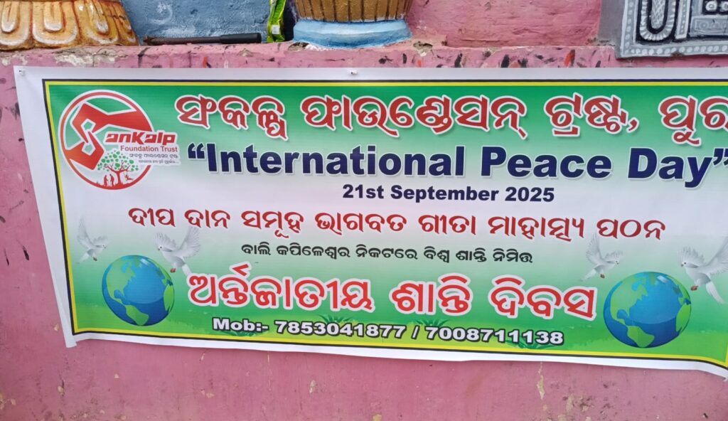 ସଂକଳ୍ପ ଫାଉଣ୍ଡେସନ ଟ୍ରଷ୍ଟ ,ପୁରୀ ତରଫରୁ ଅଧକ୍ଷା ଶ୍ରୀମତୀ ସୁଚରିତା ପାଢିଙ୍କ ଅଧ୍ୟକ୍ଷତାରେ ଅନ୍ତର୍ଜାତୀୟ *ବିଶ୍ଵ ଶାନ୍ତି* ଦିବସ ଅନୁଷ୍ଠାନ ତରଫରୁ ମଙ୍ଗଳା ଘାଟ ବ୍ରିଜ ନିକଟ ଶ୍ରୀ ବାଲିକପିଳେଶ୍ଵର ମନ୍ଦିର ପ୍ରାଙ୍ଗଣରେ ସମୂହ ଦୀପଦାନ ସହିତ ଏକତ୍ରିତ ଶ୍ରୀମଦ ଦ୍ଭଗବତ ଗୀତା ପଠନ ଭଗବତ ଗୀତା ପୁସ୍ତକ ପ୍ରଦାନ କରାଯାଇ ଶାନ୍ତିର ବାର୍ତ୍ତା ପ୍ରଚାର କରାଯାଇଥିଲା ଏଥିରେ ଆଧ୍ୟାତ୍ମିକବିଦ୍ ଶ୍ରୀଯୁକ୍ତ ବୀରନନ୍ତ ପଣ୍ଡା, ଶୁଶ୍ରୀ ପୁଷ୍ପିତା ପଟ୍ଟନାୟକ, ଡ଼.ଶଶିକାନ୍ତ ରଥ, ହରଷ ରାଉତ ଶ୍ରୀଯୁକ୍ତ ହରିହର