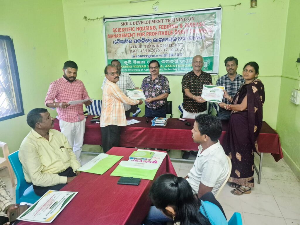 କୃଷି ବିଜ୍ଞାନ କେନ୍ଦ୍ର,ଜଗତସିଂହପୁରଠାରେ କୃଷି ବିଜ୍ଞାନ କେନ୍ଦ୍ର ଏବଂ ପ୍ରାଣୀ ସମ୍ପଦ ବିକାଶ ବିଭାଗର ମିଳିତ ଉଦ୍ୟମରେ ଗୋପାଳନ ସମ୍ବନ୍ଧରେ ଏକ ୩ ଦିନିଆ ତାଲିମ କାର୍ଯ୍ୟକ୍ରମ ଅନୁଷ୍ଠିତ ହୋଇଯାଇଛି।୧୫.୧୦.୨୦୨୫ ତାରିଖରୁ ତାଲିମ ଆରମ୍ଭ ହୋଇ ୧୭.୧୦.୨୦୨୫ ତାରିଖରେ ସଫଳ ଭାବେ ସମ୍ପନ୍ନ ହୋଇଛି। ଏହି ତାଲିମ କାର୍ଯ୍ୟକ୍ରମରେ କୁଜଙ୍ଗ ବ୍ଲକର ୨୦ଜଣ ଗୋପାଳକ ଭାଗ ନେଇଥିଲେ। ପ୍ରଥମ ଦିନ, କୃଷି ବିଜ୍ଞାନ କେନ୍ଦ୍ରର ମୁଖ୍ୟ ଡ଼ ଜୀବନଜିତ୍ ସେନ୍ କାର୍ଯ୍ୟକ୍ରମର ଶୁଭାରମ୍ଭ କରିଥିଲେ। ତାଲିମର ମହତ୍ତ୍ୱ ଏବଂ ଜିଲ୍ଲା କୃଷି ଉନ୍ନତିରେ କୃଷି ବିଜ୍ଞାନ କେନ୍ଦ୍ରର ଭୂମିକା ବିଷୟରେ ଆଲୋକପାତ କରିଥିଲେ। କୁଜଙ୍ଗ ବ୍ଲକ ପ୍ରାଣୀ ଚିକିତ୍ସା ଅଧିକାରୀ-ଡ଼ ଜୟପ୍ରକାଶ ଭଞ୍ଜ ଗୋପାଳନରେ ଡାଇରି ଫାର୍ମରେ ଦୌନଦିନ ଚର୍ଚ୍ଚା ଏବଂ ଉନ୍ନତ ଗାଈ ବାଛିବାର ବିଭିନ୍ନ ପନ୍ଥା ବିଷୟରେ ଗୋପାଳକ ମାନଙ୍କୁ ଶିକ୍ଷା ପ୍ରଦାନ କରିଥିଲେ। ପ୍ରାଣୀ ବିଜ୍ଞାନୀ-ଡ଼ ତପନ କୁମାର ପଲାଇ, ଜିଲ୍ଲା ମୁଖ୍ୟ ପ୍ରାଣୀ ଚିକିତ୍ସାଧିକାରୀ-ଡ଼ ଅଜୟ କୁମାର ସାହୁ, ସହକାରୀ ଜିଲ୍ଲା ପ୍ରାଣୀ ସମ୍ପଦ ଅଧିକାରୀ-ଡ଼ ଯଦୁନାଥ ପରିଡା ଏବଂ ଉପଖଣ୍ଡ ପ୍ରାଣୀ ଚିକିତ୍ସା ଅଧିକାରୀ-ଡ଼ ଶଶାଙ୍କ ଶେଖର ନାୟକ ଗୋପାଳନର ବିଭିନ୍ନ ପ୍ରସଙ୍ଗ ଉପରେ ଚାଷୀମାନଙ୍କୁ ଅବଗତ କରାଇଥିଲେ। ବିଭିନ୍ନ ପ୍ରସଙ୍ଗ ଯଥା:- ଗୁହାଳ ପରିଚାଳନା, ଖାଦ୍ୟ ପରିଚାଳନା, ସ୍ବାସ୍ଥ୍ୟ ପରିଚାଳନା, ଦୁଗ୍ଧ ବିକ୍ରି, ଦୁଗ୍ଧ ପ୍ରକ୍ରିୟାକରଣ,ସରକାରୀ ଯୋଜନା ଆଦି ବିଷୟରେ ଭାଗନେଇଥିବା ଚାଷୀ ମାନଙ୍କୁ ଜ୍ଞାନ ପ୍ରଦାନ କରାଯାଇଥିଲା।ତାଲିମ୍ ଦିତୀୟ ଦିନରେ ଗୋପାଳକ ମାନେ କୃଷ୍ଣାନନ୍ଦପୁର ସ୍ଥିତ ମାତାଶ୍ରୀ ଡାଏରୀ ଫାର୍ମ ପରିଦର୍ଶନରେ ଯାଇଥିଲେ। ଫାର୍ମରେ ଡ଼ ଦୁର୍ଗାପ୍ରସାଦ ମିଶ୍ର ସହକାରୀ ପ୍ରାଣୀ ଚିକିତ୍ସକ, ତୁଲଙ୍ଗ ସମସ୍ତ ଚାଷୀଙ୍କୁ ଫାର୍ମର ଦୌନଦିନ ଚର୍ଚ୍ଚା ବିଷୟରେ ବୁଝାଇଥିଲେ। ପ୍ରାଣୀ ଚିକିତ୍ସକ ପ୍ରଶିକ୍ଷଣ ଅନୁଷ୍ଠାନ, ଭୁବନେଶ୍ୱରରୁ ତାଲିମ୍ ପରିଦର୍ଶନ କରିବା ନିମନ୍ତେ ଡ଼ ଦୟାନିଧି ବେହେରା, ସହକାରୀ ନିର୍ଦ୍ଦେଶକ ୧୬.୧୦.୨୦୨୫ ରେ କୃଷି ବିଜ୍ଞାନ କେନ୍ଦ୍ରରେ ପହଞ୍ଚି ଗୋପାଳକ ମାନଙ୍କୁ ଉତ୍ସାହିକ କରିବା ତାଙ୍କ ସହ ଫାର୍ମ ପରିଦର୍ଶନରେ ଯାଇ ମାର୍ଗଦର୍ଶନ କରାଇଥିଲେ। ଶେଷ ଦିବସରେ ଭାଗନେଇଥିବା ଗୋପାଳକ ମାନଙ୍କୁ ମାନପତ୍ର ବିତରଣ କରାଯାଇଥିଲା।ଅନ୍ୟମାନଙ୍କ ମଧ୍ୟରେ ବୈଜ୍ଞାନିକ ଦେବାଶିଷ ପଣ୍ଡା,ଡ଼. ପ୍ରଦୀପ୍ତ ମାଝୀ ଡ଼. ଦ୍ୱାରିକା ମୋହନ ଦାସ, ସସ୍ମିତା ପୁରୋହିତ ,ସରିତା ଦାସ ସହଯୋଗ କରିଥିଲେ।