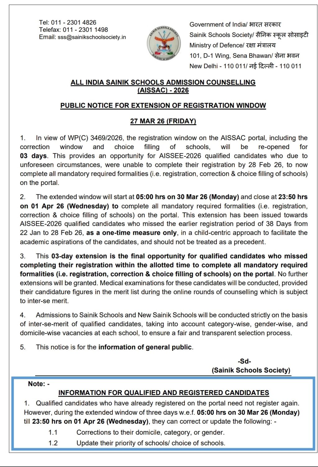 ଅତିରିକ୍ତ ୩ ଦିନ ପାଇଁ ଖୋଲିବ ସୈନିକ ସ୍କୁଲ୍ ନାମଲେଖା କାଉନସେଲିଂ ପୋର୍ଟାଲ l ଏଆଇଏସଏସଏସି-୨୦୨୬ରେ ଯୋଗ୍ୟତା ହାସଲ କରିଥିବା ଛାତ୍ରଛାତ୍ରୀଙ୍କୁ ଆଉ ଥରେ ମିଳିବ ପଞ୍ଜିକରଣ ସୁଯୋଗଭୁବନେଶ୍ୱର, ୨୮ ମାର୍ଚ୍ଚସର୍ବଭାରତୀୟ ସୈନିକ ସ୍କୁଲ୍ ନାମଲେଖା କାଉନସେଲିଂ (ଏଆଇଏସଏସଏସି) ପୋର୍ଟାଲରେ ପଞ୍ଜିକରଣ ୱିଣ୍ଡୋକୁ ଆଉ ୩ ଦିନ ଖୋଲିବାକୁ ନିଷ୍ପତ୍ତି ନିଆଯାଇଛି। ଏହାଦ୍ୱାରା ଅନିର୍ବାର୍ଯ୍ୟ କାରଣ ବଶତଃ ୨୮ ଫେବୃଆରୀ ସୁଦ୍ଧା ନିଜର ପଞ୍ଜୀକରଣ ସମ୍ପୂର୍ଣ୍ଣ କରିବାରେ ସକ୍ଷମ ହୋଇନଥିବା ଏଆଇଏସଏସଏସି-୨୦୨୬ର ଯୋଗ୍ୟ ଛାତ୍ରଛାତ୍ରୀମାନେ ପଞ୍ଜୀକରଣ, ସଂଶୋଧନ ଏବଂ ସ୍କୁଲ୍ ଚୟନ ଭଳି ସମସ୍ତ ଆବଶ୍ୟକ ବାଧ୍ୟତାମୂଳକ ପ୍ରକ୍ରିୟା ସମ୍ପୂର୍ଣ୍ଣ କରିପାରିବେ। ଏହି ୱିଣ୍ଡୋକୁ ୩୦ ମାର୍ଚ୍ଚ ୨୦୨୬ ଅପରାହ୍ଣ ୫ଟାରୁ ୧ ଏପ୍ରିଲ ୨୦୨୬ ରାତି ୧୧ଟା ୫୦ ମିନିଟ୍ ପର୍ଯ୍ୟନ୍ତ ଖୋଲା ରଖାଯିବ। ଏଆଇଏସଏସଏସି-୨୦୨୬ରେ ଯୋଗ୍ୟତା ହାସଲ କରିଥିବା ଯେଉଁ ଛାତ୍ରଛାତ୍ରୀମାନେ ୨୨ ଜାନୁଆରୀରୁ ୨୮ ଫେବୃଆରୀ ୨୦୨୬ ପର୍ଯ୍ୟନ୍ତ ୩୮ ଦିନ ମଧ୍ୟରେ ପଞ୍ଜୀକରଣ କରିପାରି ନାହାନ୍ତି ସେମାନେ ଏହି ଅତିରିକ୍ତ ତିନି ଦିନ ମଧ୍ୟରେ ସବୁ ପ୍ରକ୍ରିୟା ଶେଷ କରିବେ। କେବଳ ପିଲାମାନଙ୍କର କଲ୍ୟାଣକୁ ଦୃଷ୍ଟିରେ ରଖି ଏହି ସୁବିଧା କେବଳ ଗୋଟିଏ ଥର ପାଇଁ ଦିଆଯିବ। ଏହାବ୍ୟତୀତ କୌଣସି ଅତିରିକ୍ତ ସମ୍ପ୍ରସାରଣ ସୁବିଧା ମିଳିବ ନାହିଁ। ଅନଲାଇନ କାଉନସେଲିଂ ସମୟରେ ମେରିଟ୍ ତାଲିକାରେ ନାମ ଥିବା ପ୍ରାର୍ଥୀଙ୍କର ଆପୋସ ଯୋଗ୍ୟତା ଆଧାରରେ ମେଡ଼ିକାଲ ଯାଞ୍ଚ କରାଯିବ। ସେହିପରି ଯୋଗ୍ୟ ପ୍ରାର୍ଥୀମାନଙ୍କର ଆପୋସ ଯୋଗ୍ୟତା ଆଧାରରେ ହିଁ କେବଳ କଡ଼ାକଡ଼ି ଭାବେ ସୈନିକ ସ୍କୁଲ ଏବଂ ନୂଆ ସୈନିକ ସ୍କୁଲରେ ନାମ ଲେଖାଯିବ। ଚୟନ ପ୍ରକ୍ରିୟାକୁ ସ୍ୱଚ୍ଛ ଏବଂ ପାରଦର୍ଶୀ କରିବା ଲାଗି ବର୍ଗ, ଲିଙ୍ଗ ଏବଂ ପ୍ରତ୍ୟେକ ବିଦ୍ୟାଳୟରେ ସ୍ଥାନୀୟ କ୍ଷେତ୍ର ପାଇଁ ଖାଲିଥିବା ସିଟକୁ ଆଧାର କରି ନାମଲେଖା ହେବ ବୋଲି ସୈନିକ ସ୍କୁଲ୍ ସୋସାଇଟି ପକ୍ଷରୁ ସୂଚନା ଦିଆଯାଇଛି।