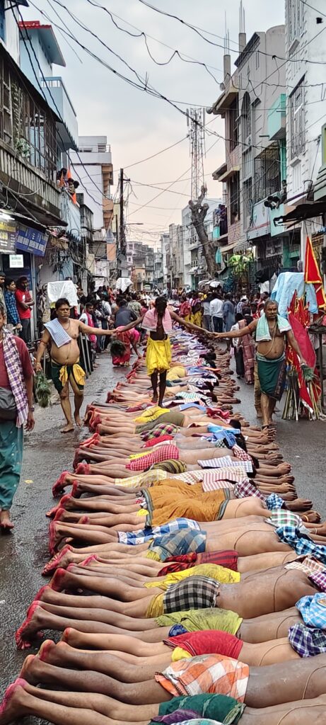 ଥିବା ଭକ୍ତ ଙ୍କ ଦାଣ୍ଡ ରେ କୁମ୍ଭ ଢାଳି ନିକଟସ୍ତ ମନ୍ଦିର ରେ ବିଶ୍ରାମ ନେଇ ମାର୍ଧ୍ୟାନ୍ନ ରେ ଧୂଳି ଦଣ୍ଡ ପରିବେଷଣ କରିଥାନ୍ତି ଖାଲି ପାଦ ରେ ଉଦୁଉଦିୟା ଖରାରେ ଧୂଳି ଦଣ୍ଡ ନୃତ୍ୟ ପରିବେଷଣ କରିଥାନ୍ତି କିନ୍ନର ମାନେ ମହିଳା ଙ୍କ ବେଶଧାରଣ କରି ଦର୍ଶକ ଙ୍କୁ ମା ଙ୍କ ସେବା ରେ ଯେଇଁ ସବୁ କାର୍ଯ୍ୟ ହେଉଛି ତାହା ନୃତ୍ୟ ମାଧ୍ୟରେ ବର୍ଣନା କରିଥାନ୍ତି ଏହା ପରେ ପାଣି ଦଣ୍ଡ ପୋଖରୀ ରେ ଝୁଣା ରେ ଅଗ୍ନି ଦଣ୍ଡ ଓ ରାତ୍ର ରେ ଦି ପ୍ରହର ରେ ଅନ୍ନ ଭୋଗ ଯାହା ଅକଟା,ଅବଟା,ମୁଗ ଡାଲି,ରେ ମା ଙ୍କୁ ସମର୍ପଣ କରି ଭୁକ୍ତା ମାନେ ମଧ୍ୟରାତ୍ର ରେ ପ୍ରସାଦ ସେବନ କରିଥାନ୍ତି ଏହା ପରେ ମାନସିକଧାରୀ ପ୍ରସାଦ ସେବନ କରିଥାନ୍ତି ରାତ୍ର ରେ ଝୁଣା ଓ ଅଗ୍ନି ଦଣ୍ଡ ରେ ମା ନାଚନ୍ତି ଓ ମନରଞ୍ଜନ ପାଇଁ ସାମାଜିକ ନାଟକ,ପୌରାଣିକ ନାଟକ ପରିବେଶଣ କରିଥାନ୍ତି।
